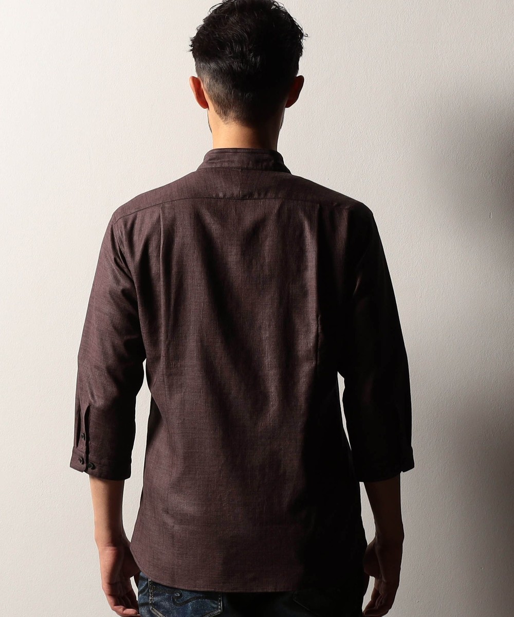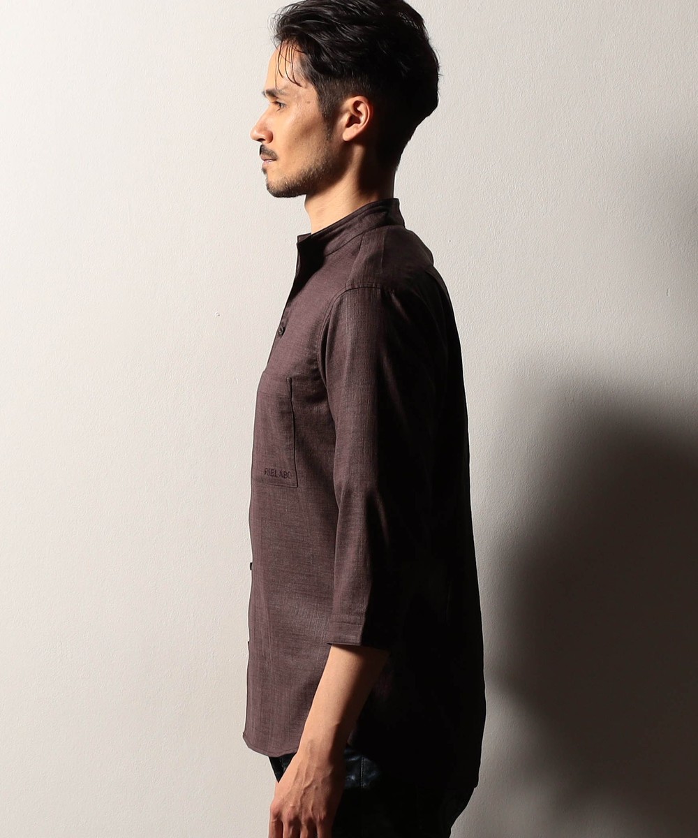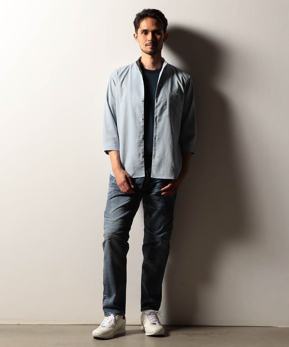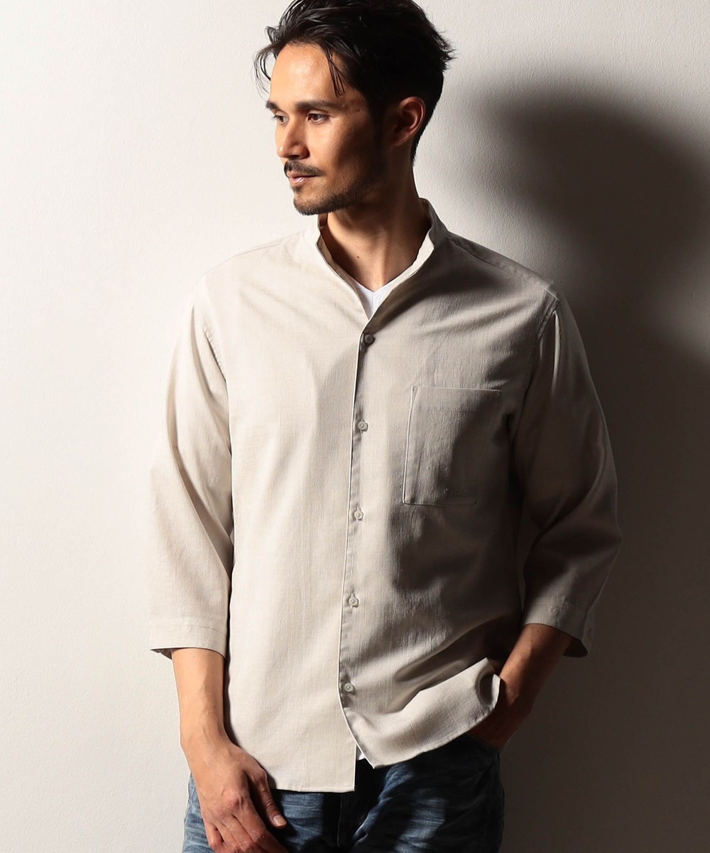 衿端にワイヤ-を仕込んだショートスタンドカラーシャツ。