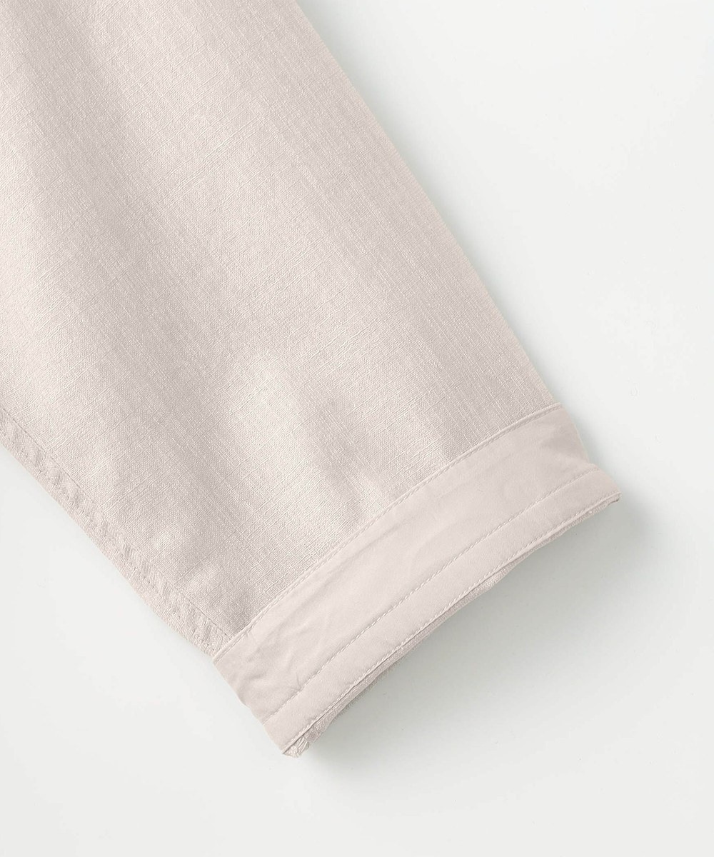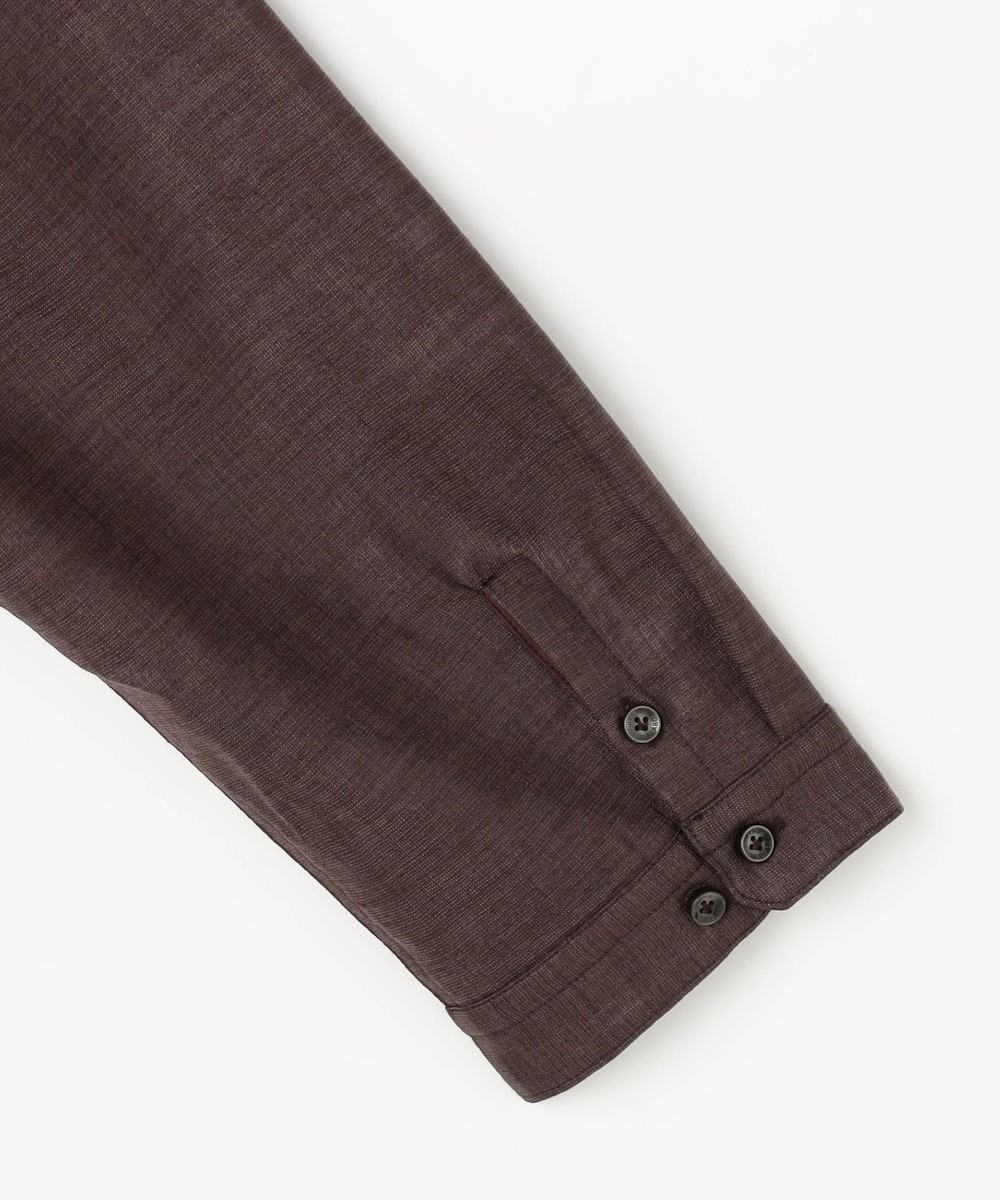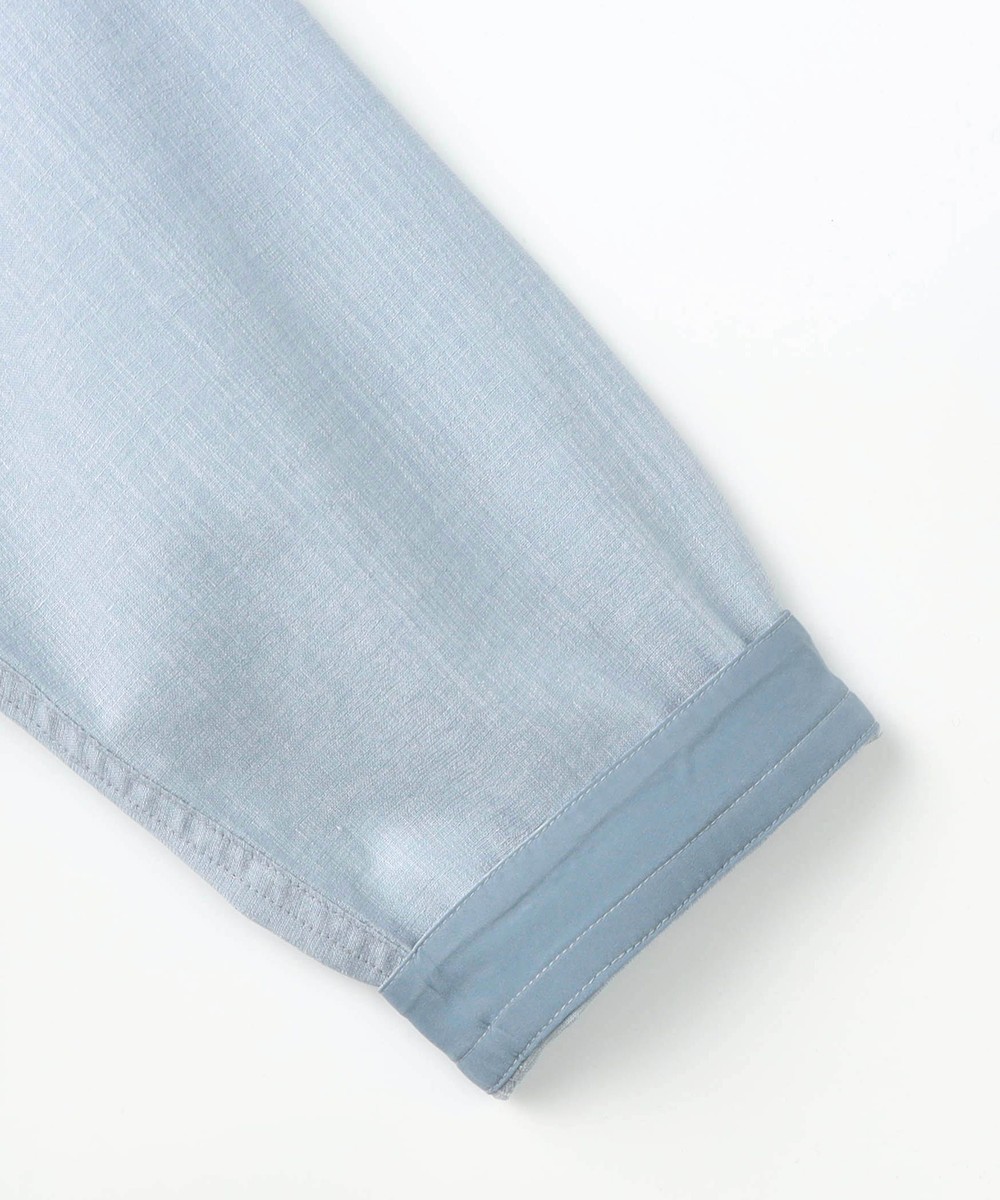 シャリ感のある風合いとストレッチ性、生地の最終仕上げでカレンダー加工とエアタンブラー加工を施す事でナチュラルな風合いと光沢感を特徴にした変わり素材です。シワになりにくく、イージーケア性も高いです。