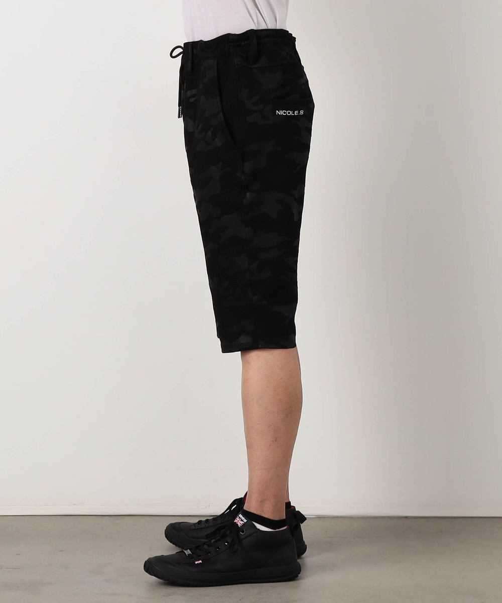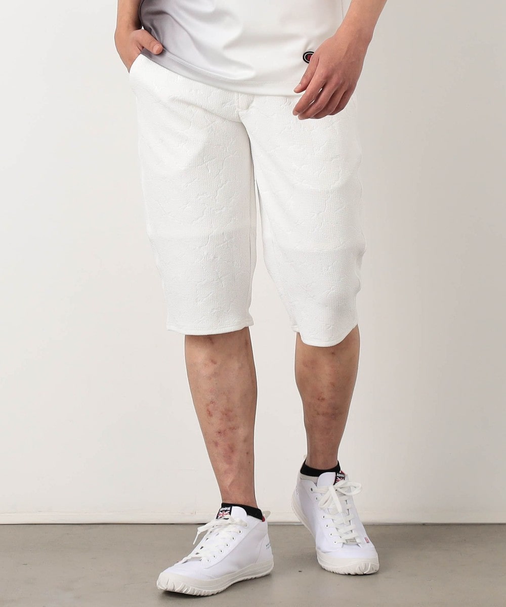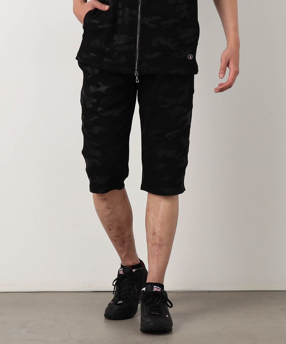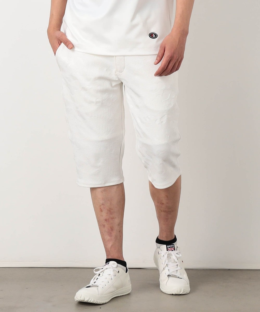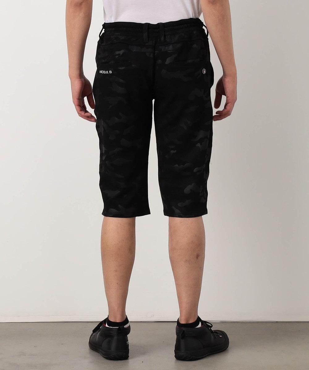 腰回りがすっきりした膝下丈で、テ-パ-ドシルエットが綺麗なハ-フパンツになります。後ベルトがゴム仕様になっているのでフィット感があり、ドローコードで腰回りを絞ることができます。