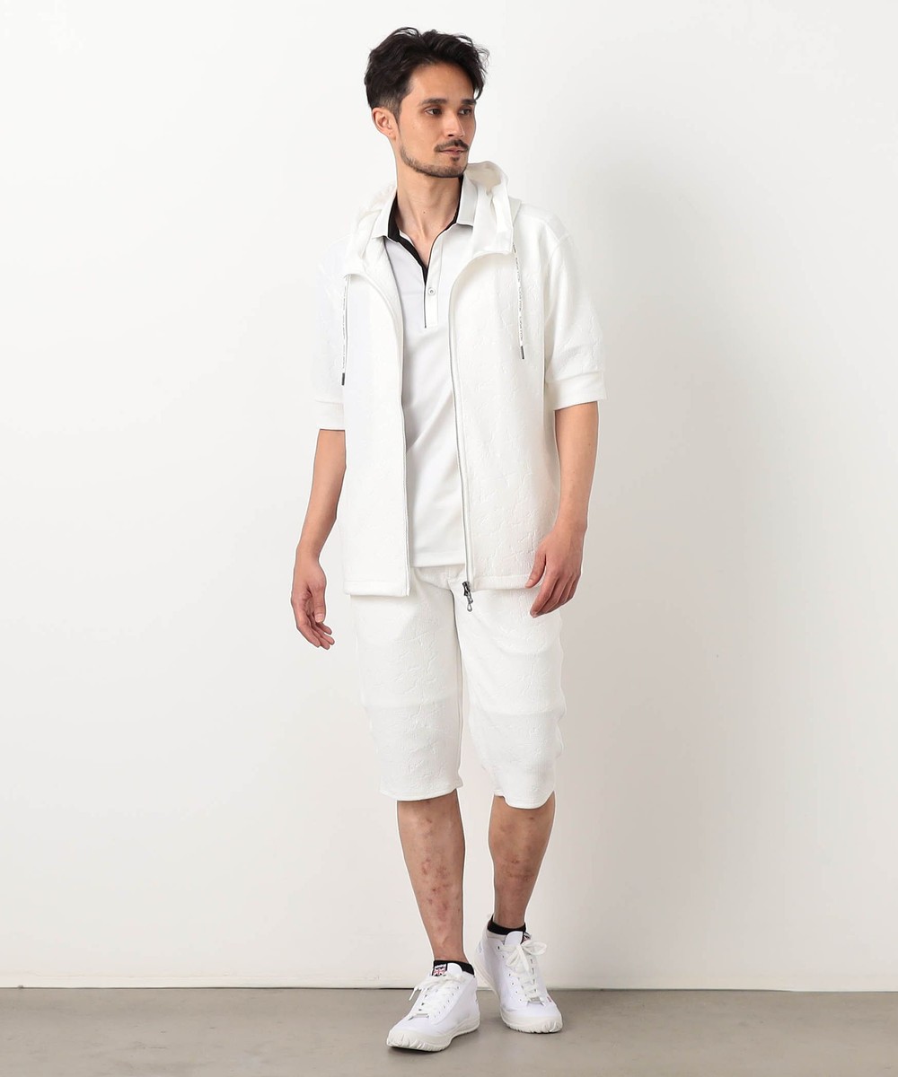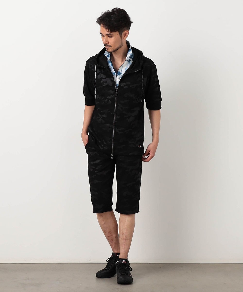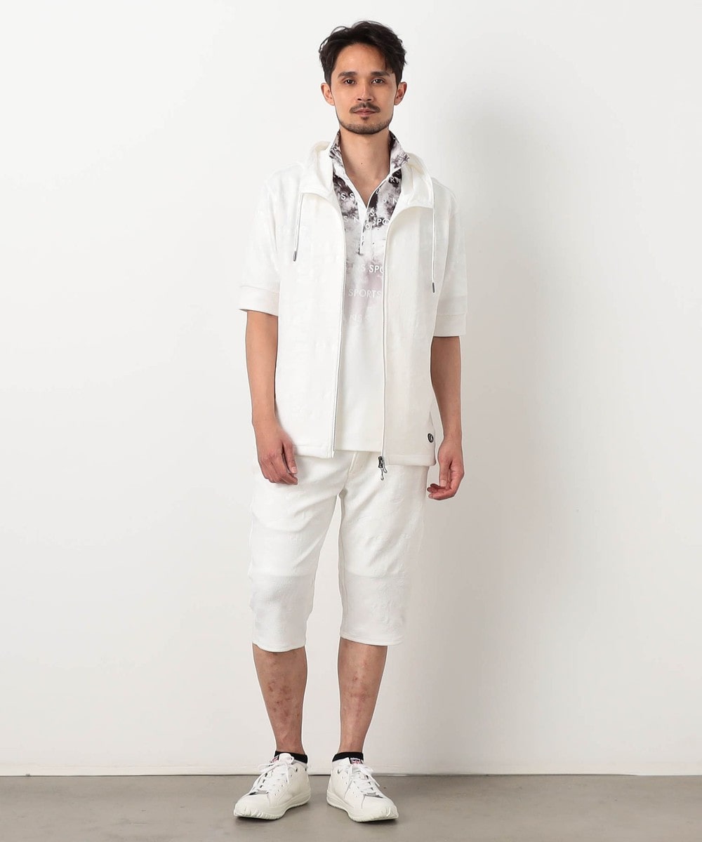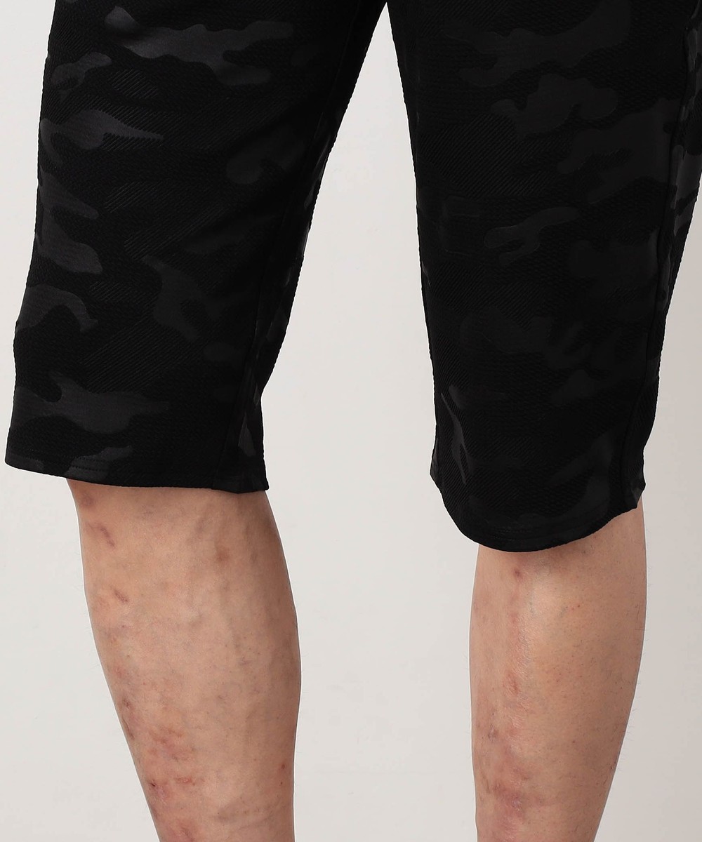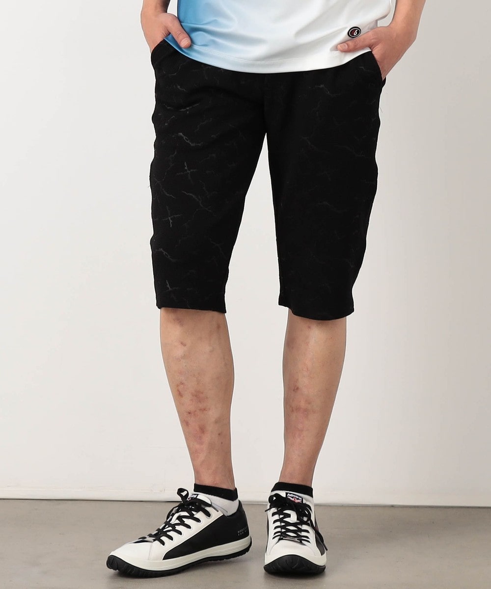 腰回りがすっきりした膝下丈で、テ-パ-ドシルエットが綺麗なハ-フパンツになります。後ベルトがゴム仕様になっているのでフィット感があり、ドローコードで腰回りを絞ることができます。