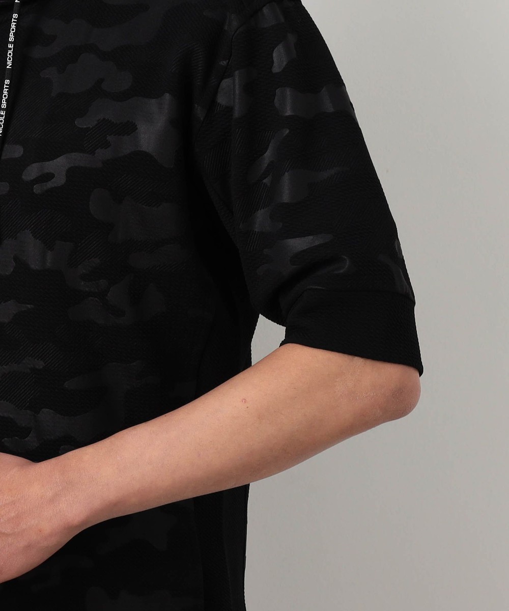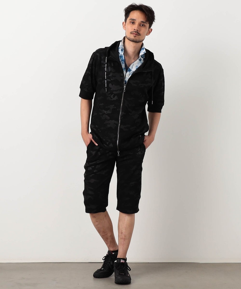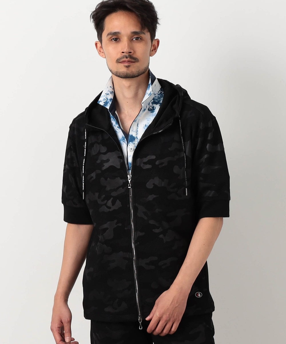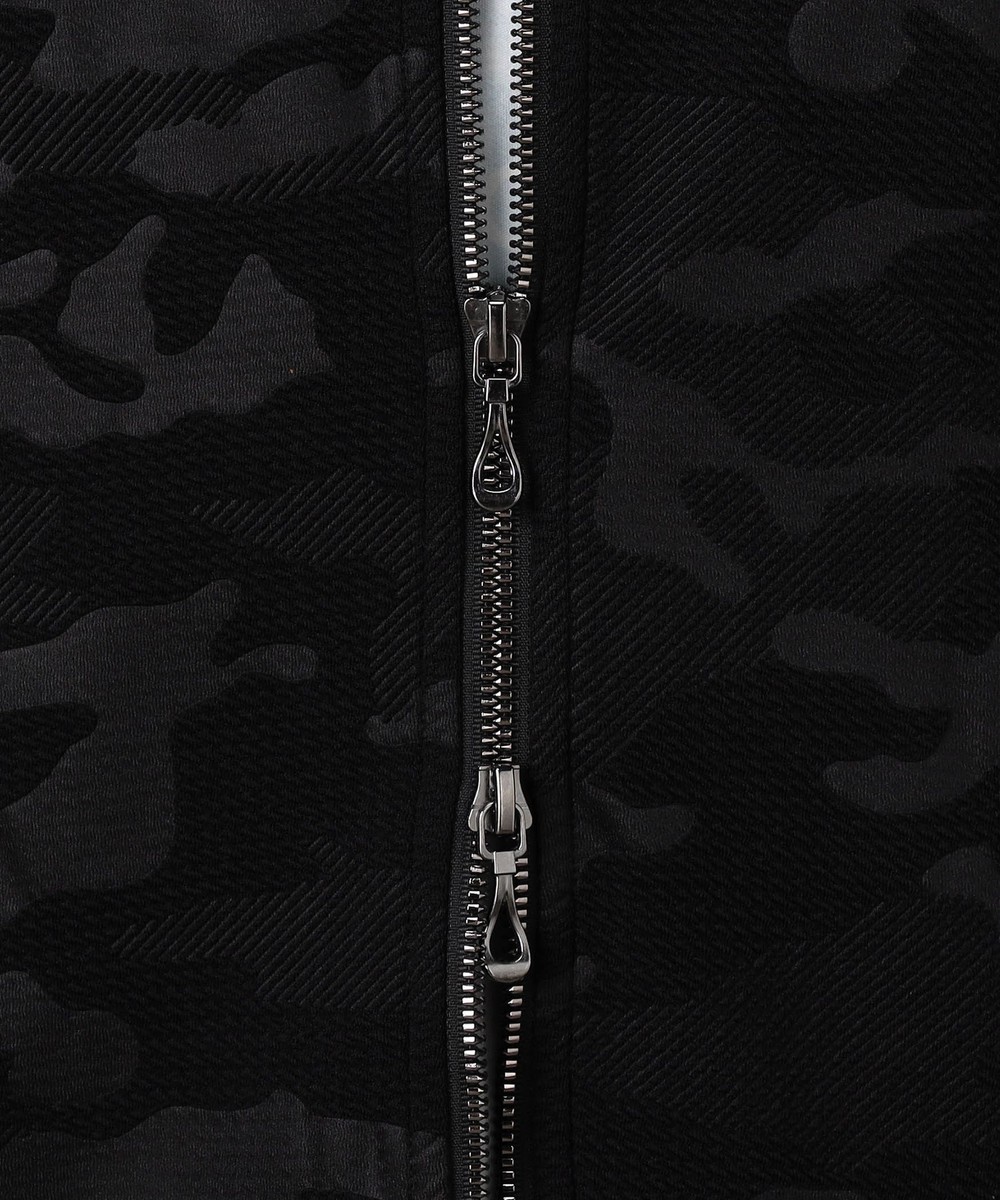 ストレッチ性のある地柄ブリスタ-ジャカ-ドをベ-スに、カモフラ柄とクラック柄をエンボス加工したオリジナル素材を使用しています。ベ-ス生地の凹凸感もプラスして表情のある仕上がりです。タテヨコのマルチストレッチ性、エアリ-な軽さとペ-パ-ライクな張り感が特徴で速乾性と防シワ性にも優れています。