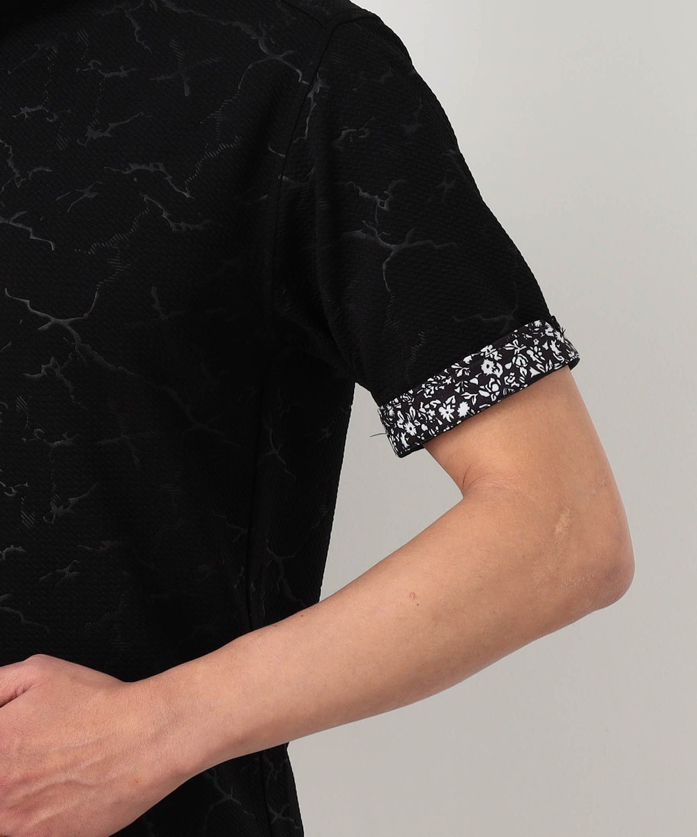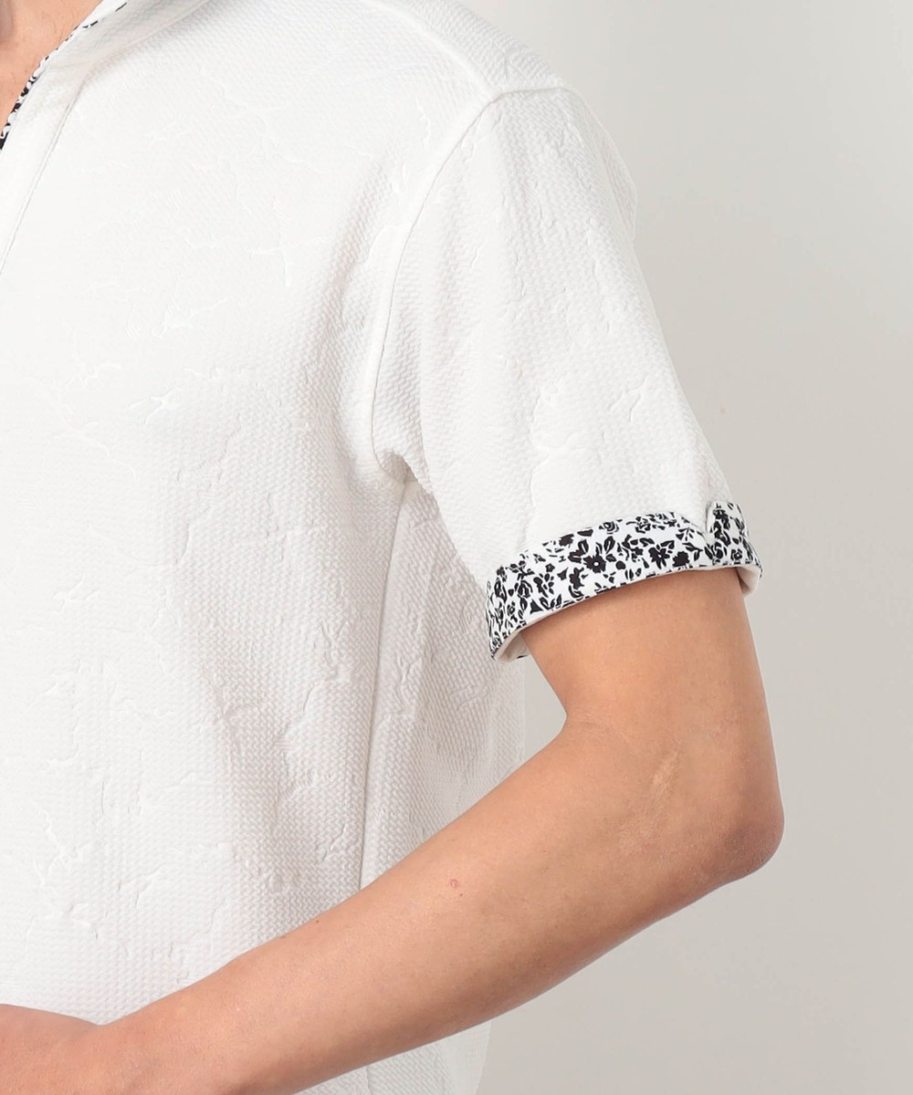張りのある素材感でスポーティに着こなせるスキッパーポロ。要所の別生地には布帛の小花プリントを使い上品なギミックをプラスしました。しっかりとした素材でスキッパーポロのポイントである前開きのVゾーンを綺麗に保ちます。衿に仕込んだワイヤー、袖口、裾のサイドスリット等、ワンライク上の仕様を随所に盛り込んだポロシャツに仕上げています。