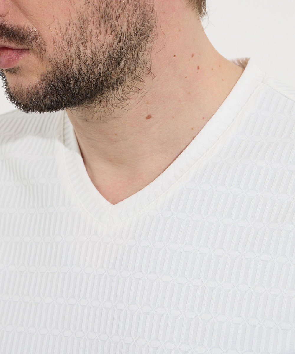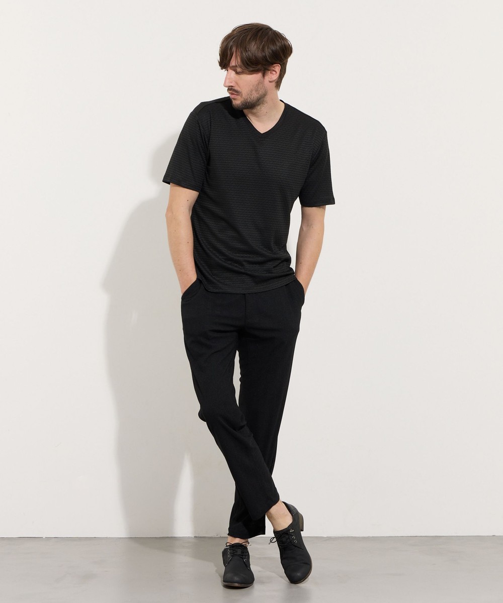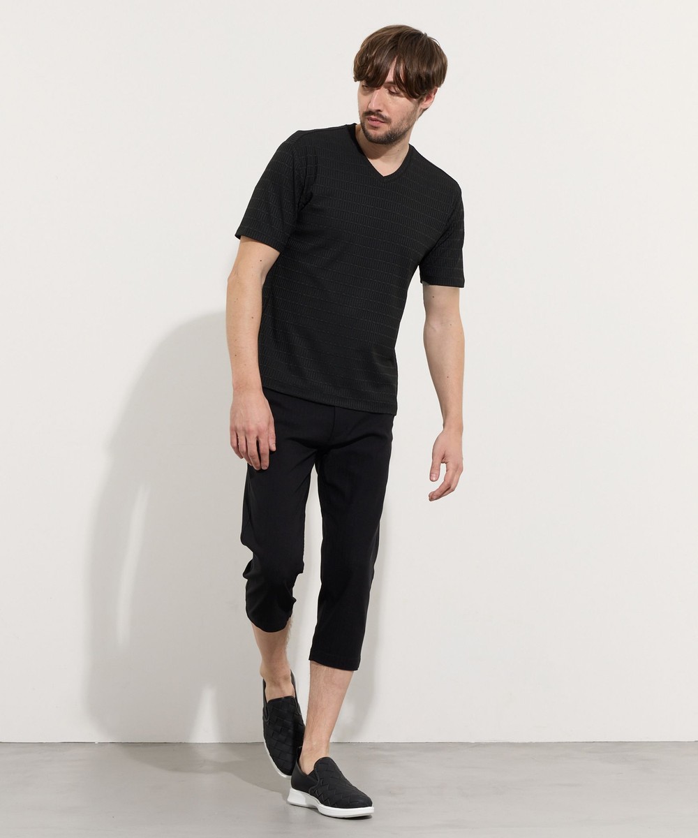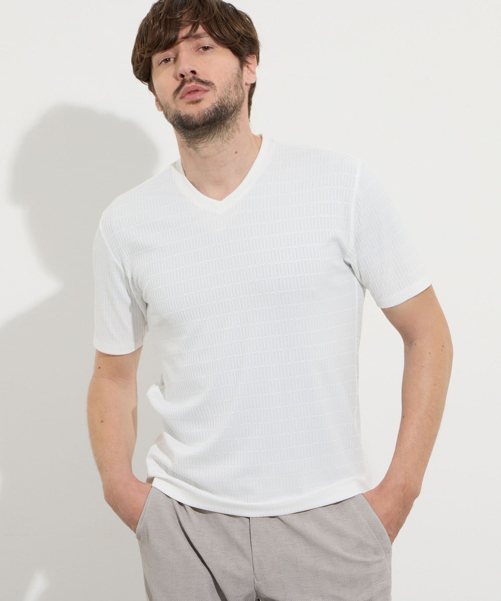 サラッとしたタッチ感と光沢のあるリンクスジャガード生地を使用した浅めのVネック半袖プルオーバーになります。