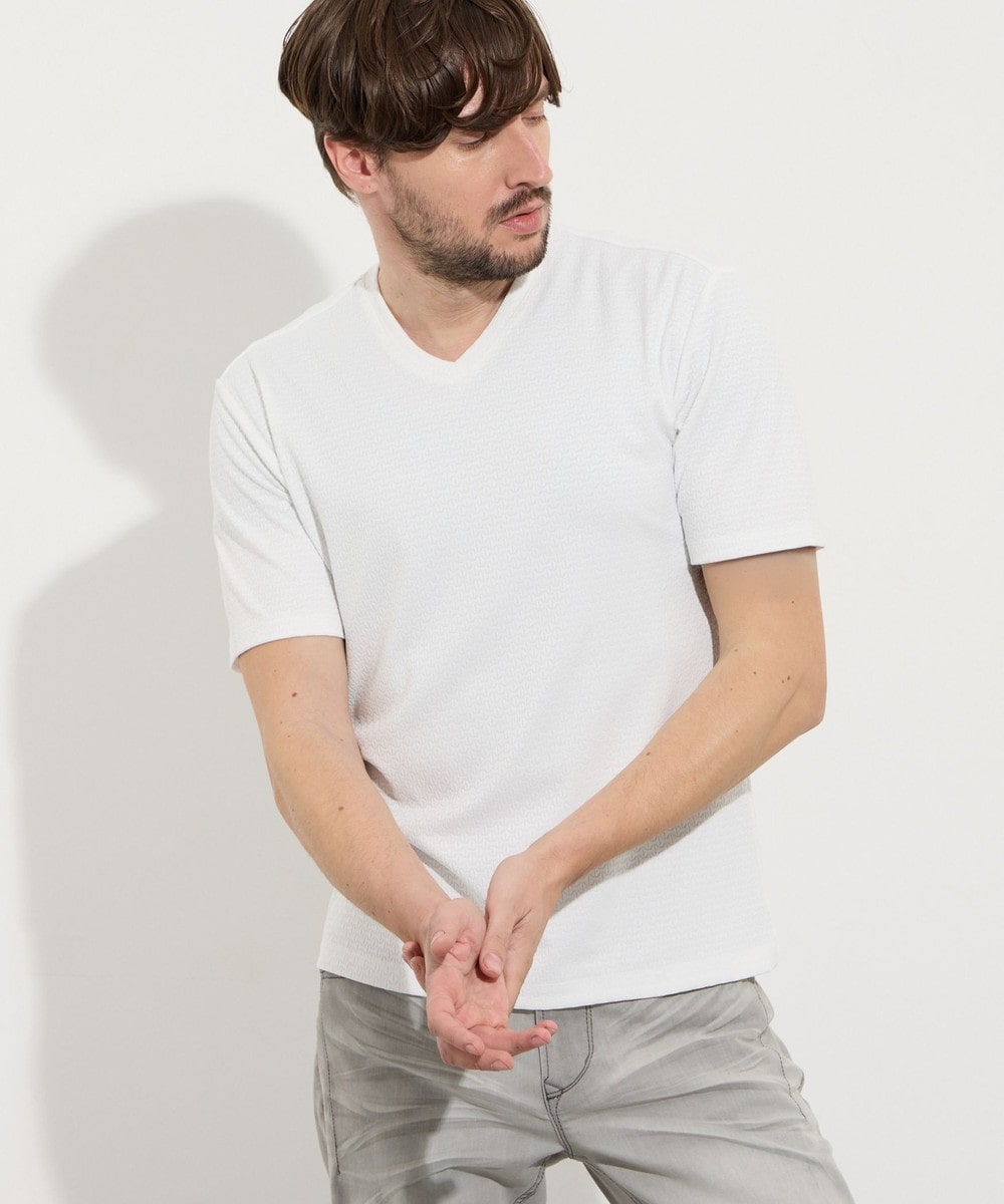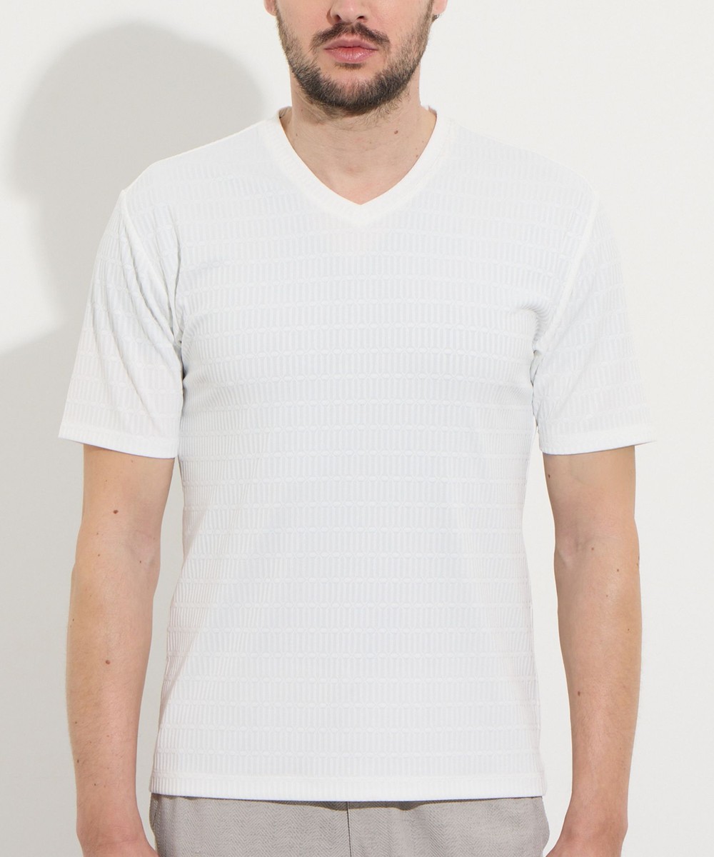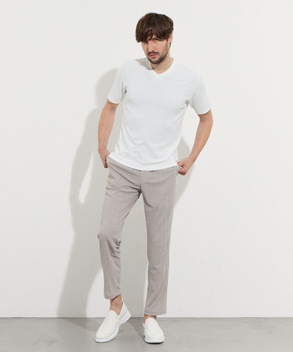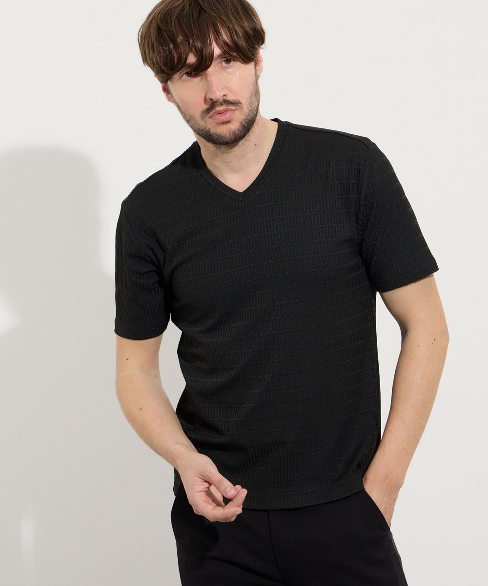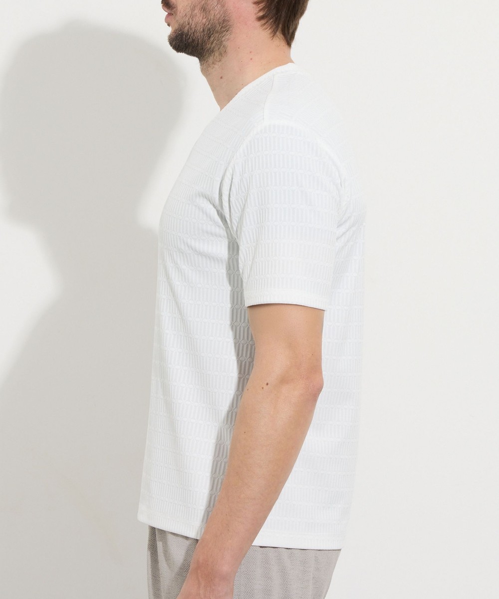 サラッとしたタッチ感と光沢のあるリンクスジャガード生地を使用した浅めのVネック半袖プルオーバーになります。