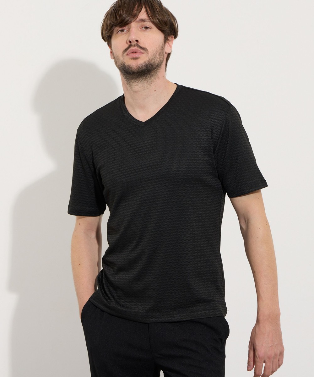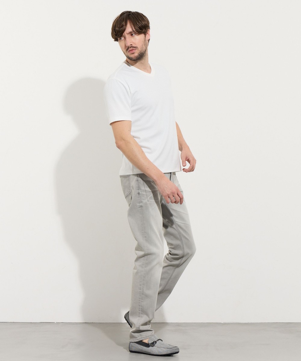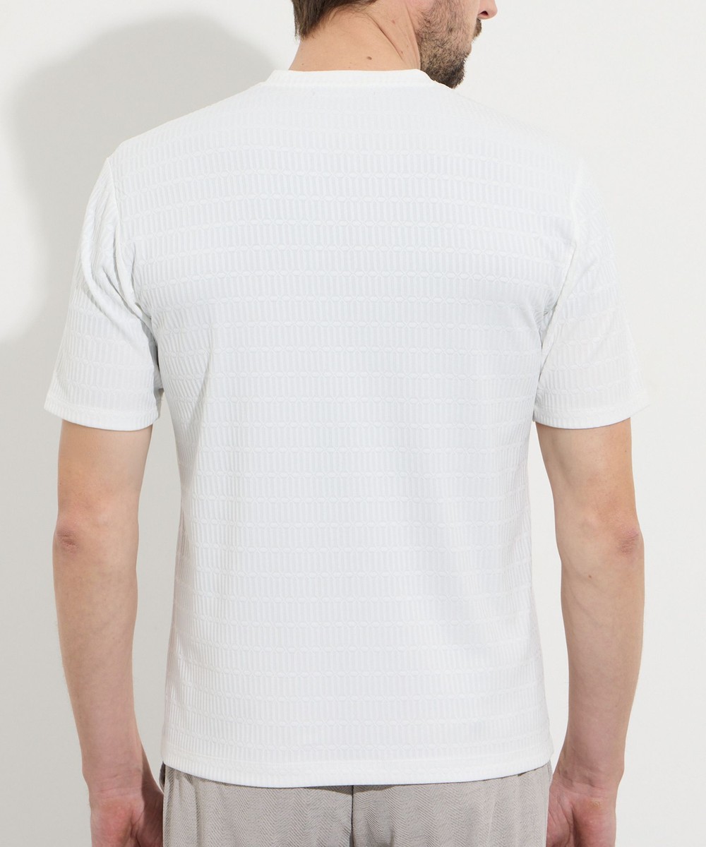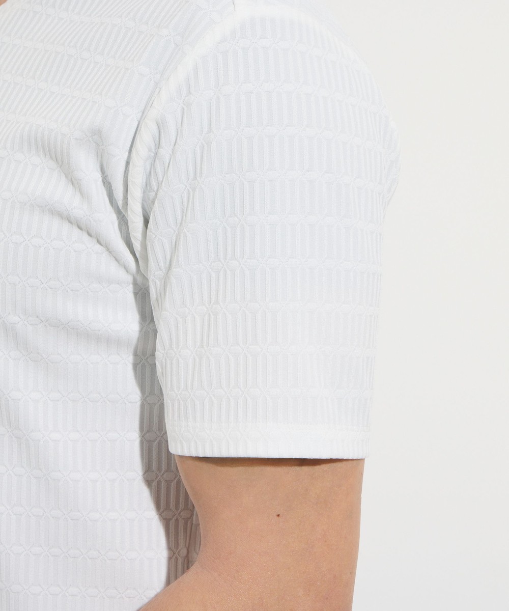 サラッとしたタッチ感と光沢のあるリンクスジャガード生地を使用した浅めのVネック半袖プルオーバーになります。