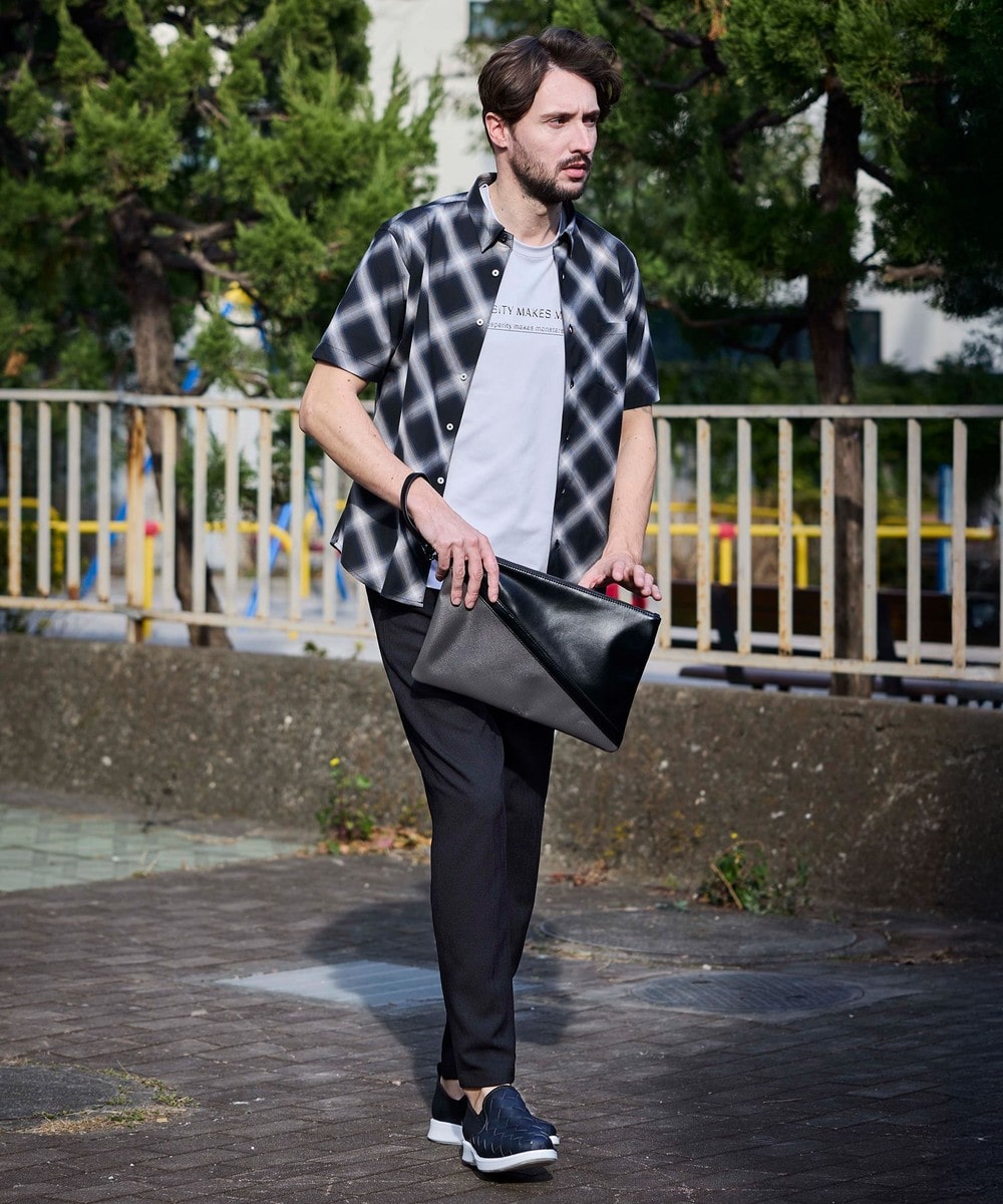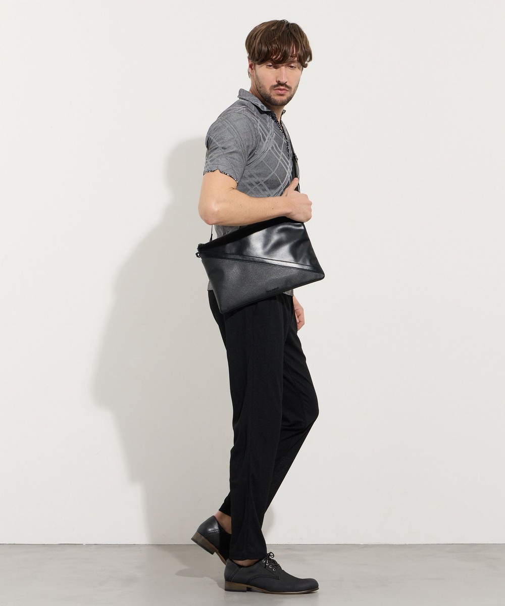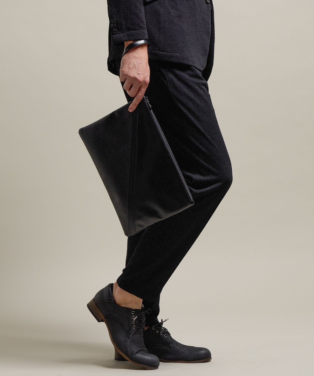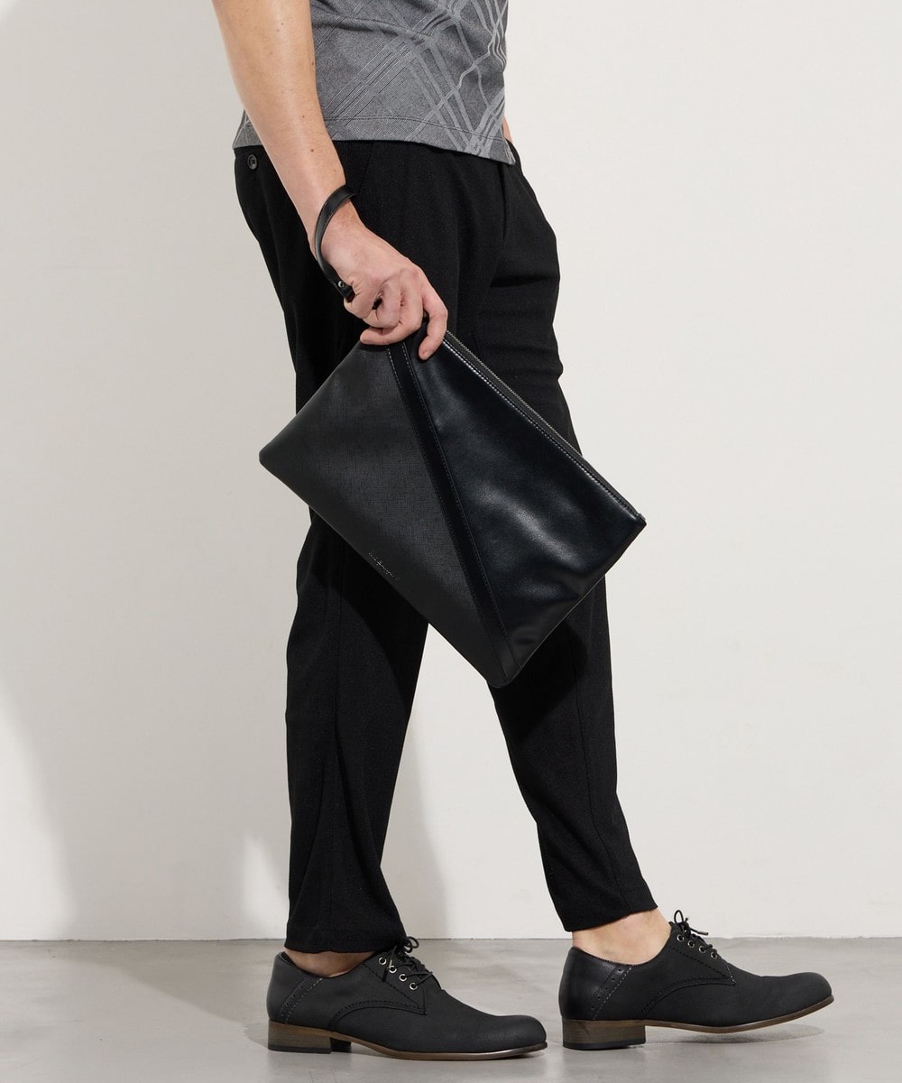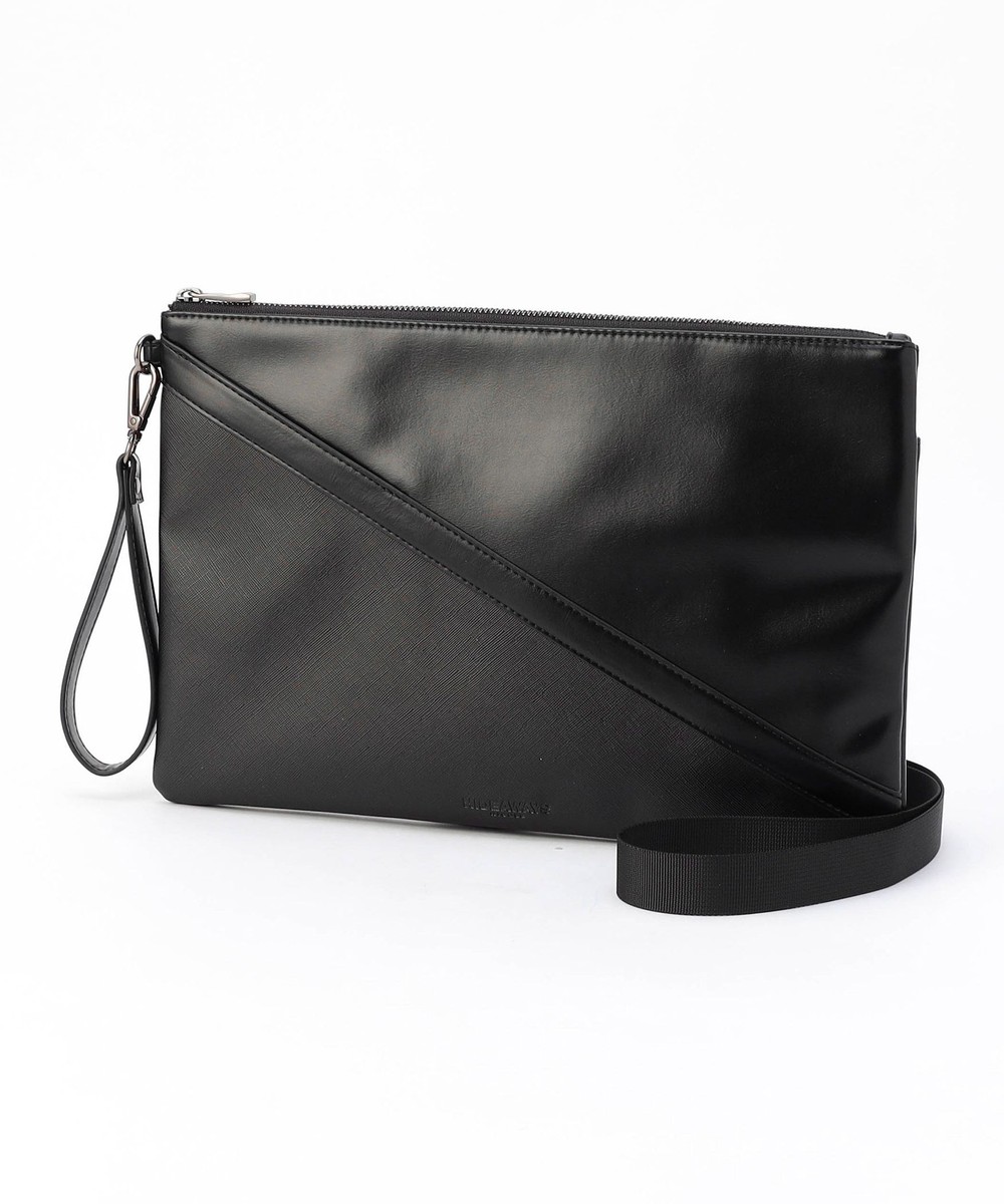 フロントの大胆なパネル切り替えデザインが印象的な、ハンドストラップ付きのクラッチバッグ。