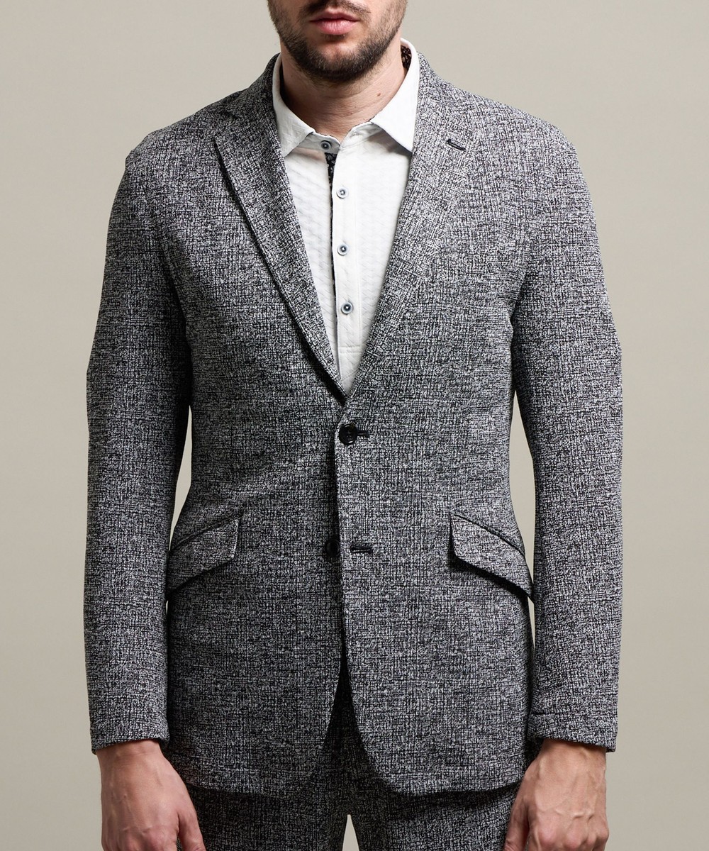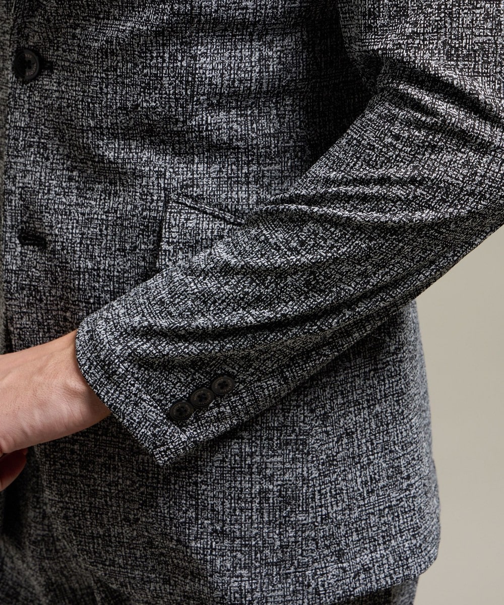 ポリエステルとポリウレタン糸を使用し、細かな幾何学柄に編んだカットソーのジャカード素材を使用。