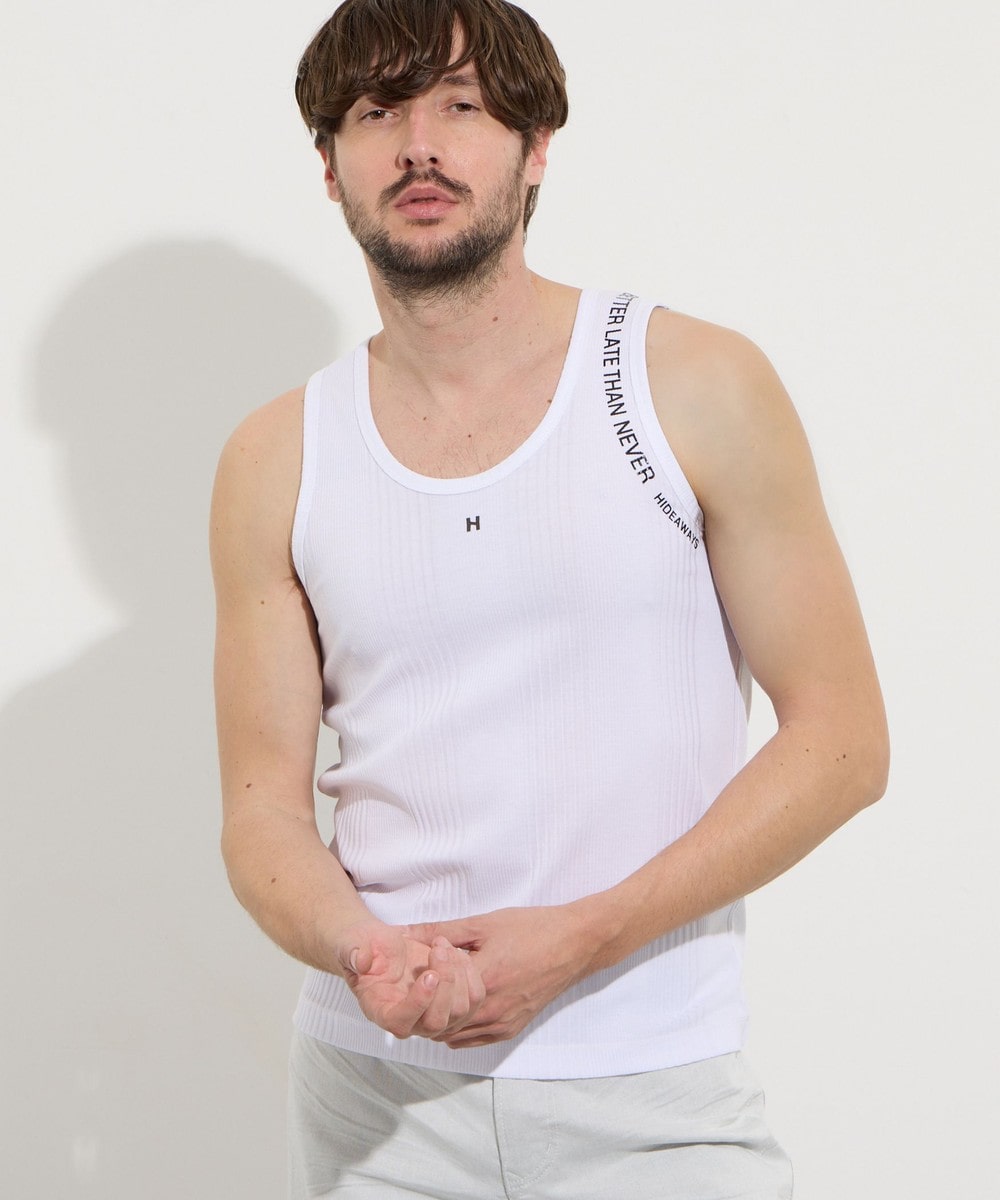 左アームホールと胸のロゴプリントがデザインポイントです。