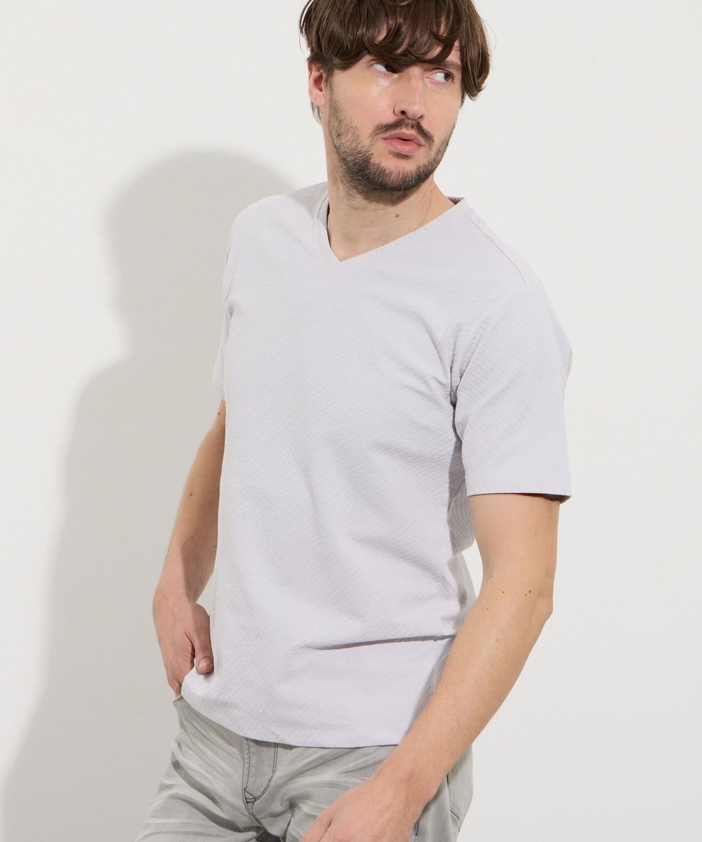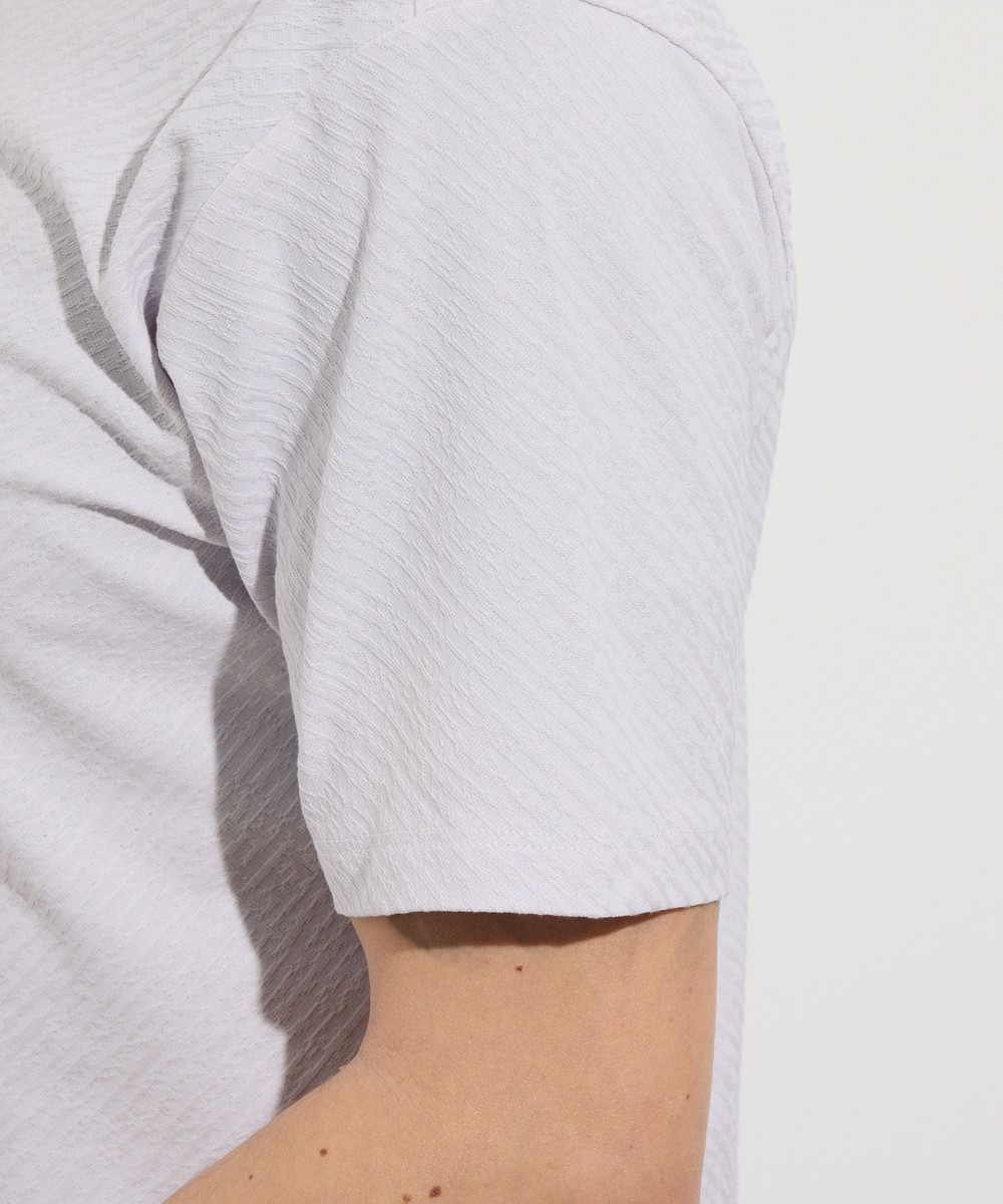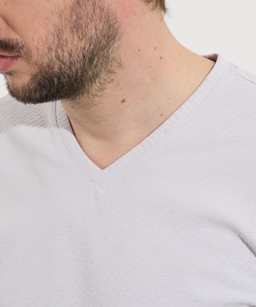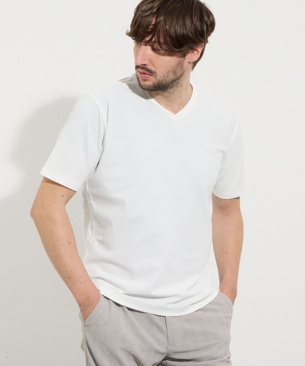 オリジナルバーク風リンクスジャカード生地をバイヤス仕様にした浅めのVネック半袖プルオーバーになります。