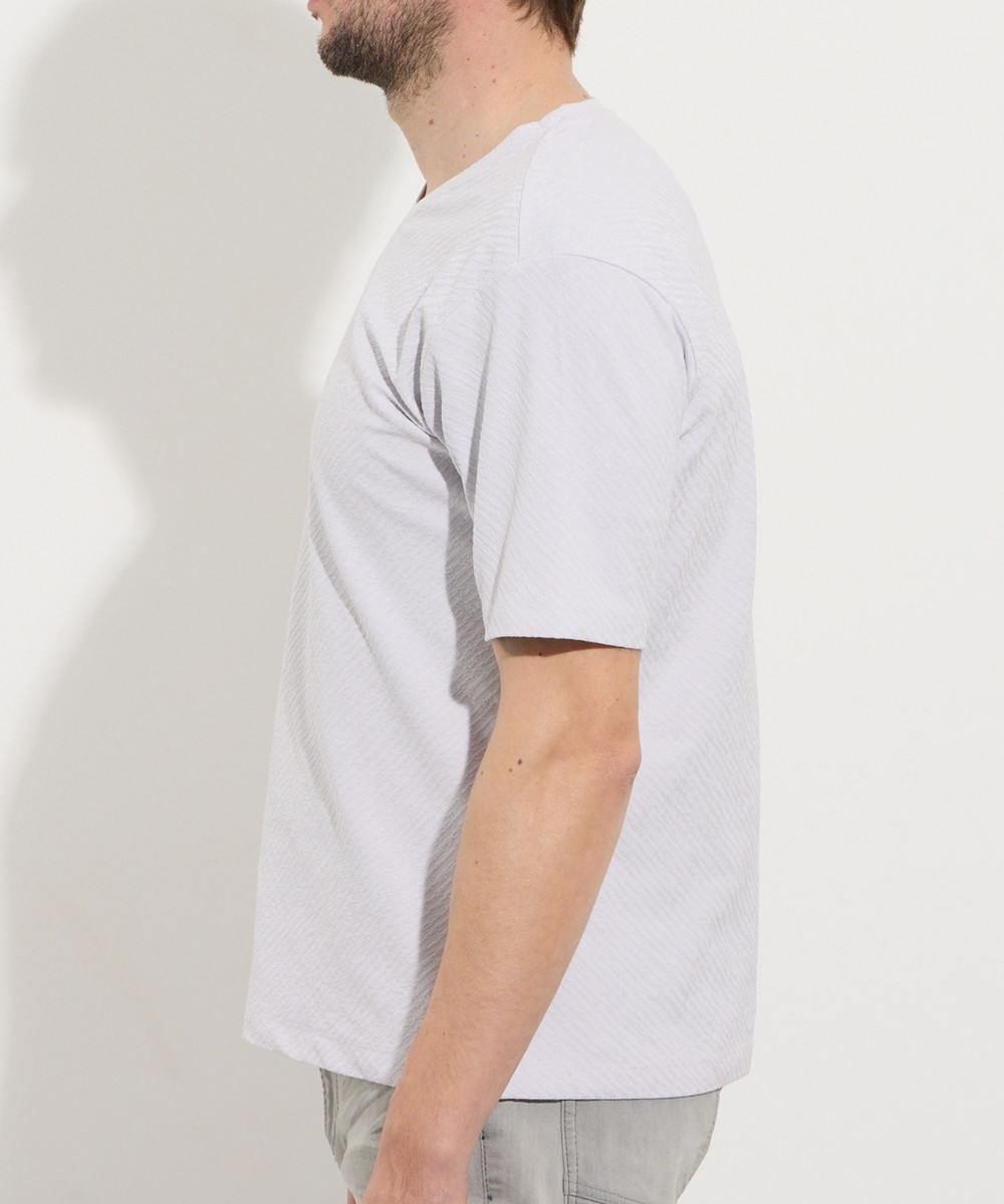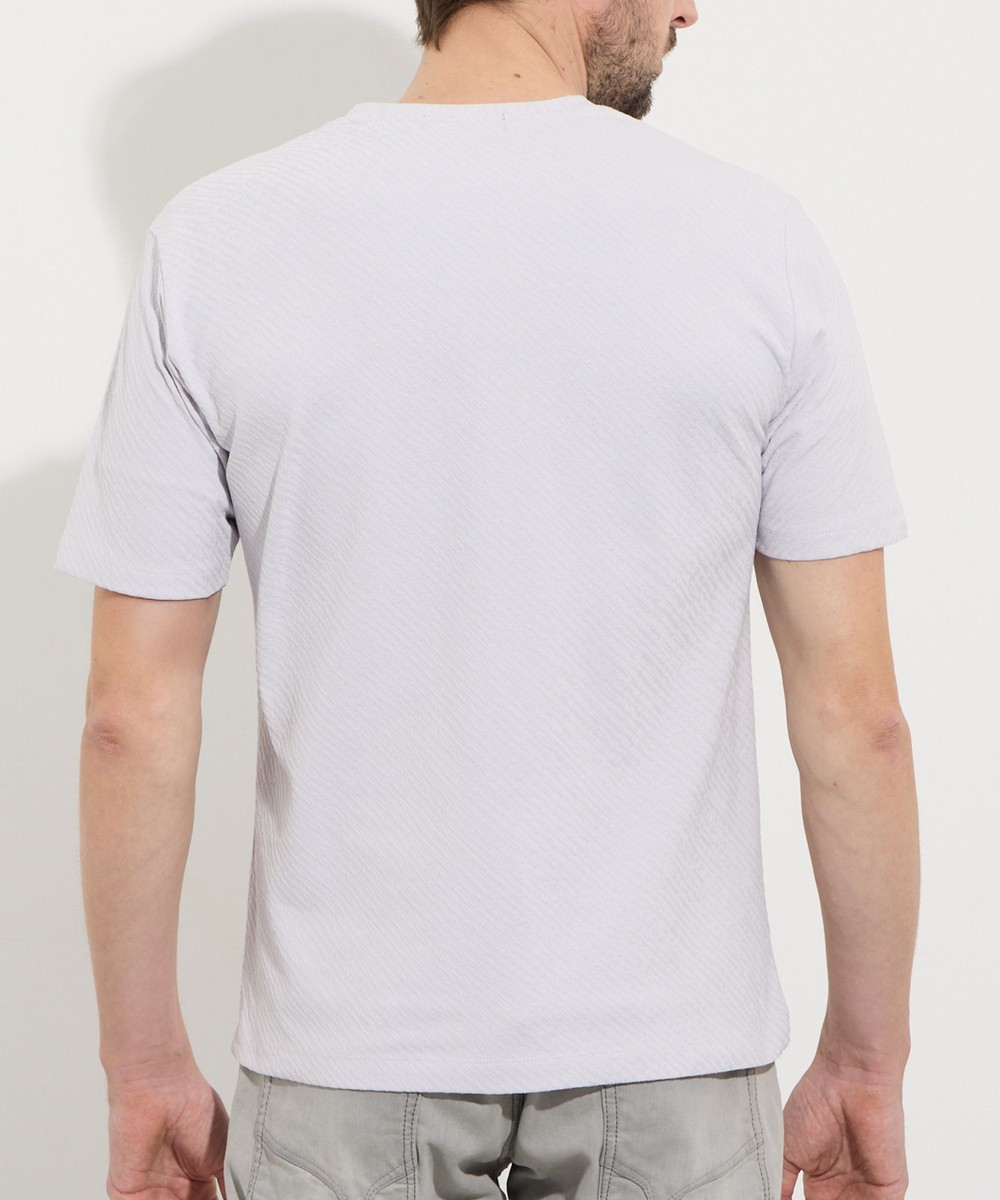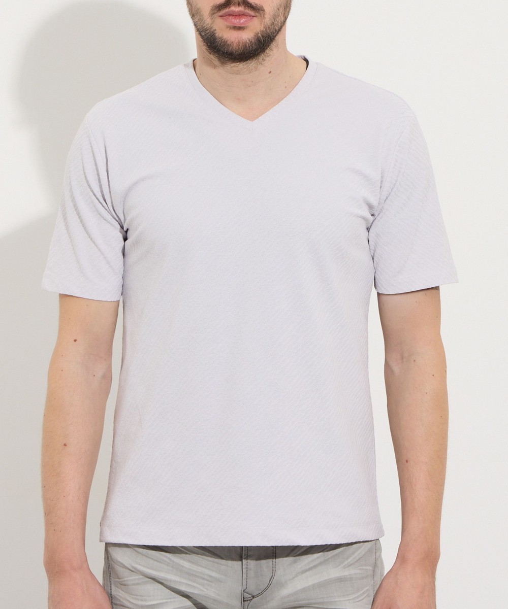 オリジナルバーク風リンクスジャカード生地をバイヤス仕様にした浅めのVネック半袖プルオーバーになります。