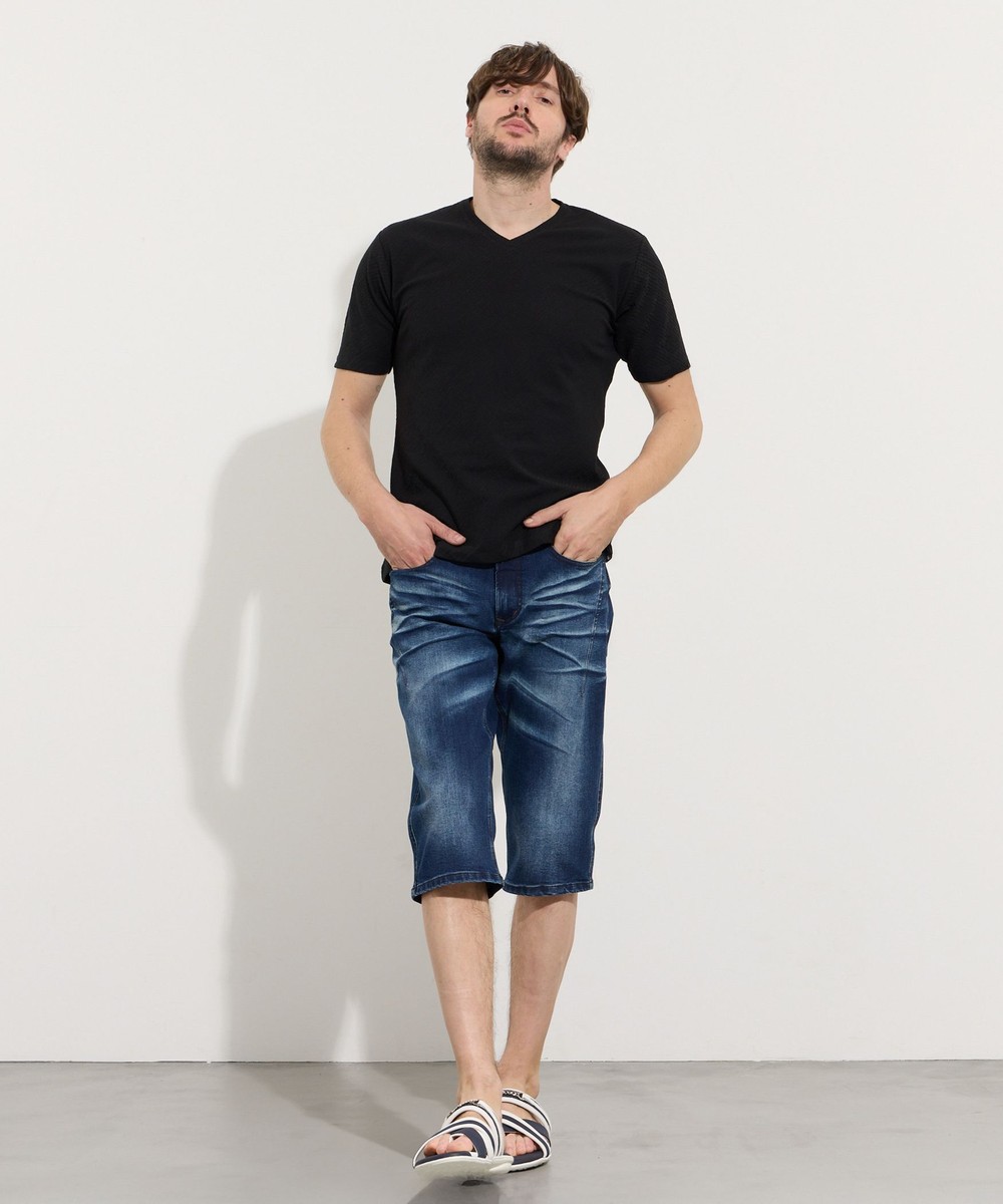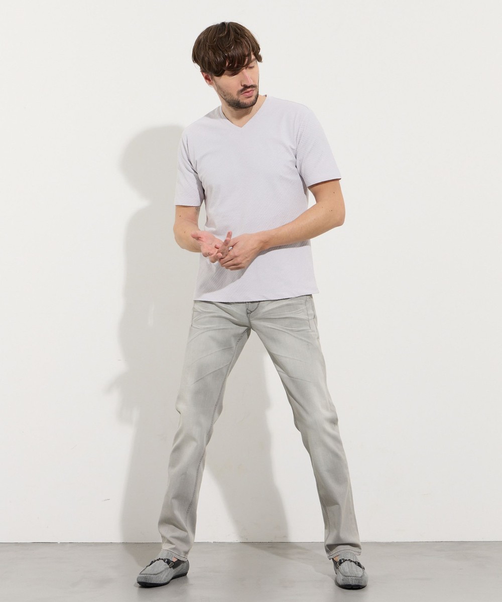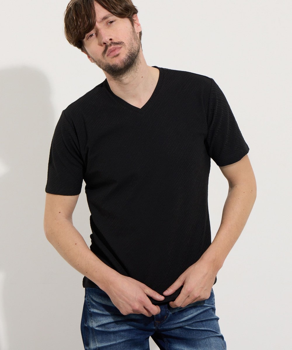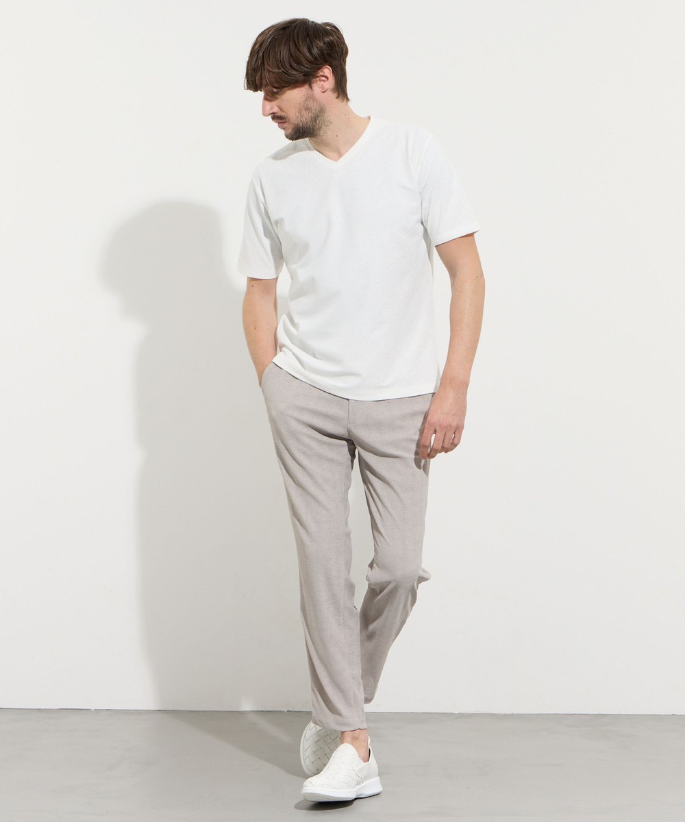 オリジナルバーク風リンクスジャカード生地をバイヤス仕様にした浅めのVネック半袖プルオーバーになります。