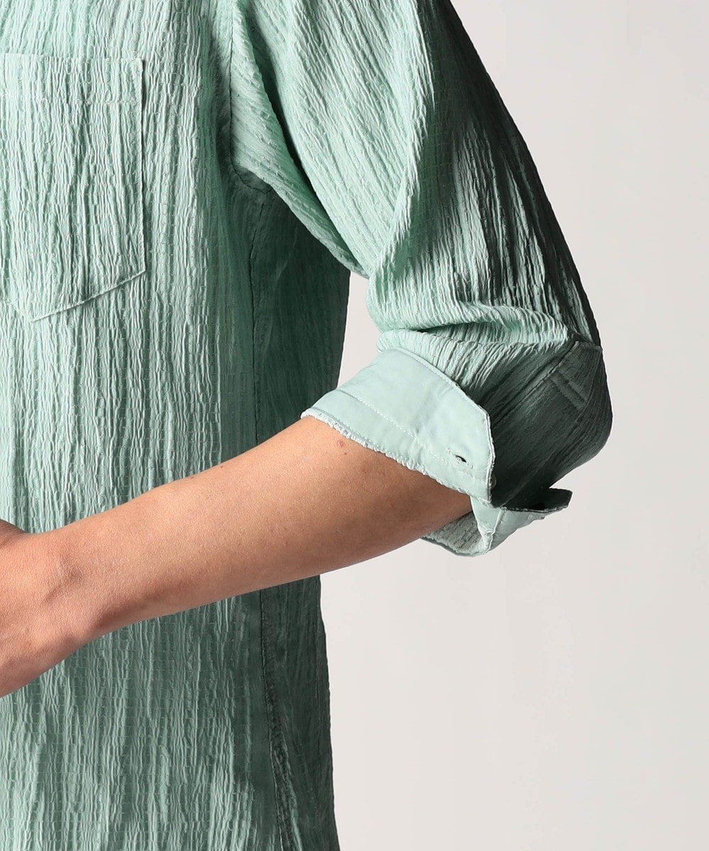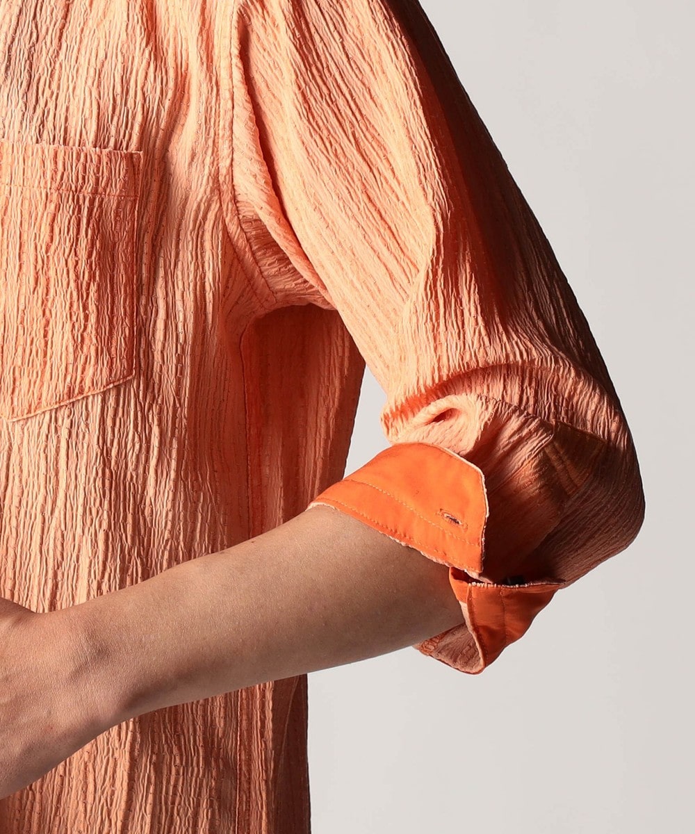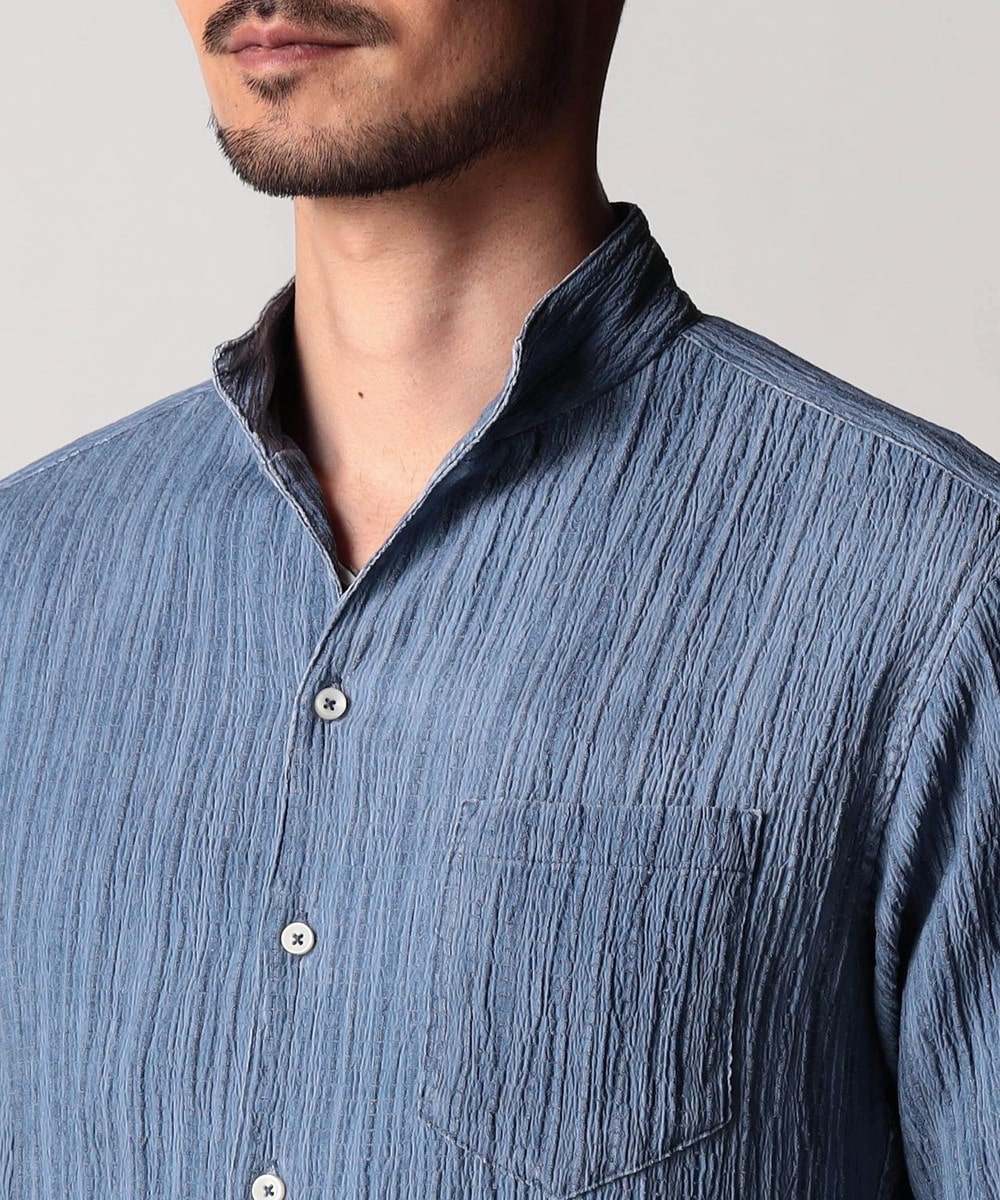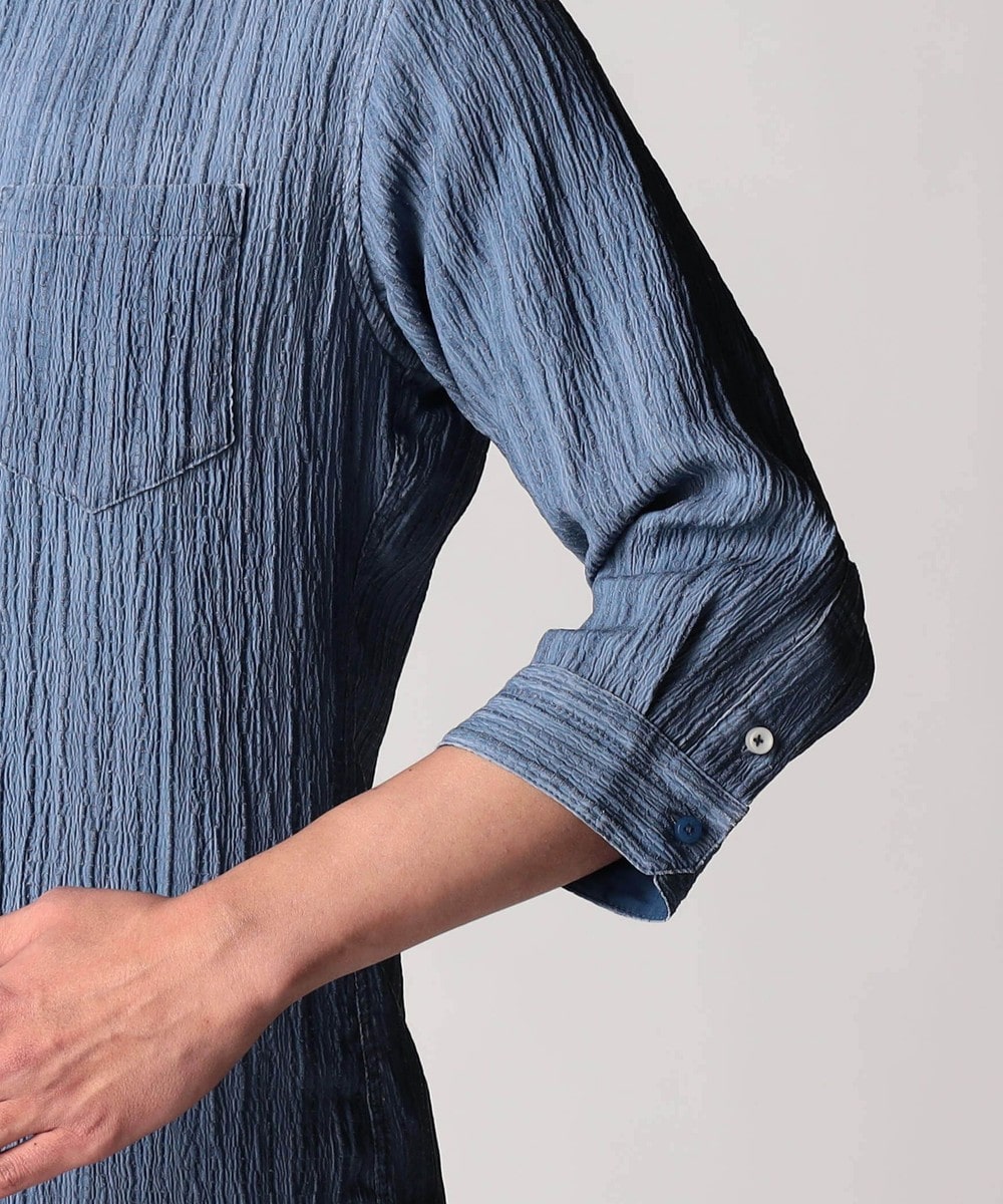 衿端にワイヤ-を仕込んだ七分袖のスタンド・イタリアンカラ-シャツ。今季は衿の高さを低くした新デザインになります。プリーツ素材の為、ボリュームがありますので、ヨーク裏やカフス裏には同色系のストレッチ裏地を採用する事で部分的な厚みを抑え、チラチラしたアクセントにしています。袖口も配色釦にして、ちょっとしたアクセントにしています。