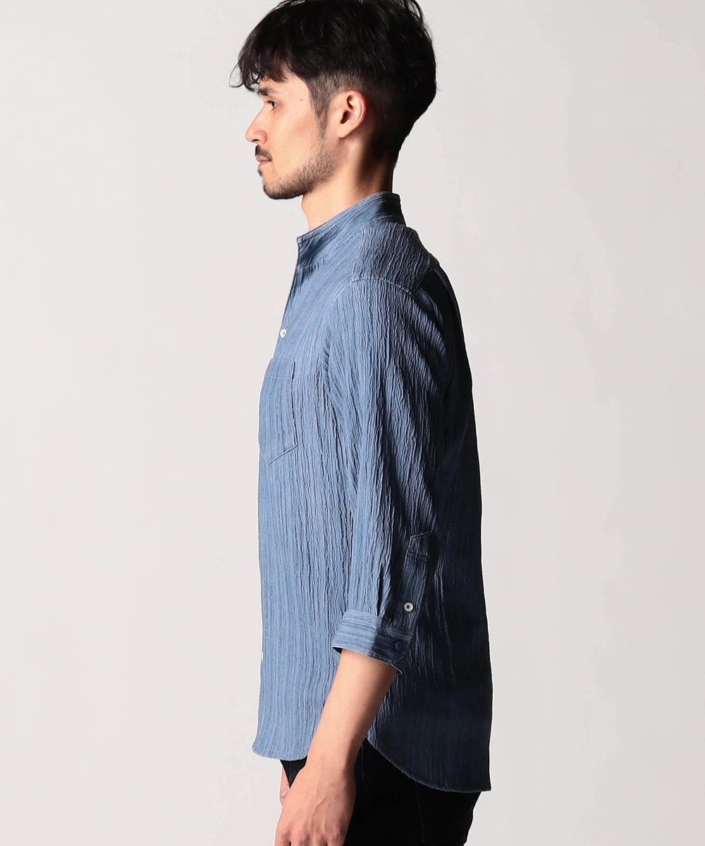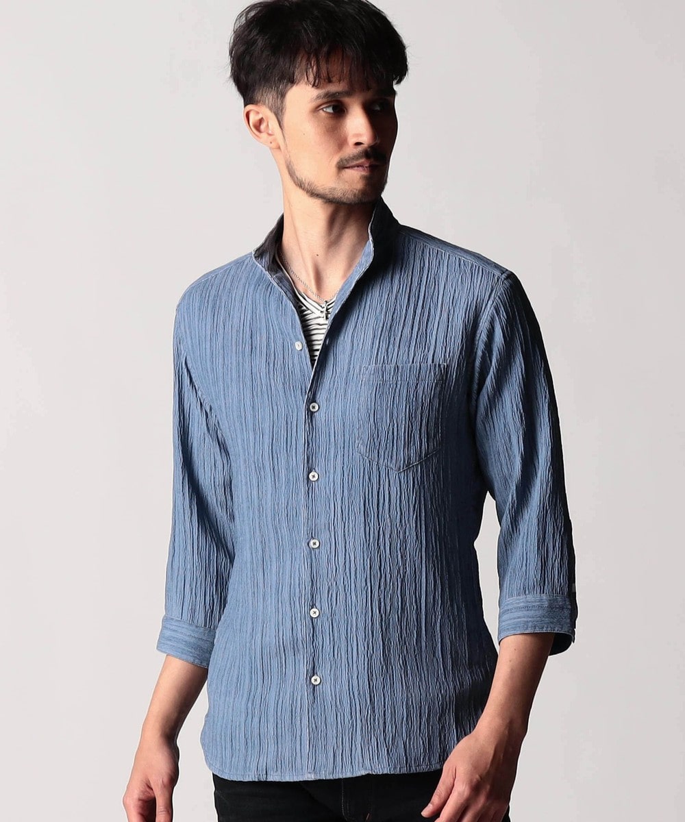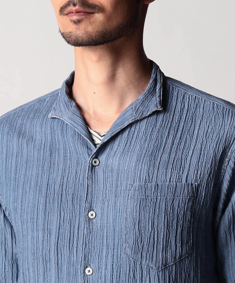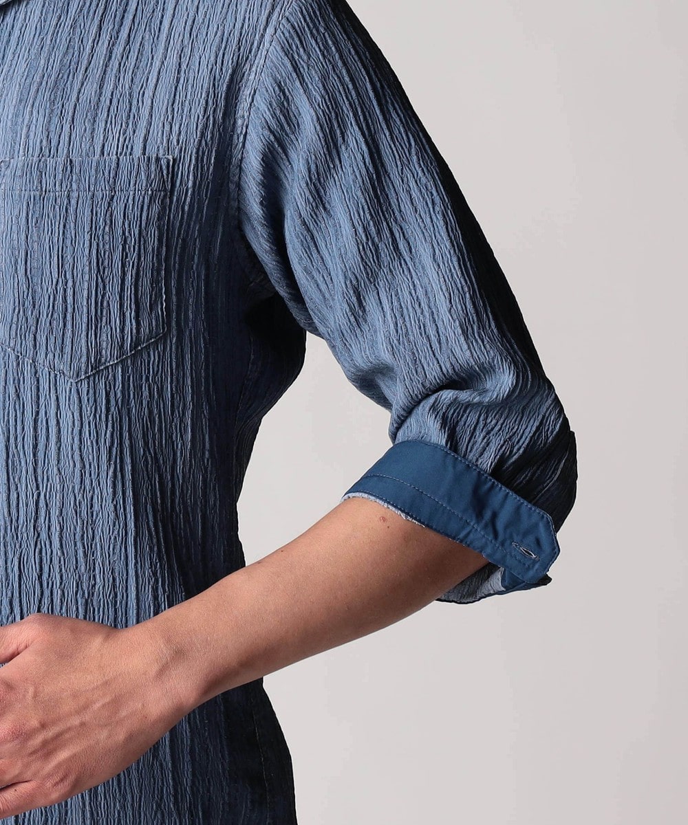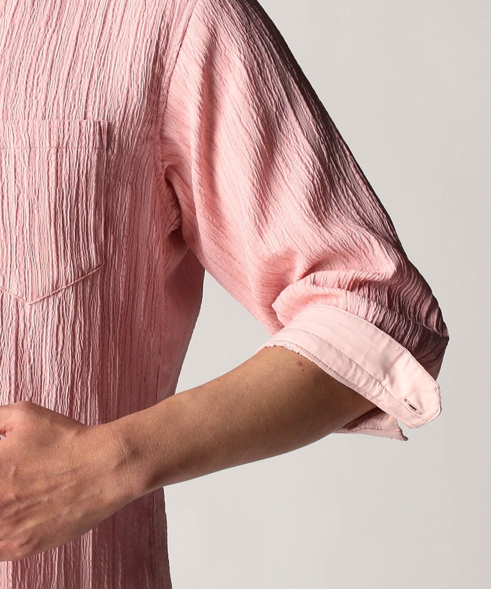 衿端にワイヤ-を仕込んだ七分袖のスタンド・イタリアンカラ-シャツ。今季は衿の高さを低くした新デザインになります。プリーツ素材の為、ボリュームがありますので、ヨーク裏やカフス裏には同色系のストレッチ裏地を採用する事で部分的な厚みを抑え、チラチラしたアクセントにしています。袖口も配色釦にして、ちょっとしたアクセントにしています。