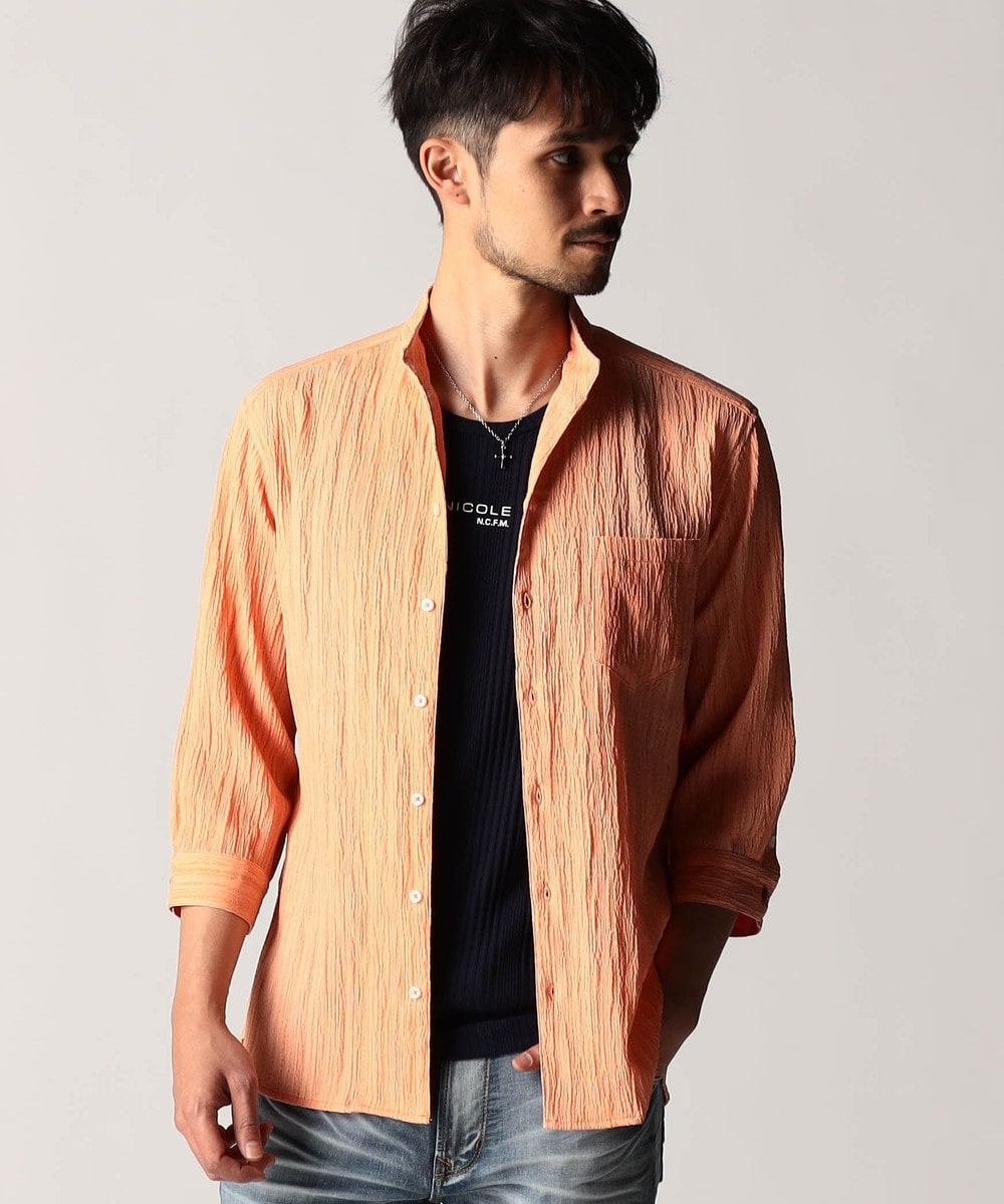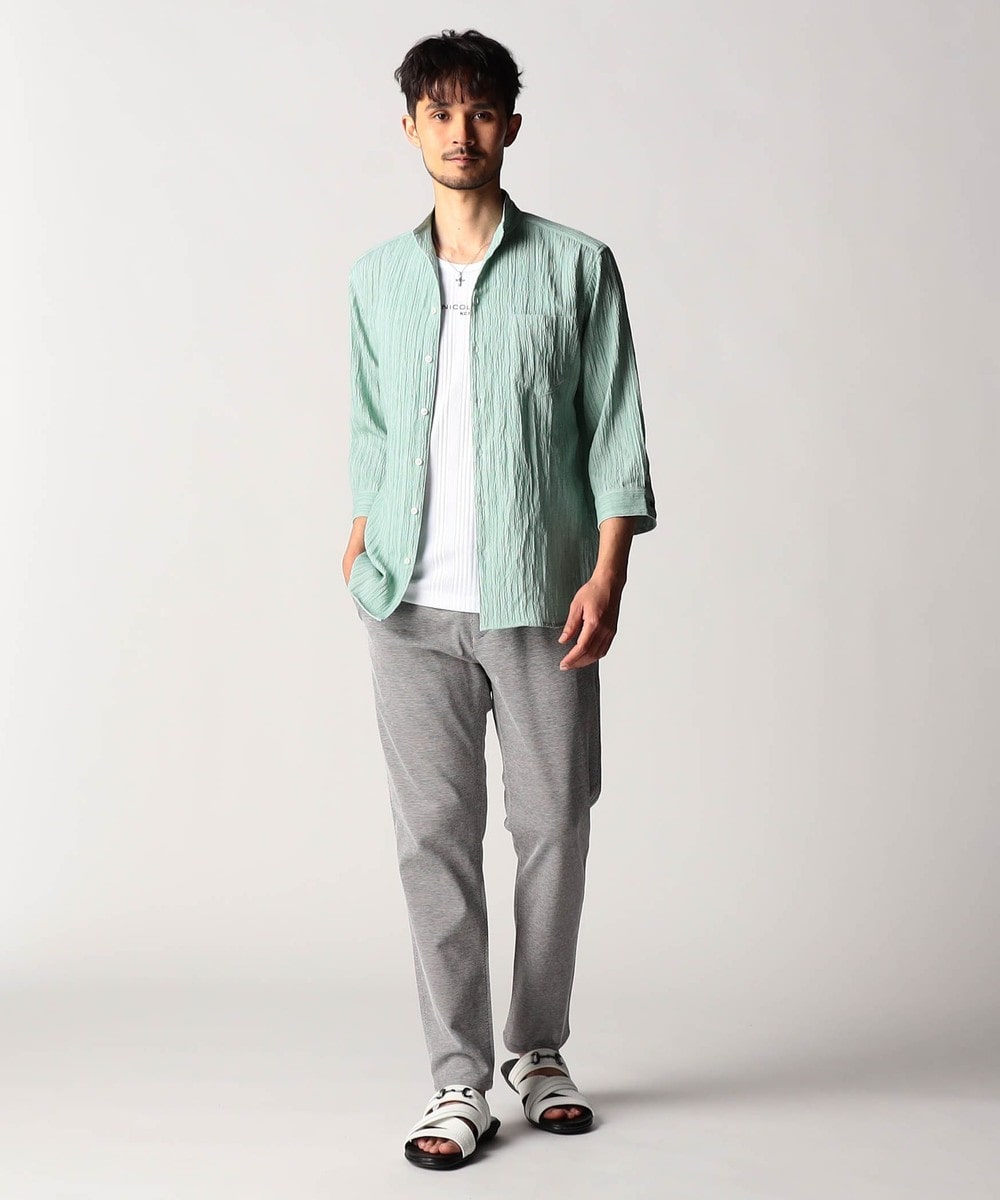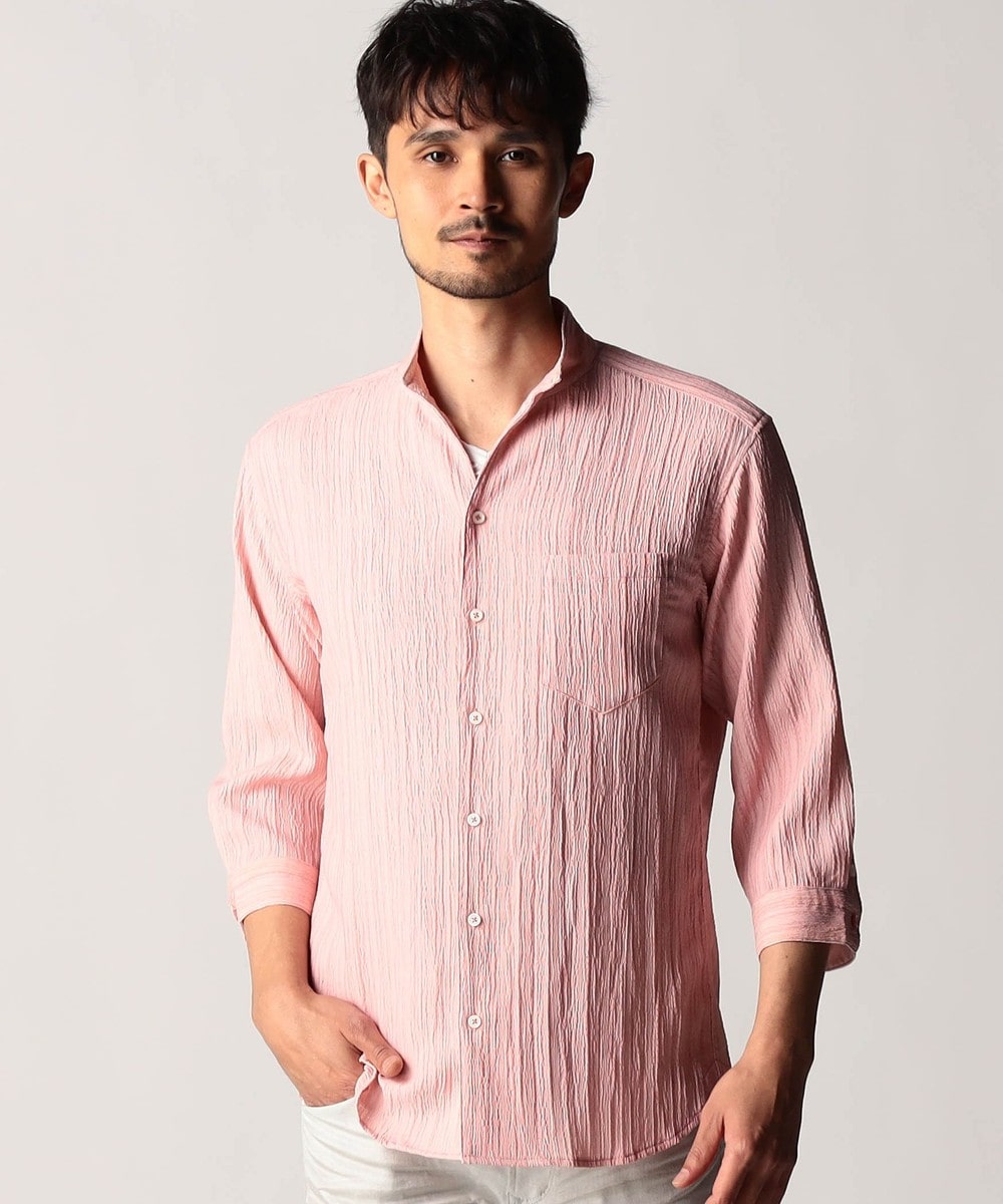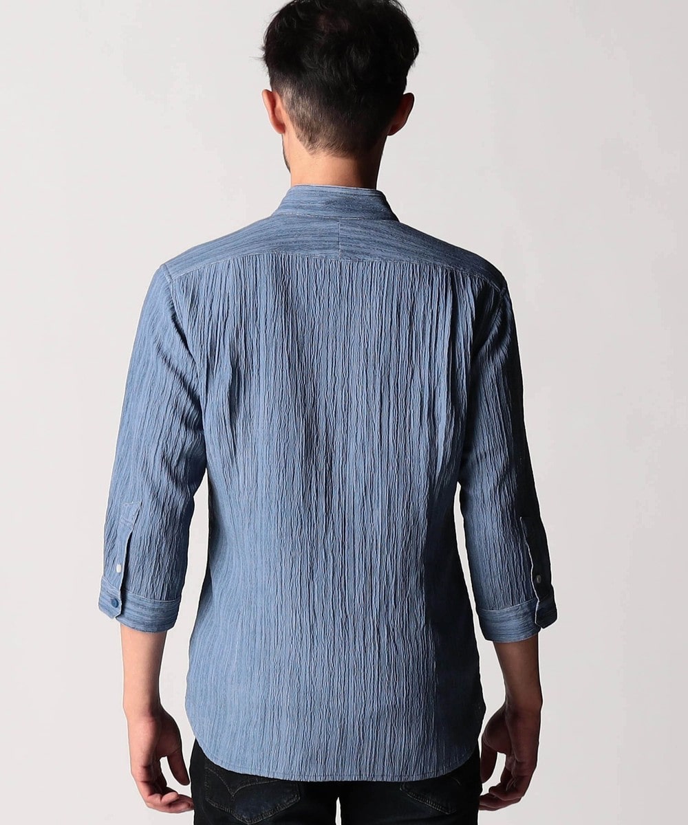 衿端にワイヤ-を仕込んだ七分袖のスタンド・イタリアンカラ-シャツ。今季は衿の高さを低くした新デザインになります。プリーツ素材の為、ボリュームがありますので、ヨーク裏やカフス裏には同色系のストレッチ裏地を採用する事で部分的な厚みを抑え、チラチラしたアクセントにしています。袖口も配色釦にして、ちょっとしたアクセントにしています。