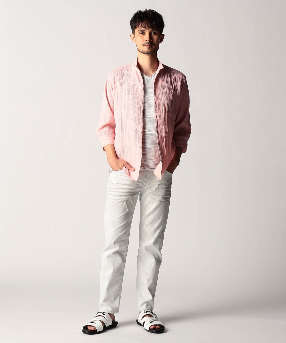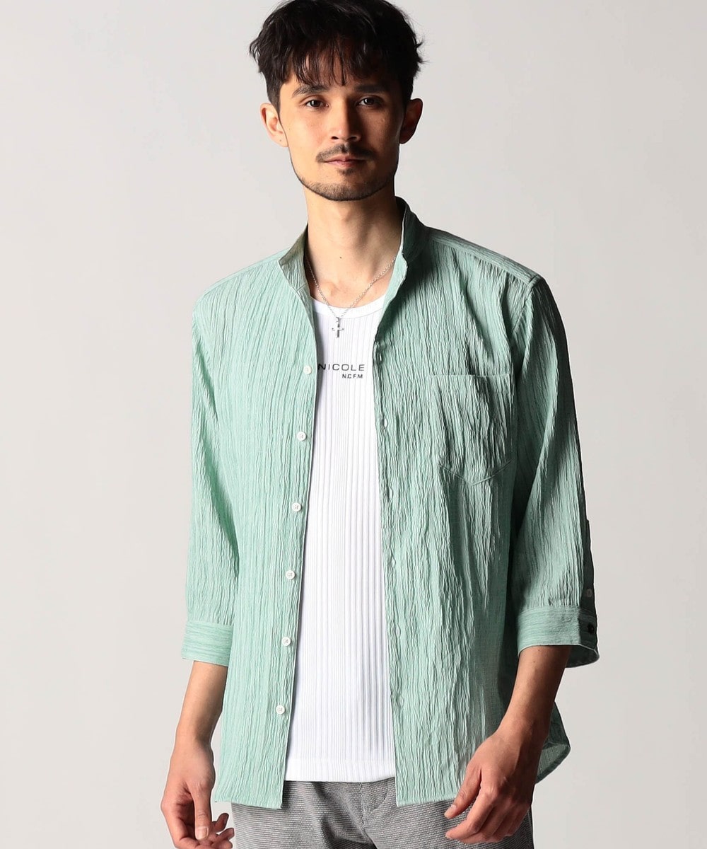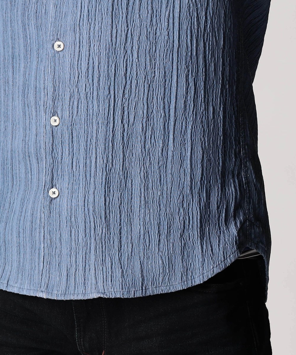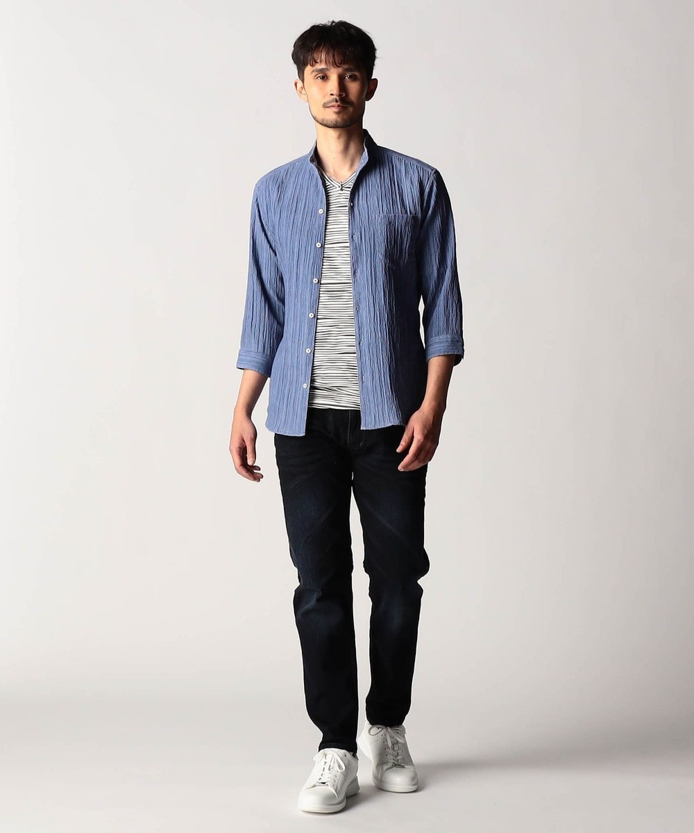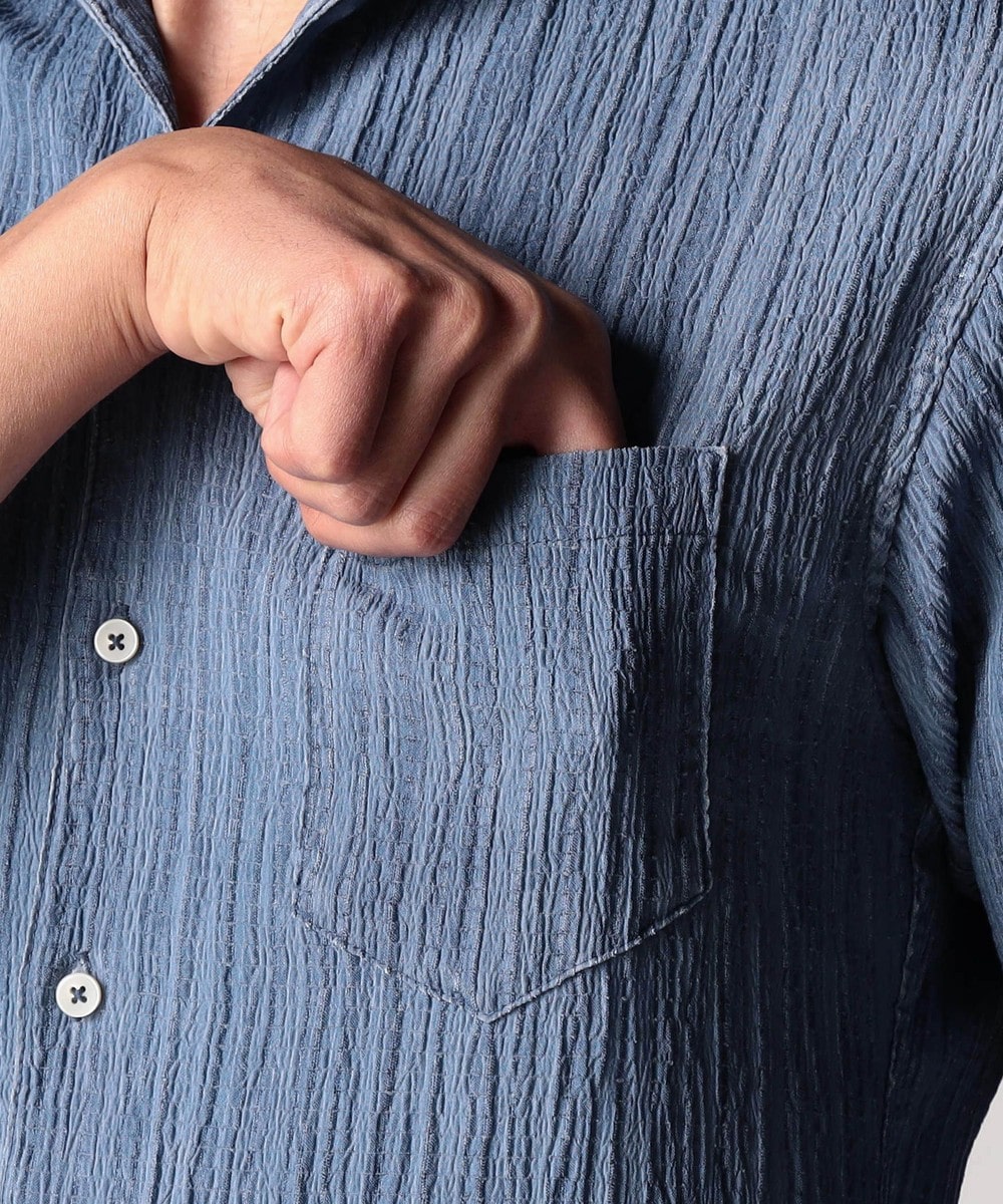 衿端にワイヤ-を仕込んだ七分袖のスタンド・イタリアンカラ-シャツ。今季は衿の高さを低くした新デザインになります。プリーツ素材の為、ボリュームがありますので、ヨーク裏やカフス裏には同色系のストレッチ裏地を採用する事で部分的な厚みを抑え、チラチラしたアクセントにしています。袖口も配色釦にして、ちょっとしたアクセントにしています。