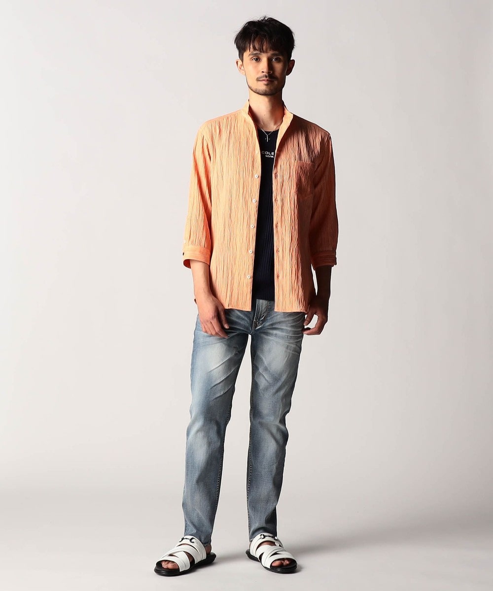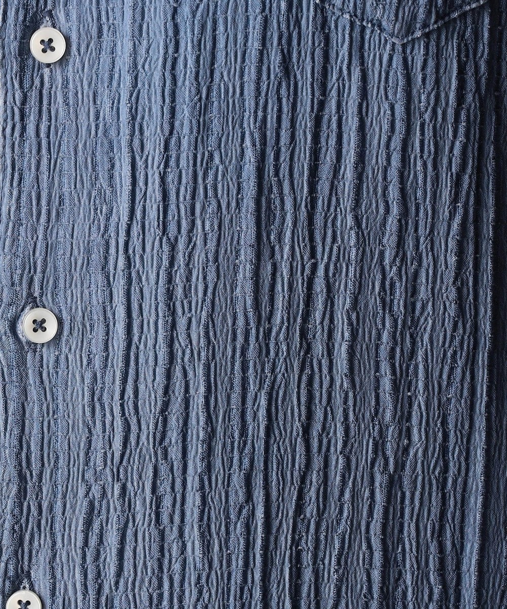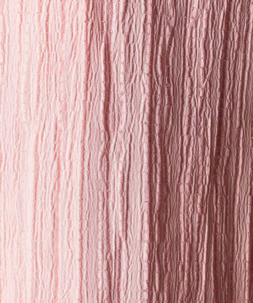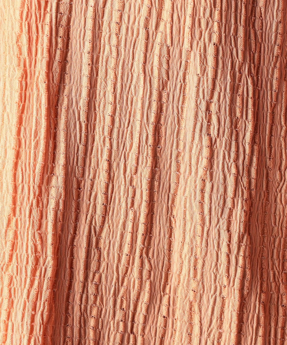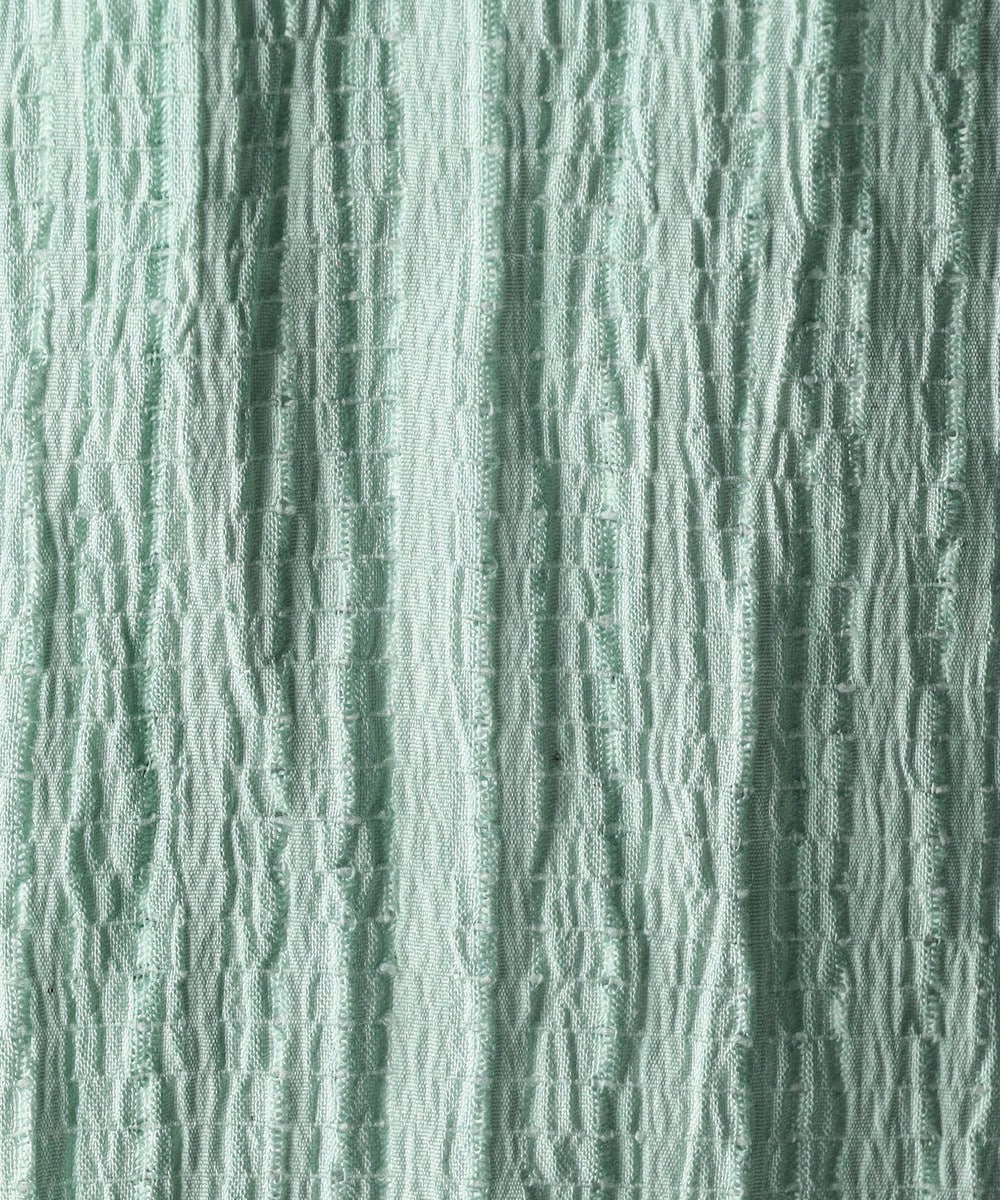 ヨコ糸にポリウレタンの伸びる糸を入れてランダムなプリーツ加工をした生地に、顔料系のカラーコーティングを施した素材です。ベースのプリーツ加工を施した生地はストレッチ性があり、カラーコーティングした事で少し風合いを硬く仕上げています。プリーツの山谷で濃淡の色の差が出る面白い素材で、洗い続けると色がフェードして当たり感や色が抜けた雰囲気になります。