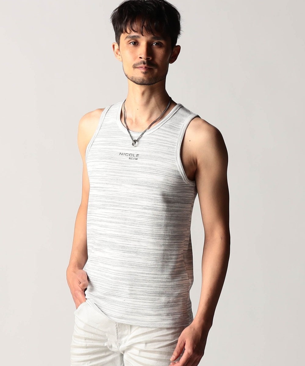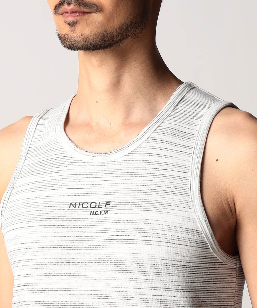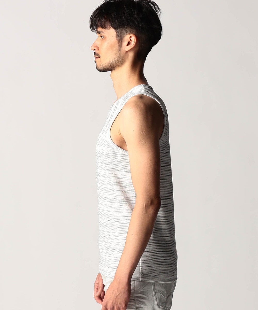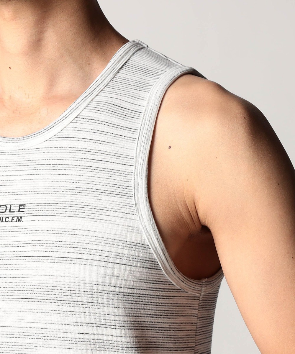スモールロゴでアクセントを効かせたシンプルなタンクトップ。前下りを46サイズで12cm、48サイズで13cm、50サイズで14cmとクルーネック程の浅めに設定し、レイヤードしやすいデザインにしています。ランダムテレコは縦リブ組織ですっきりとした印象。ボーダー3色は黒スラブ糸を意識したランダムなストーム感が特徴です。