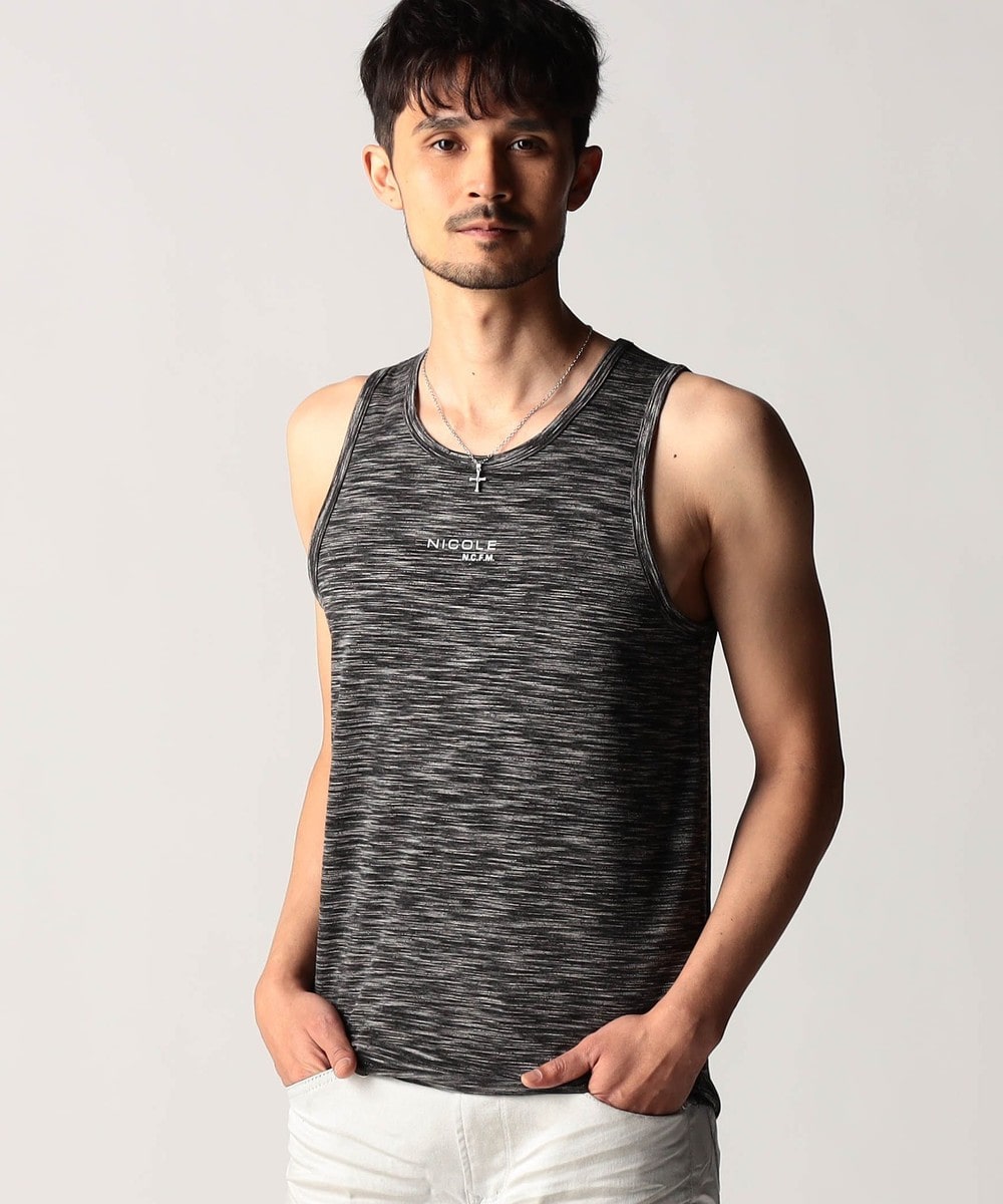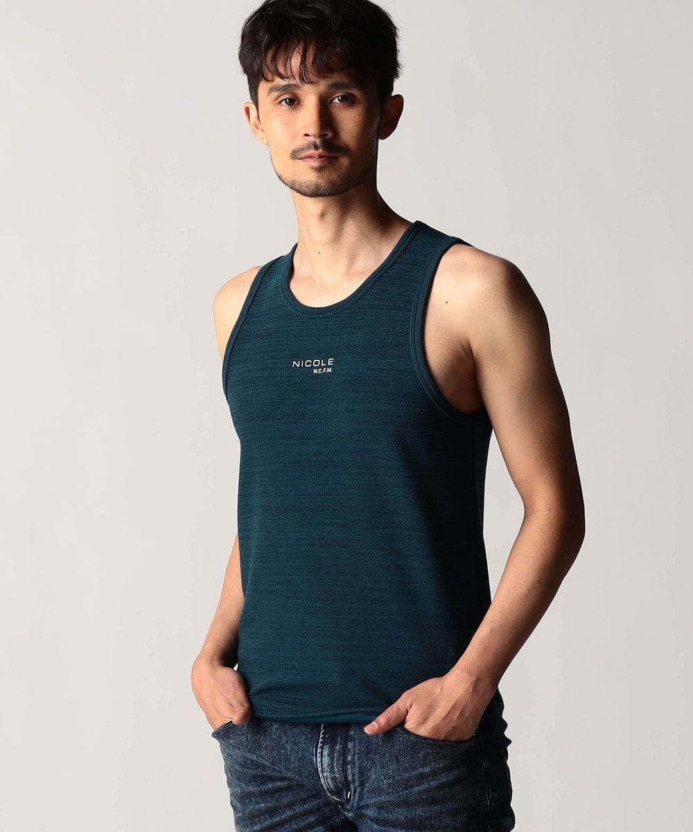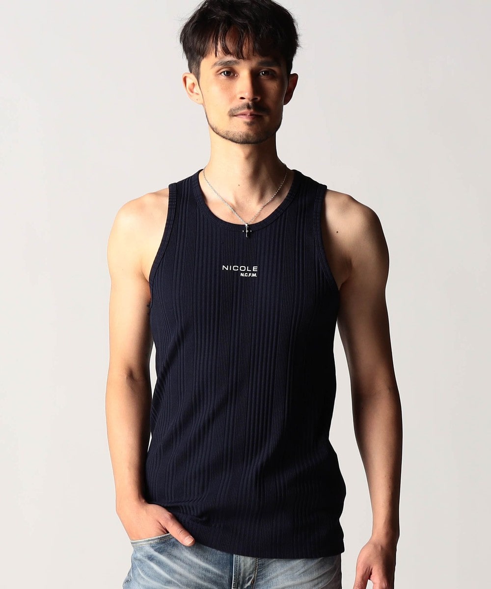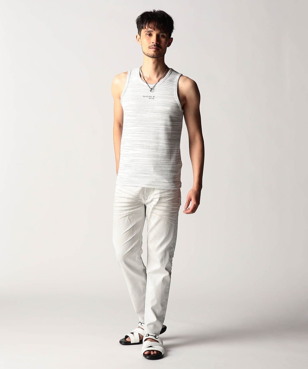 スモールロゴでアクセントを効かせたシンプルなタンクトップ。前下りを46サイズで12cm、48サイズで13cm、50サイズで14cmとクルーネック程の浅めに設定し、レイヤードしやすいデザインにしています。ランダムテレコは縦リブ組織ですっきりとした印象。ボーダー3色は黒スラブ糸を意識したランダムなストーム感が特徴です。