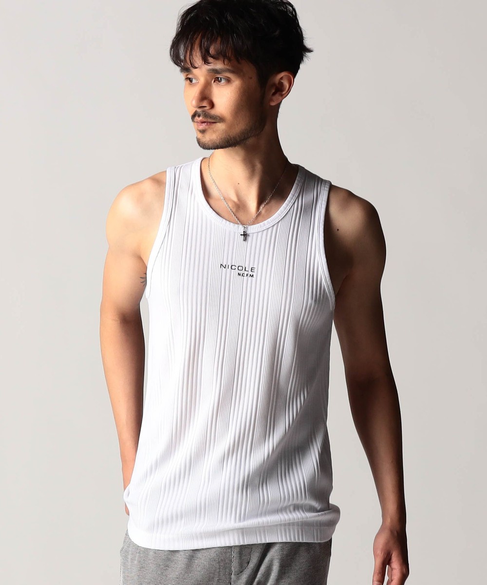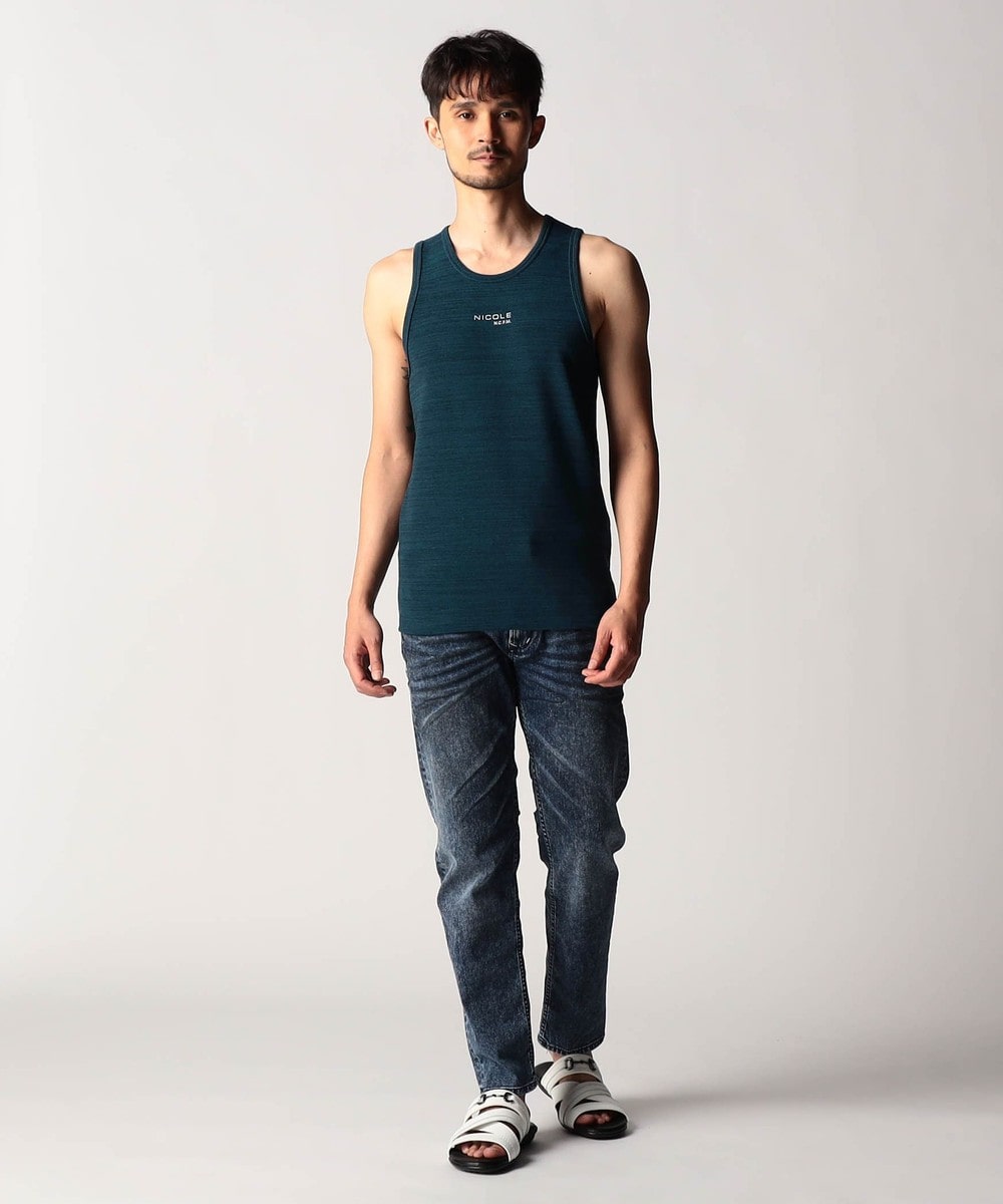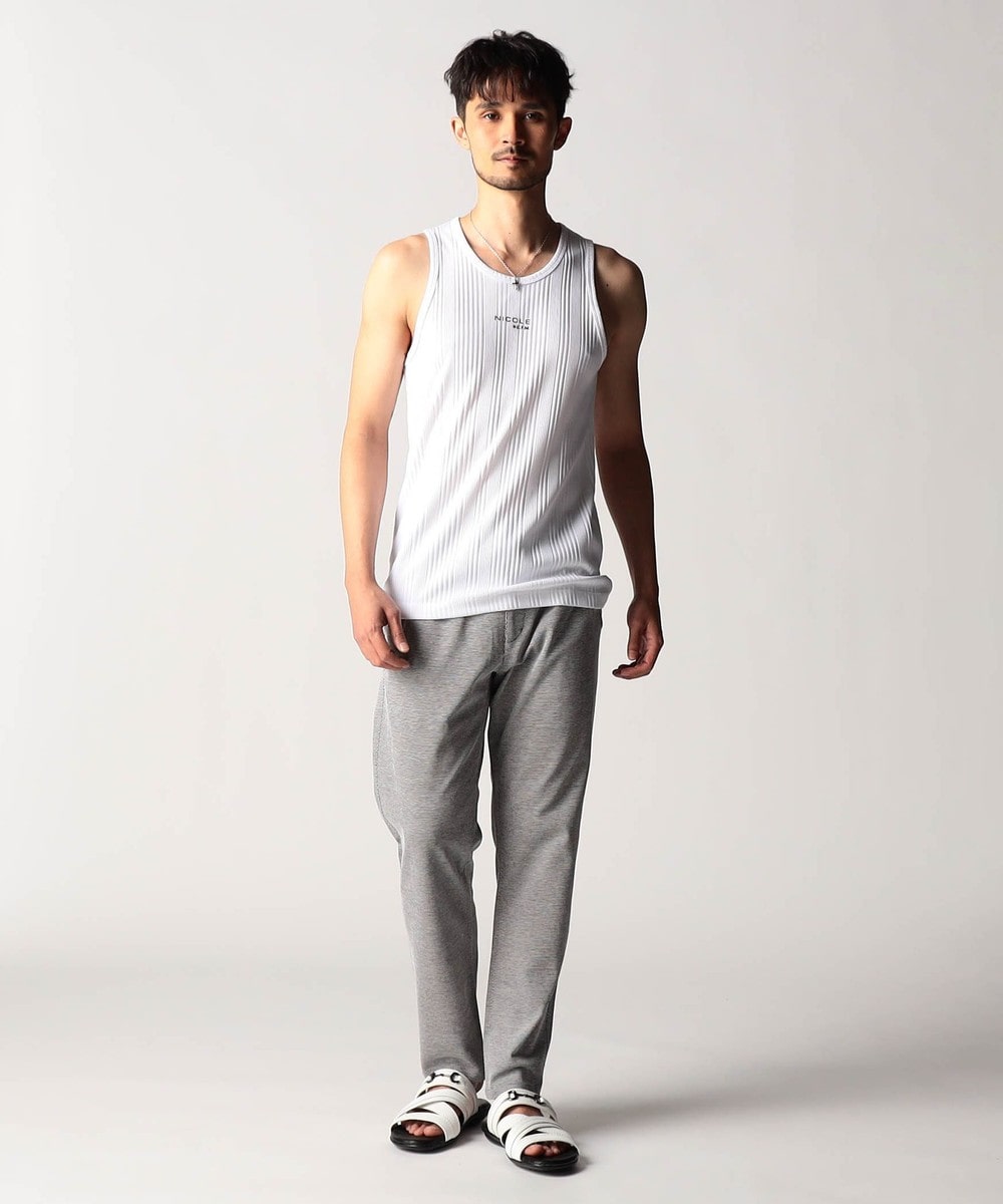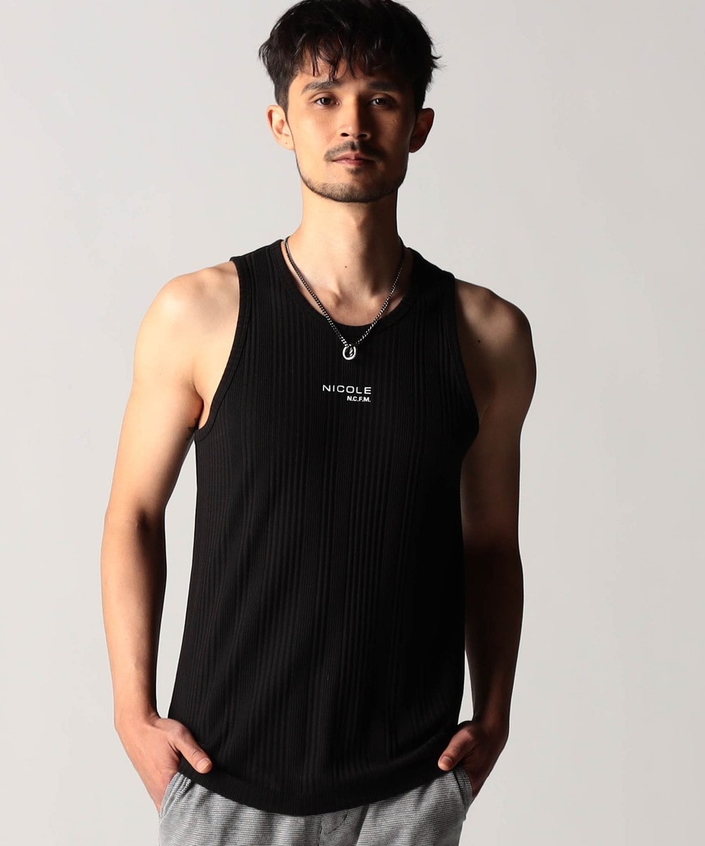 スモールロゴでアクセントを効かせたシンプルなタンクトップ。前下りを46サイズで12cm、48サイズで13cm、50サイズで14cmとクルーネック程の浅めに設定し、レイヤードしやすいデザインにしています。ランダムテレコは縦リブ組織ですっきりとした印象。ボーダー3色は黒スラブ糸を意識したランダムなストーム感が特徴です。