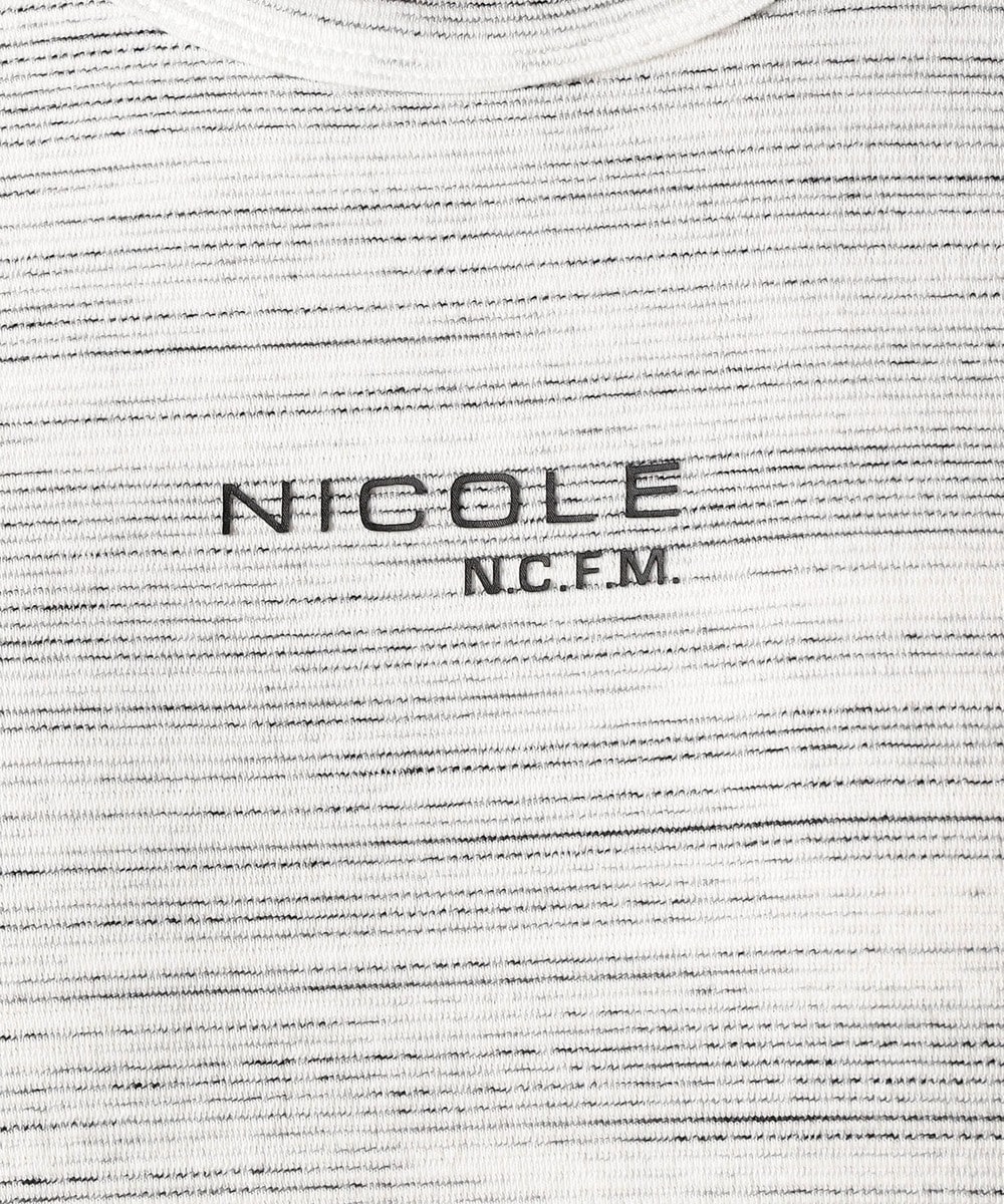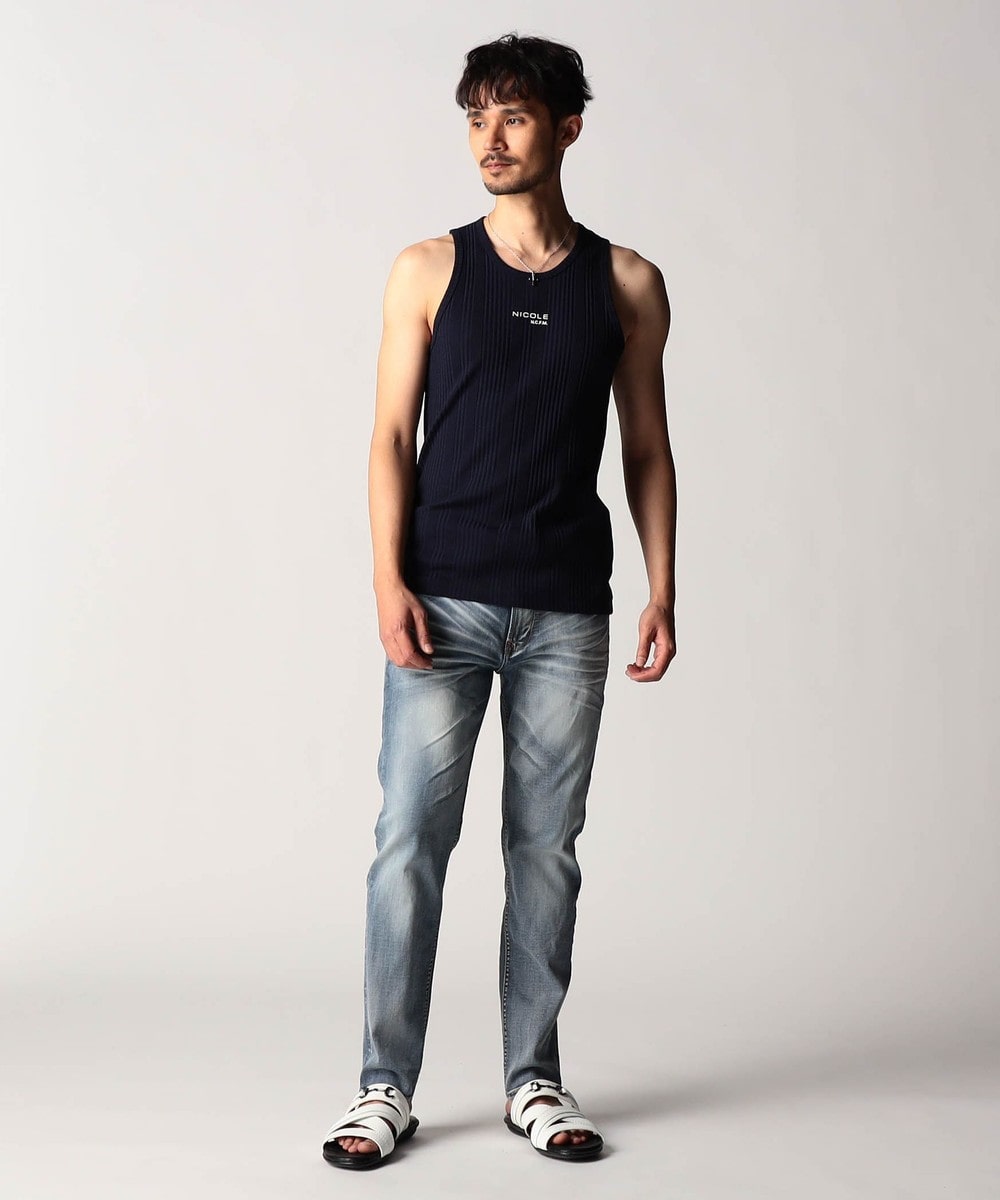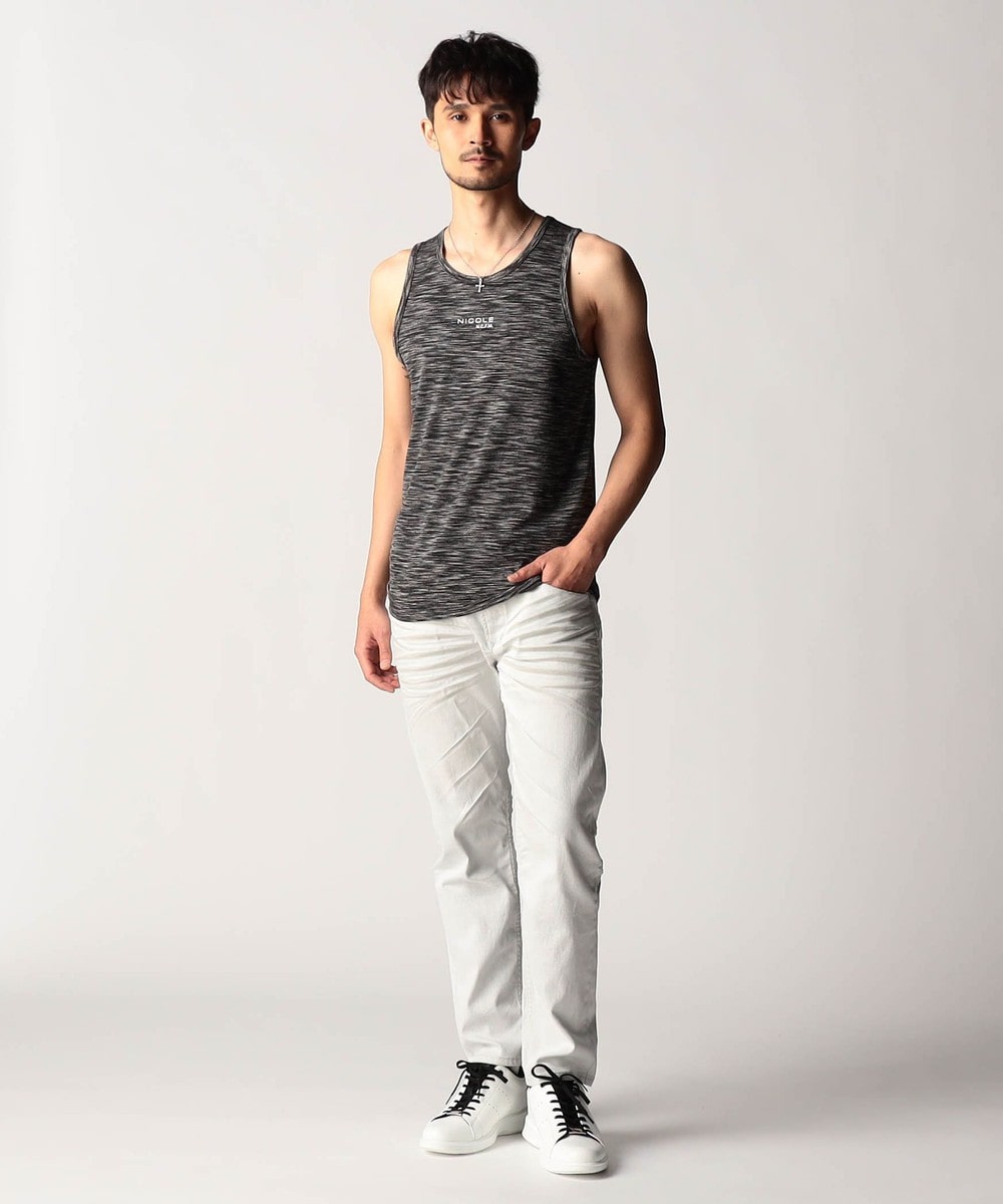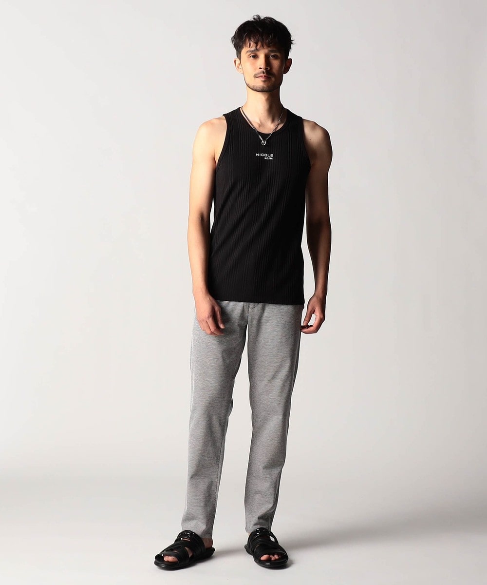 スモールロゴでアクセントを効かせたシンプルなタンクトップ。前下りを46サイズで12cm、48サイズで13cm、50サイズで14cmとクルーネック程の浅めに設定し、レイヤードしやすいデザインにしています。ランダムテレコは縦リブ組織ですっきりとした印象。ボーダー3色は黒スラブ糸を意識したランダムなストーム感が特徴です。