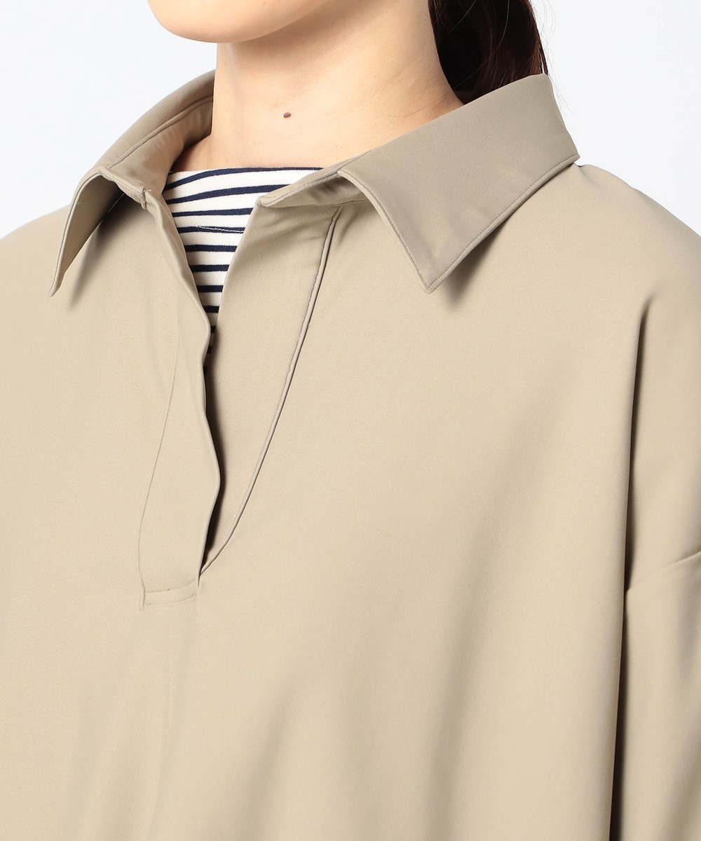 襟元にボタンがなく、V字に開いたデザインが特徴で、自然な襟の抜け感が生まれ、顔周りをすっきりと見せてくれます。