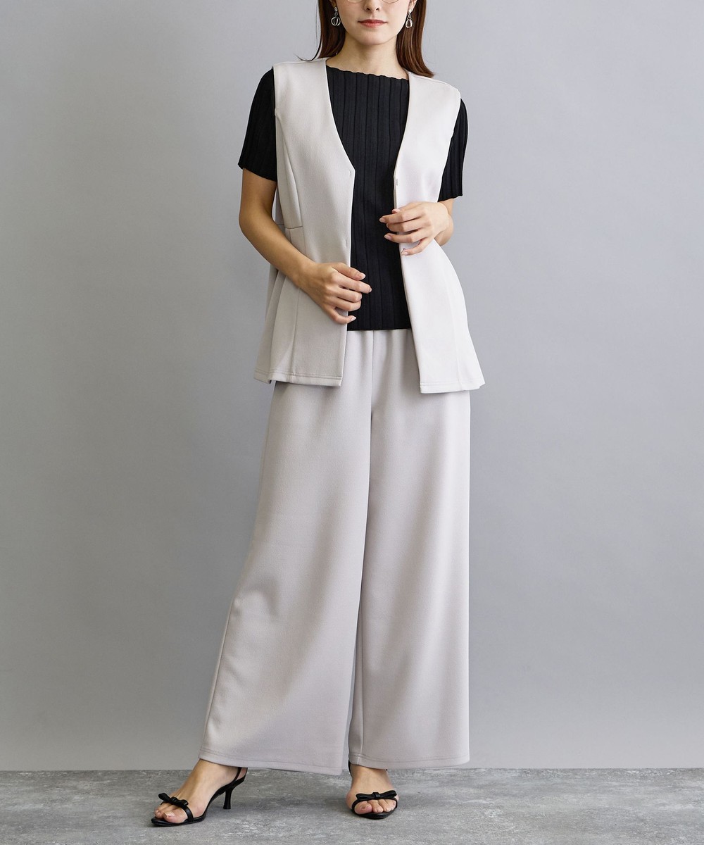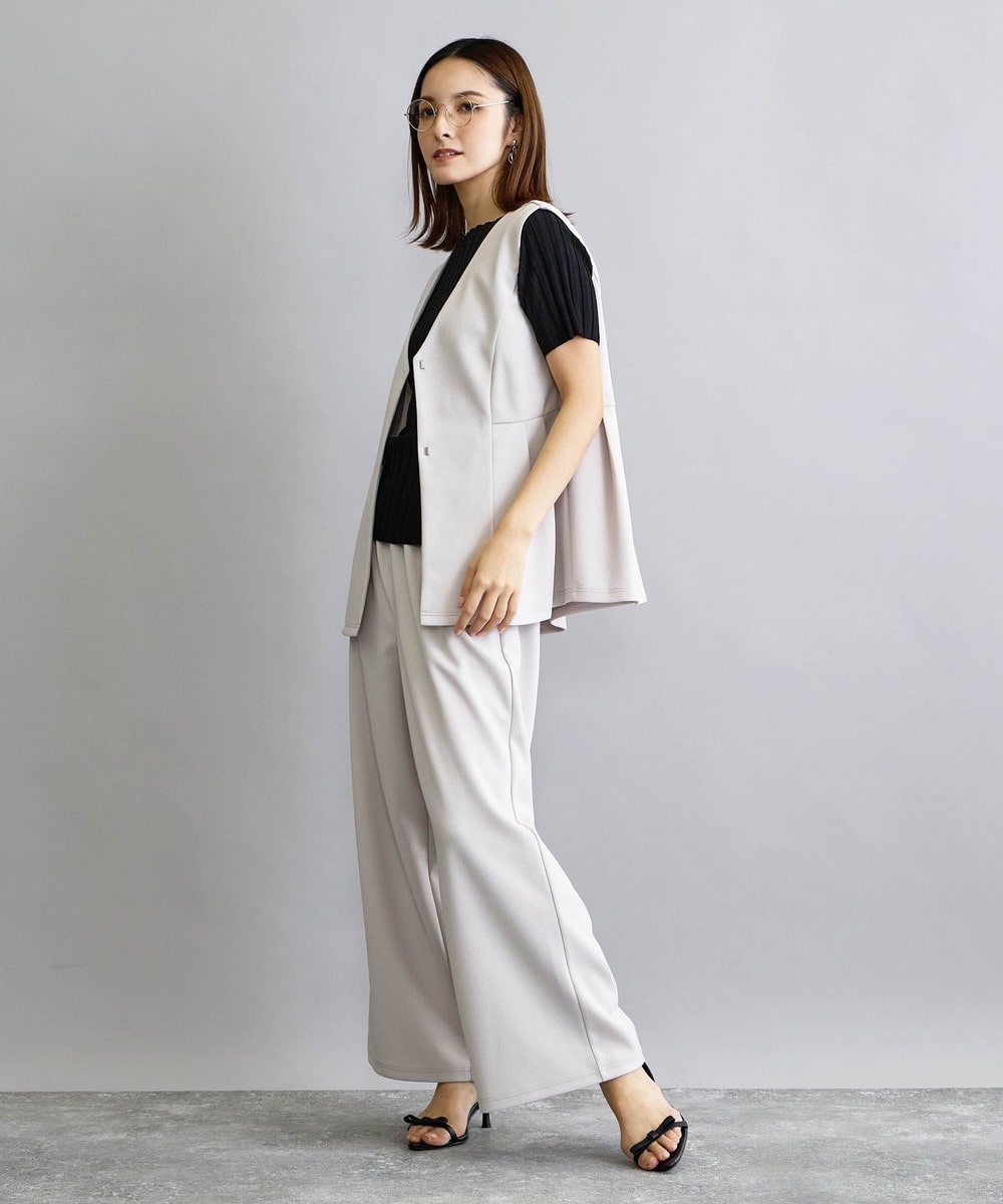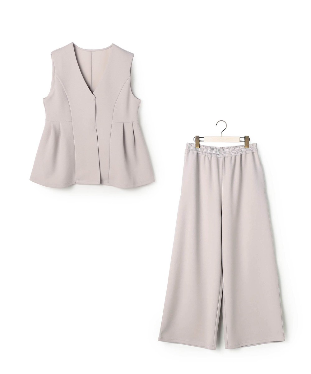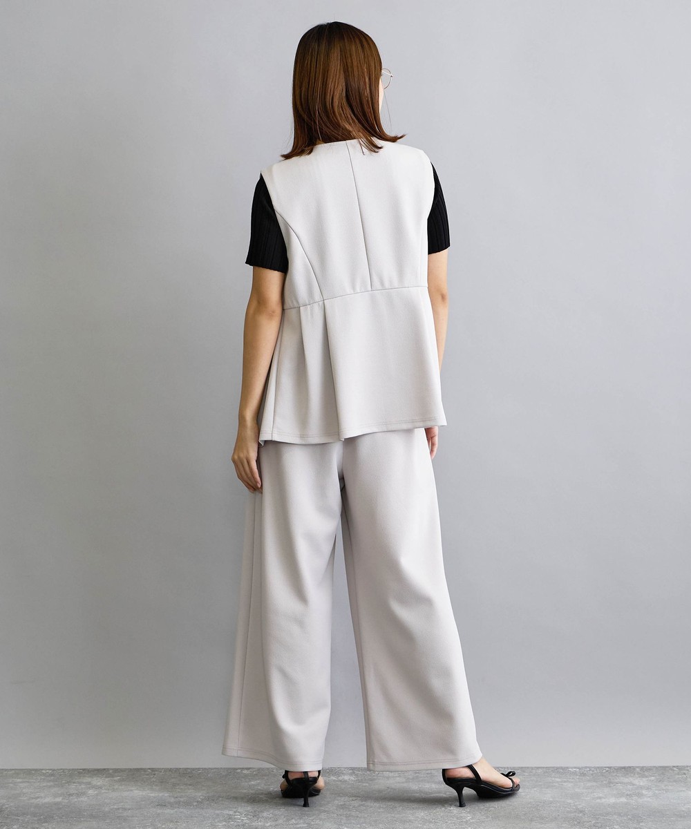 タックのきいたゆったりベスト+ウエストゴムがうれしいワイドパンツのセットアイテム。