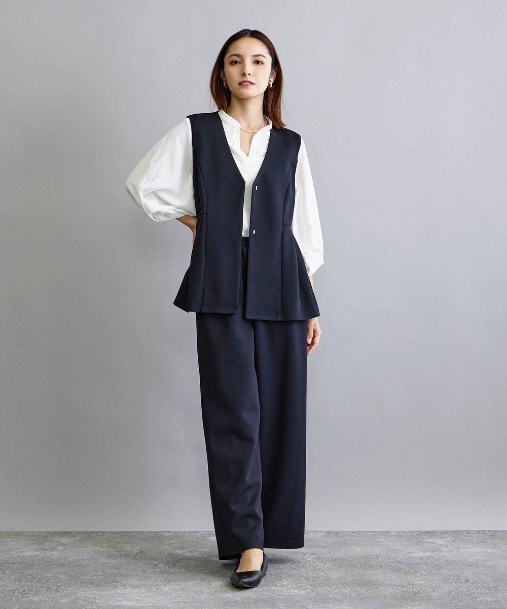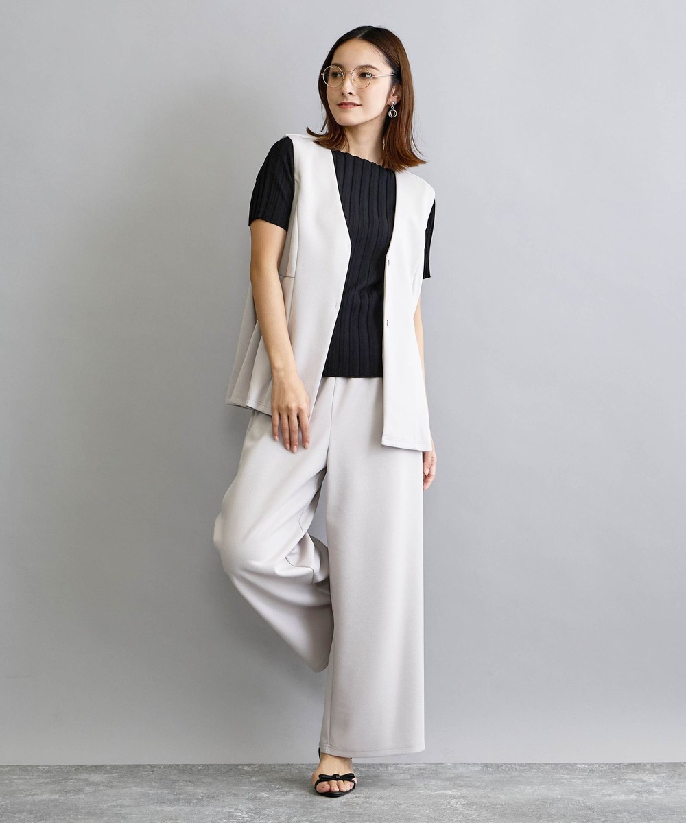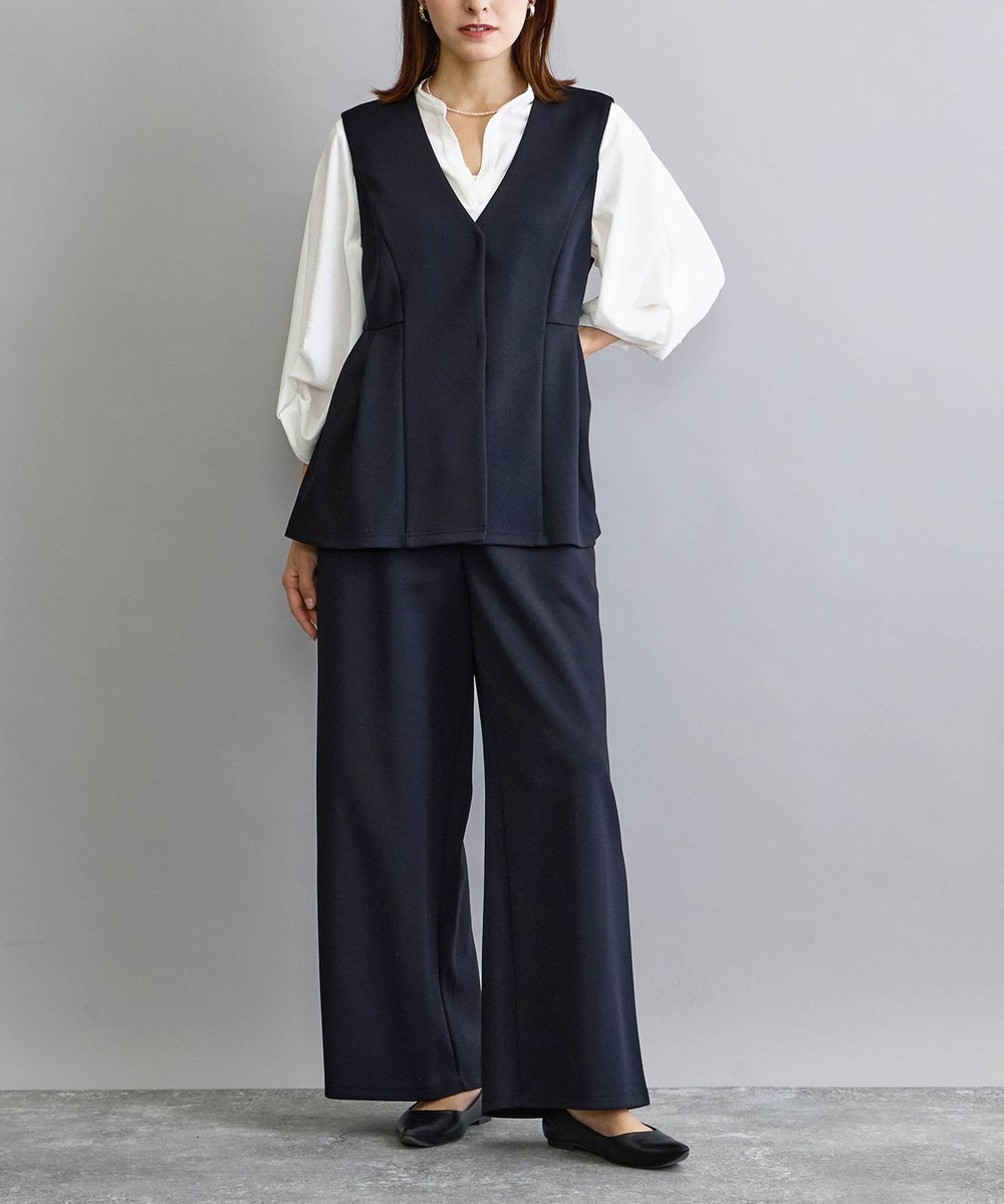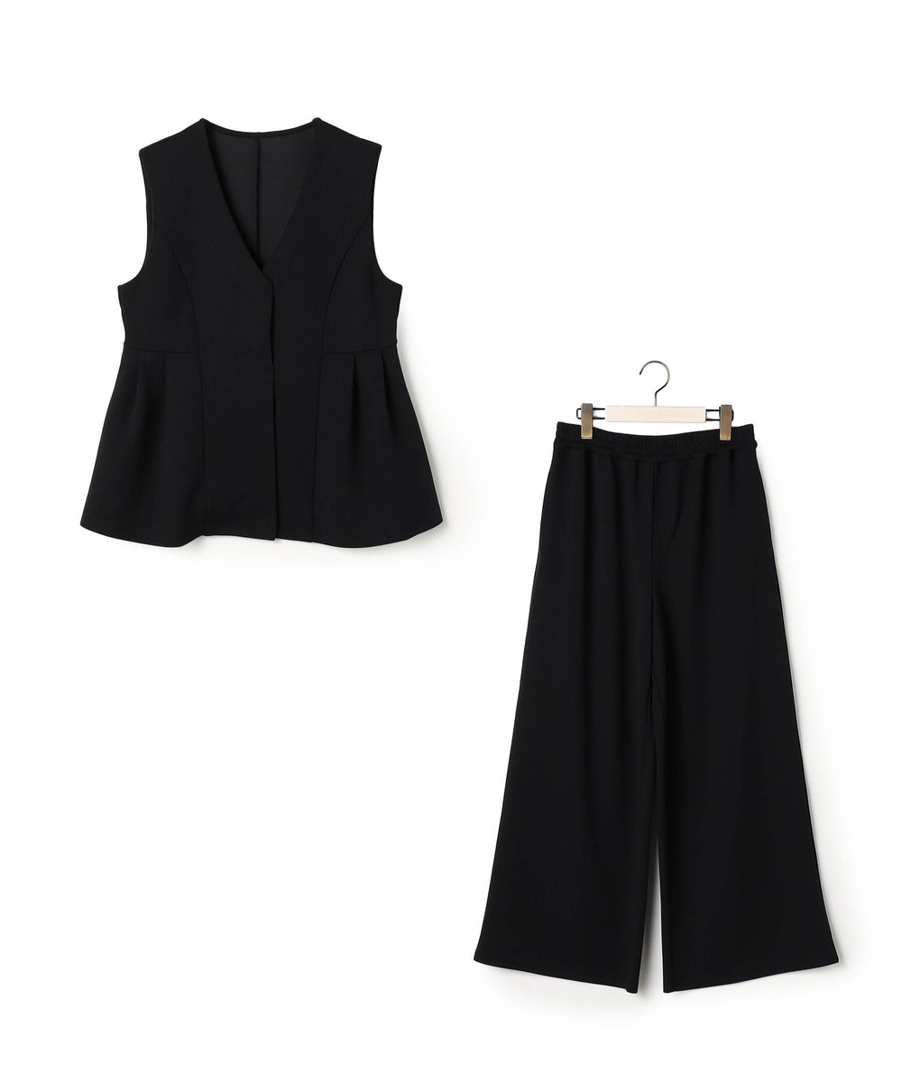 タックのきいたゆったりベスト+ウエストゴムがうれしいワイドパンツのセットアイテム。