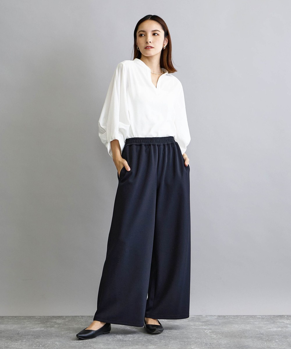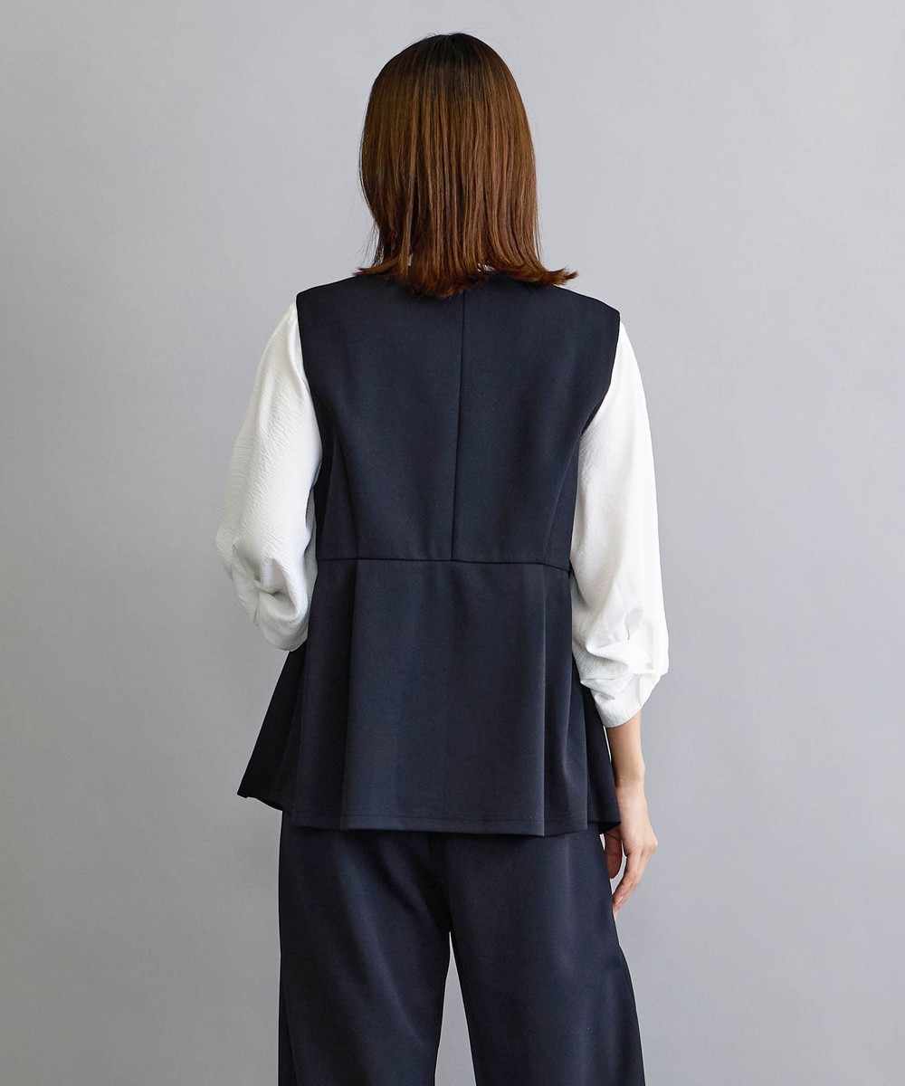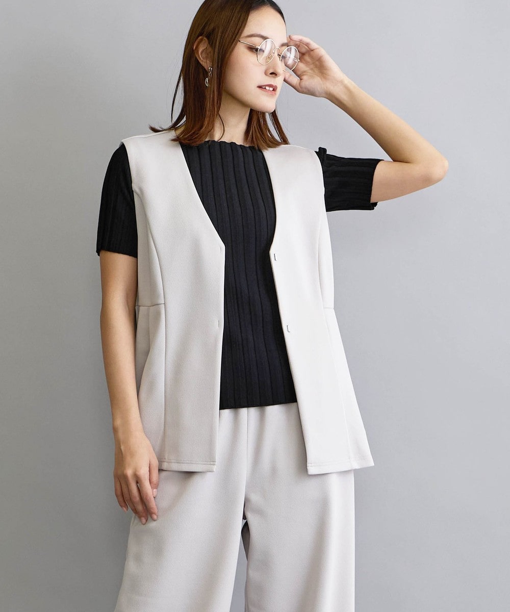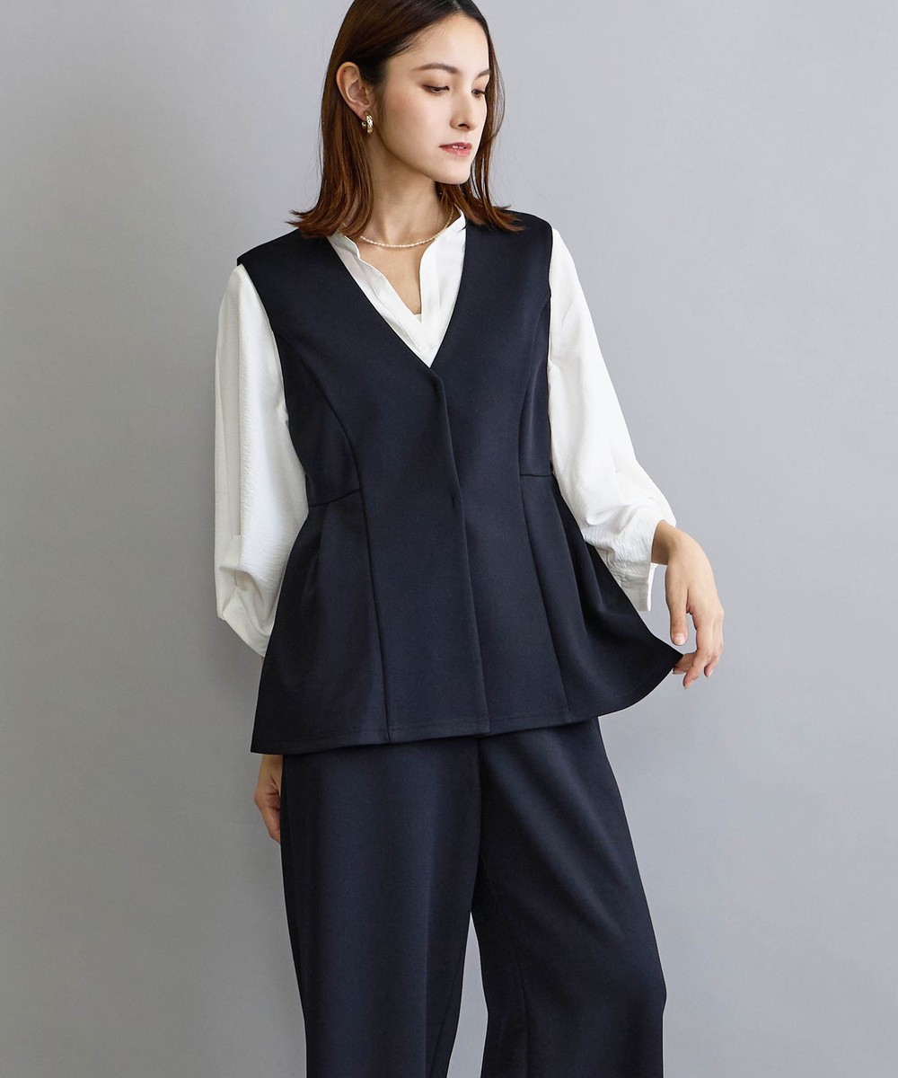 タックのきいたゆったりベスト+ウエストゴムがうれしいワイドパンツのセットアイテム。