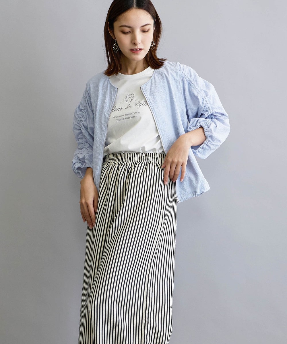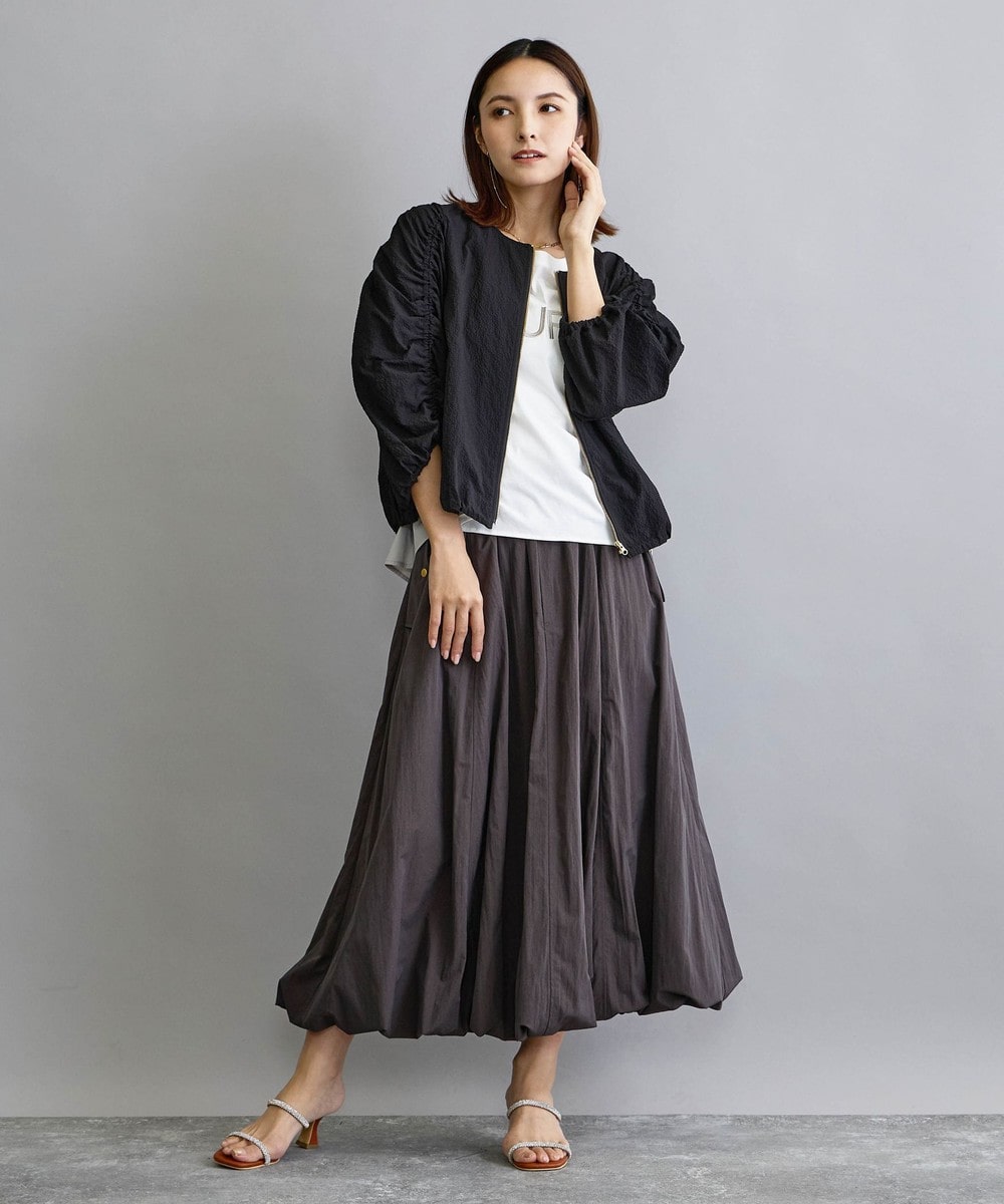 袖のギャザーがかわいらしいノーカラーブルゾン。裾はドロスト仕様できゅっとさせても◎