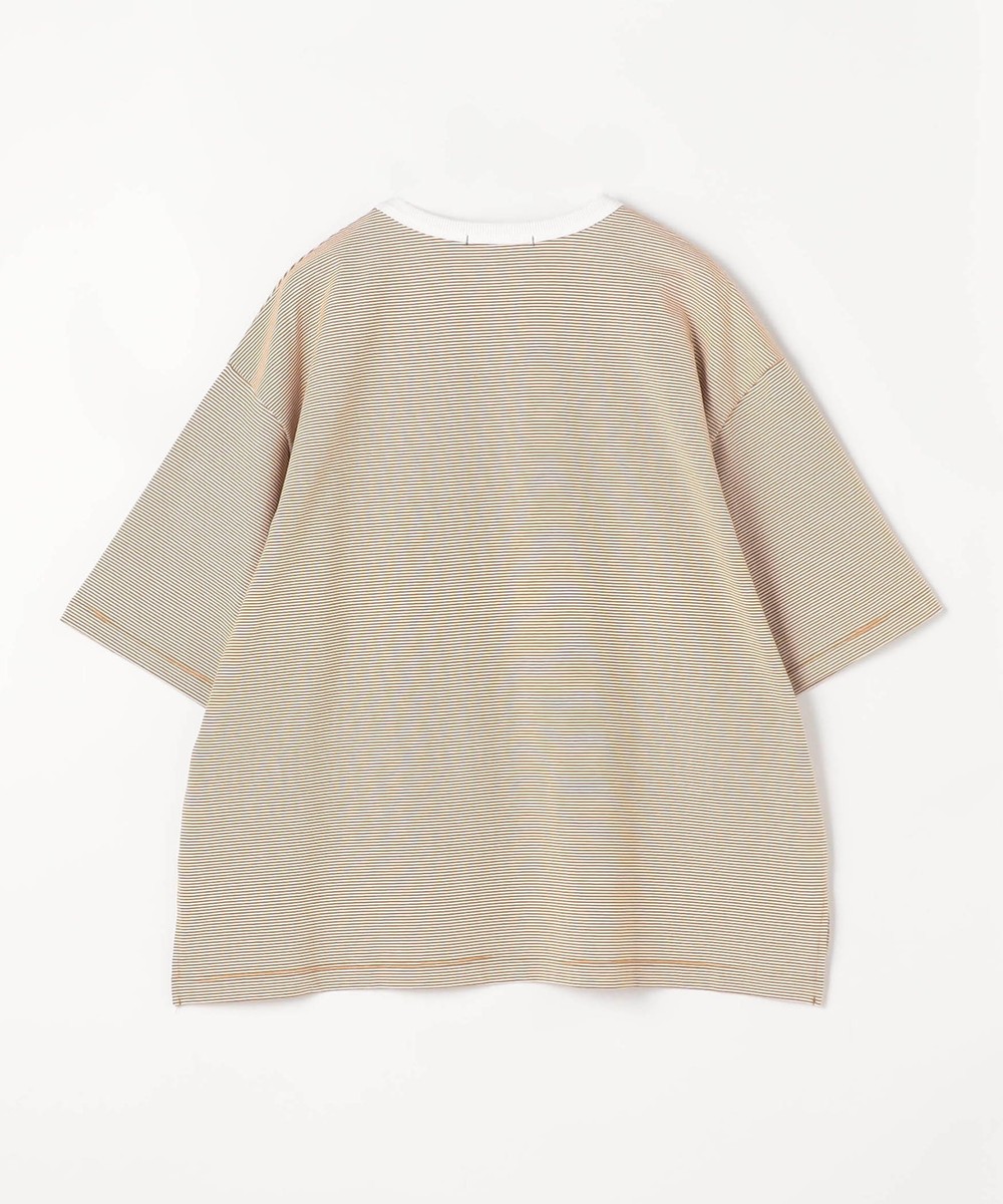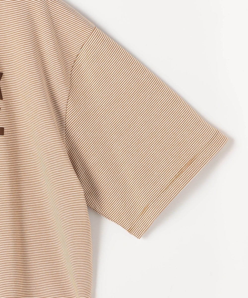 ミジンボーダーの生地を使った、クルーネックのロゴTシャツです。