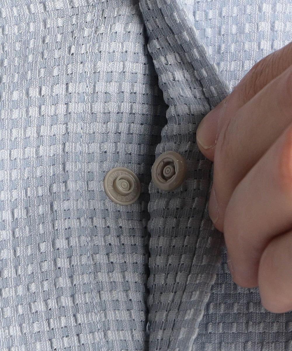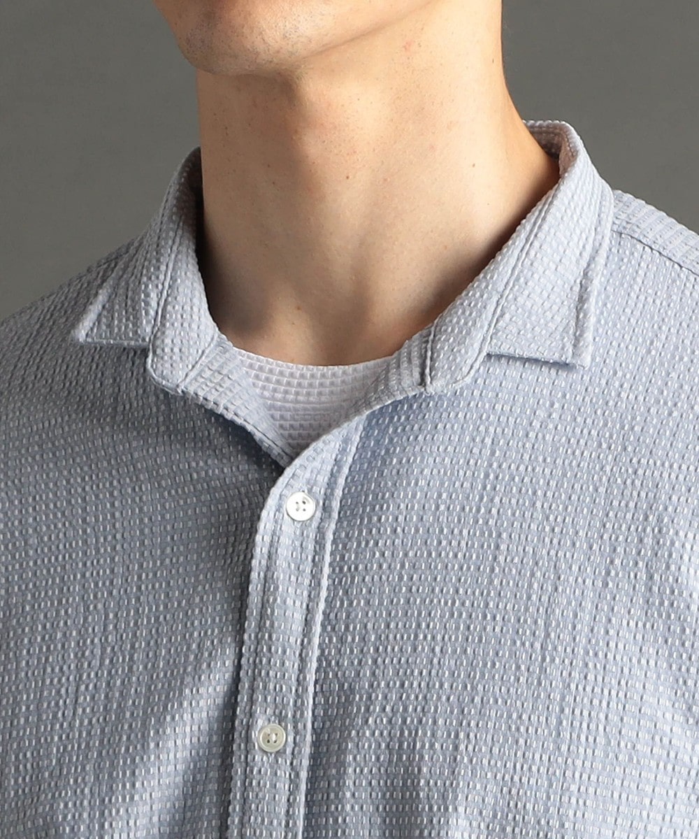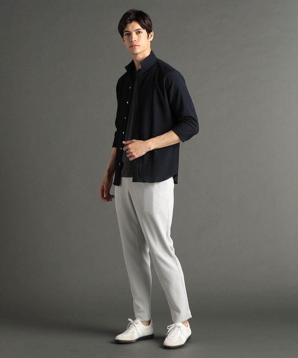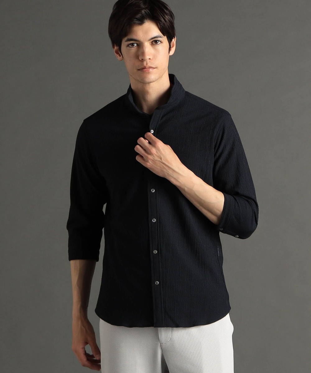 ミニマルなシャツカラーと、スタンドカラーに着こなせる2WAYデザイン。サファリシャツのデザイン性も備えたハイブリッドなスタイリングを演出。