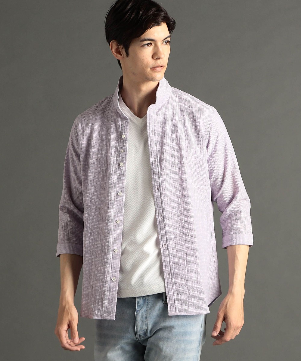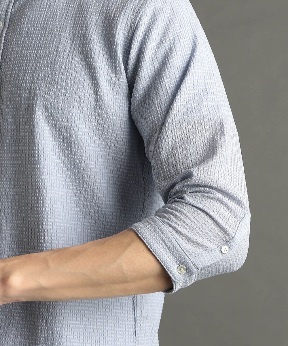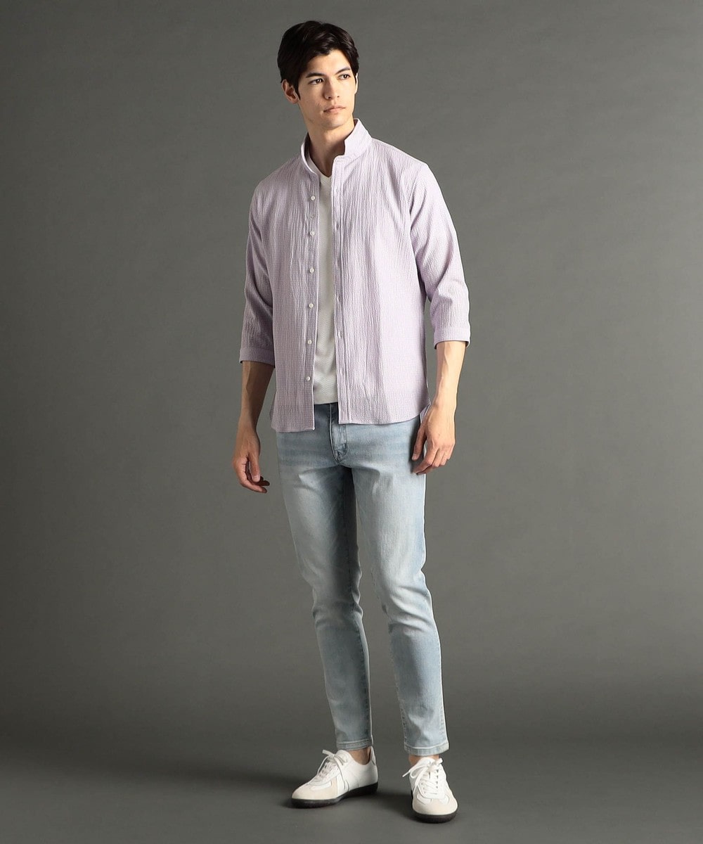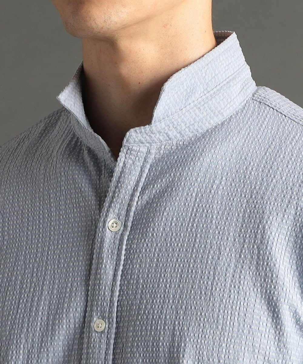 ミニマルなシャツカラーと、スタンドカラーに着こなせる2WAYデザイン。サファリシャツのデザイン性も備えたハイブリッドなスタイリングを演出。