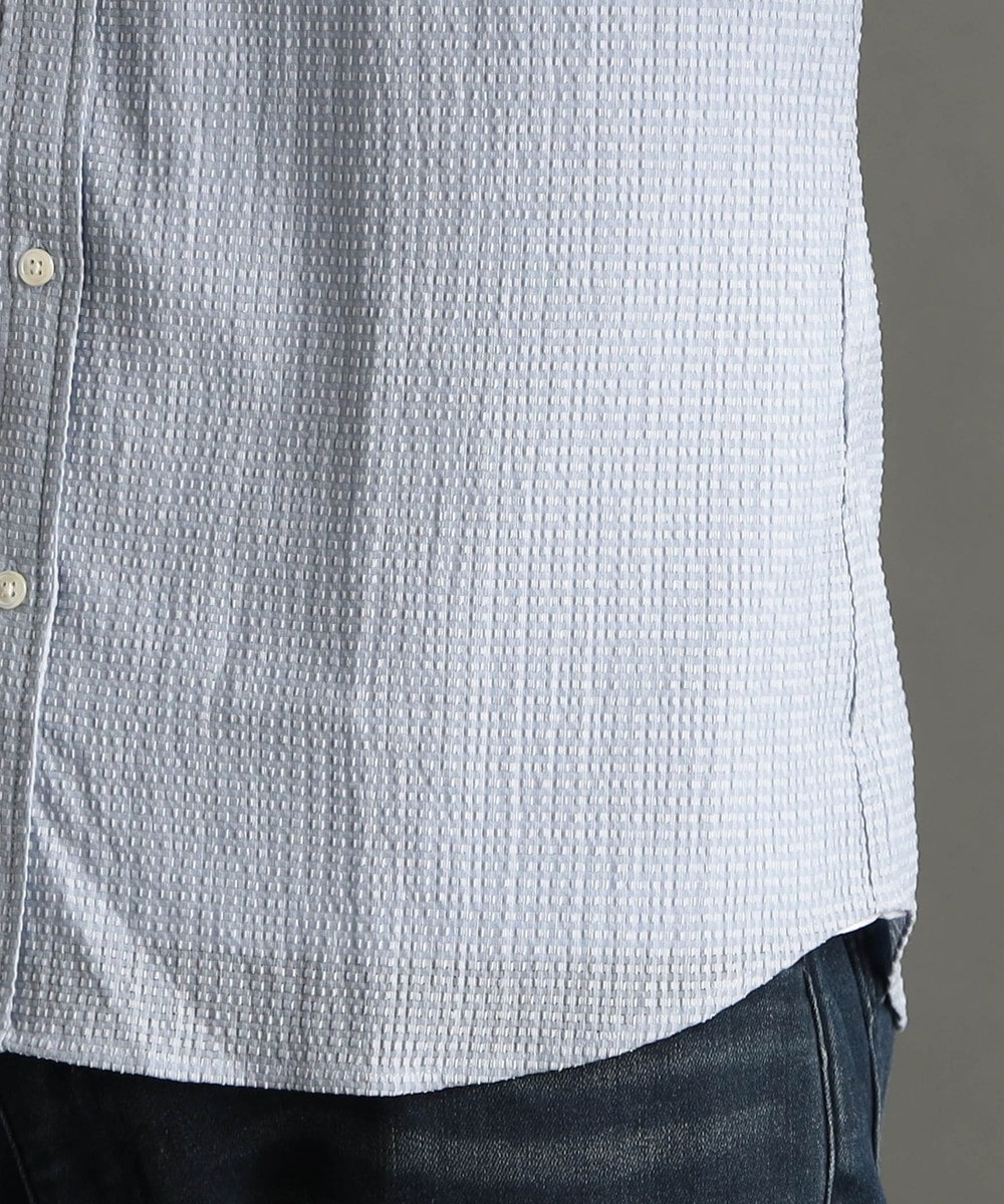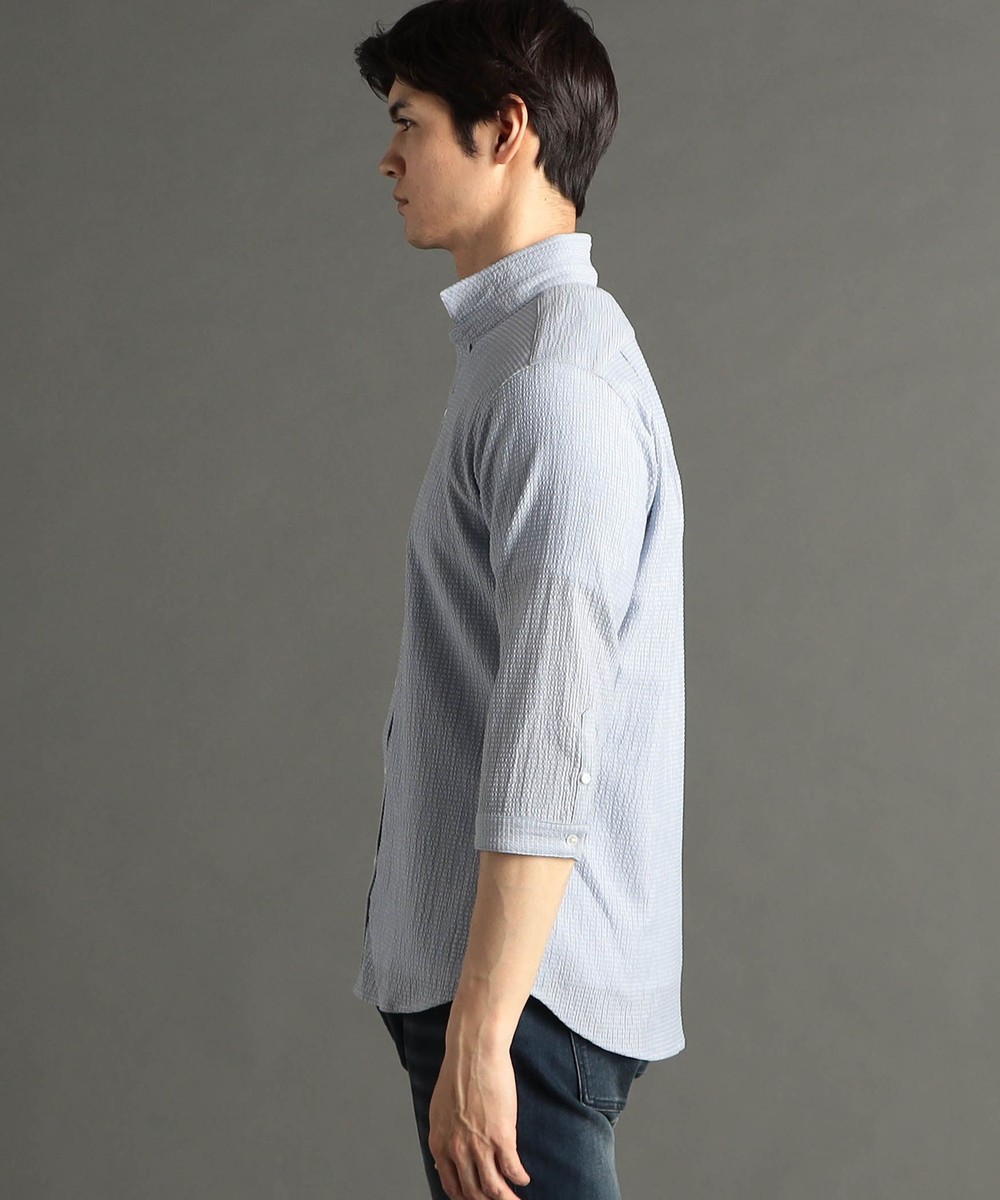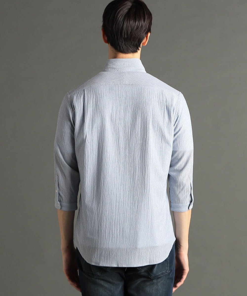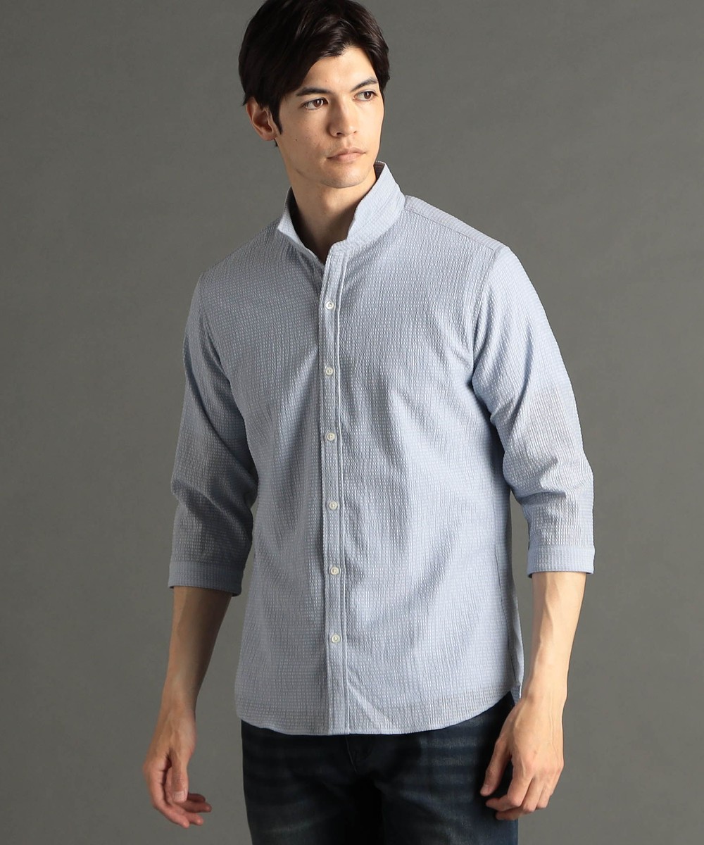ミニマルなシャツカラーと、スタンドカラーに着こなせる2WAYデザイン。サファリシャツのデザイン性も備えたハイブリッドなスタイリングを演出。