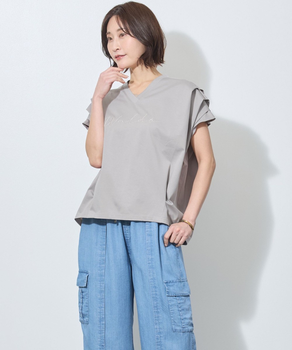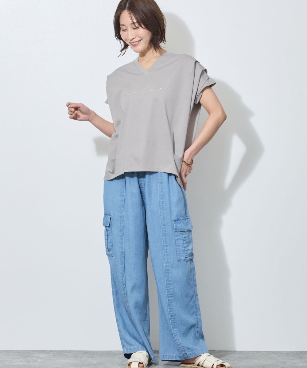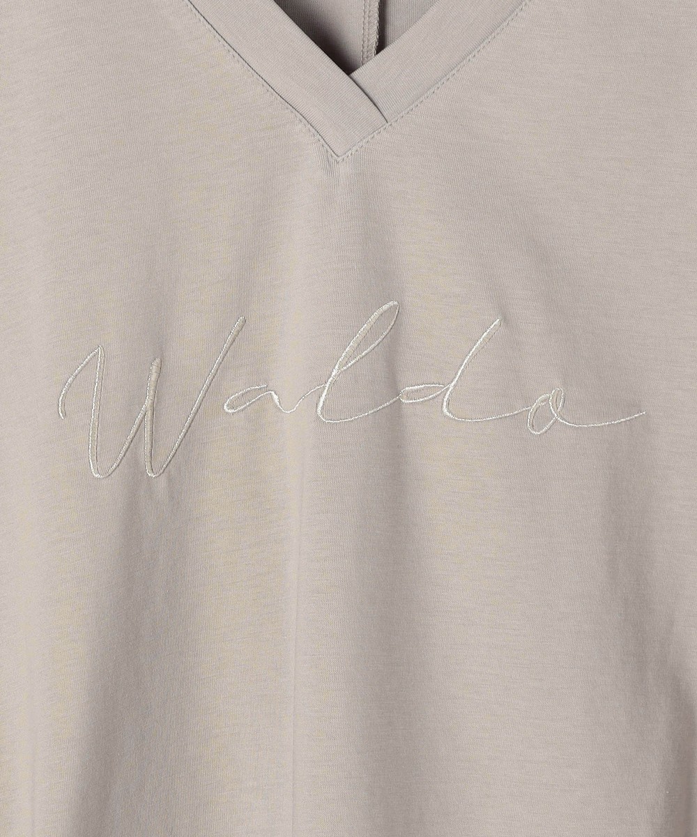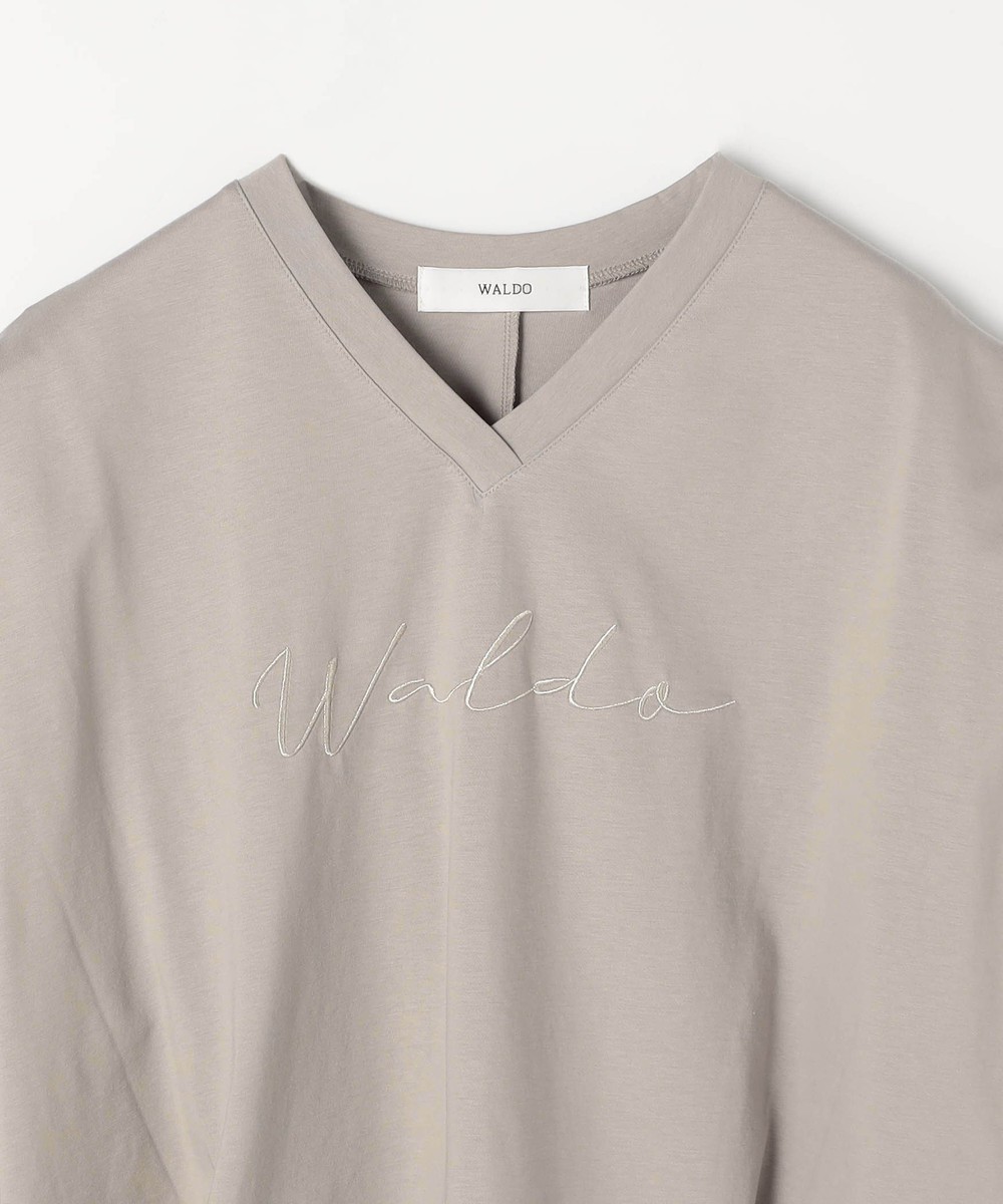 胸のロゴ刺繍は淡いゴールドの筆記体で、女性らしさを感じさせ、カジュアルになりすぎないのが◎。