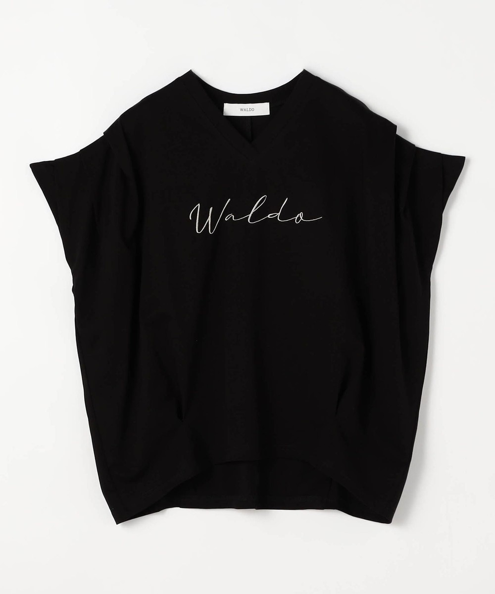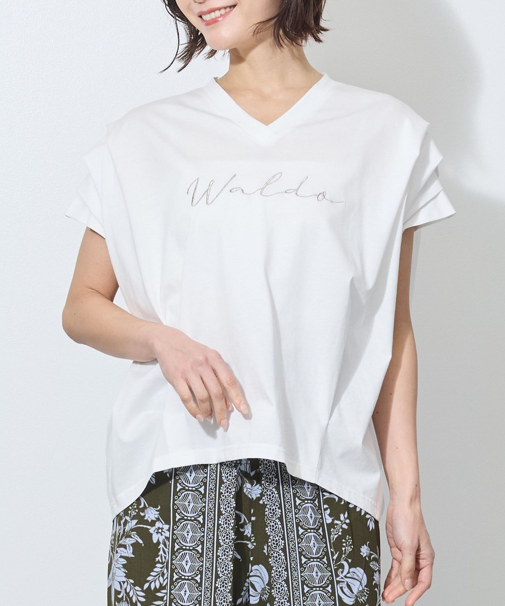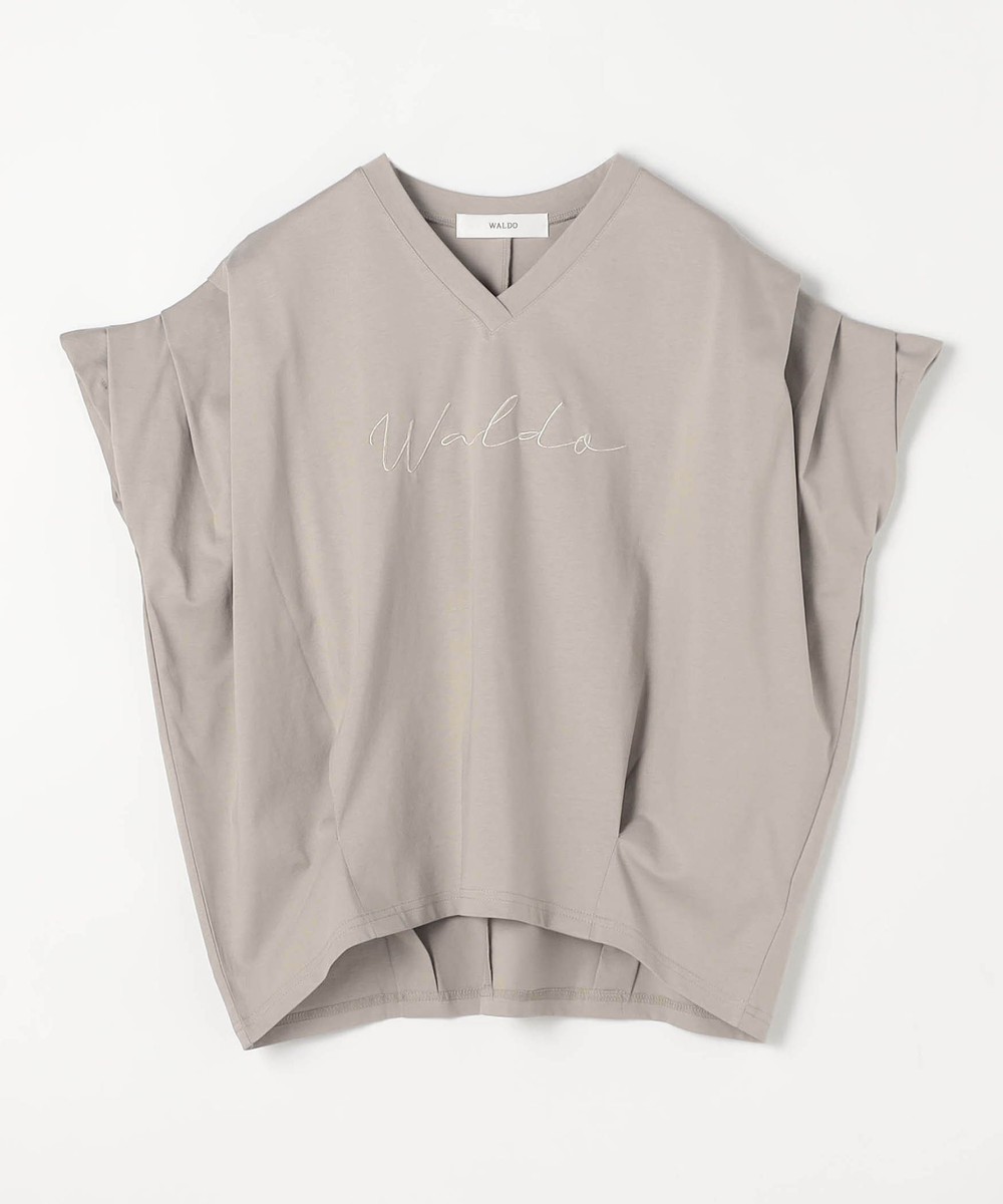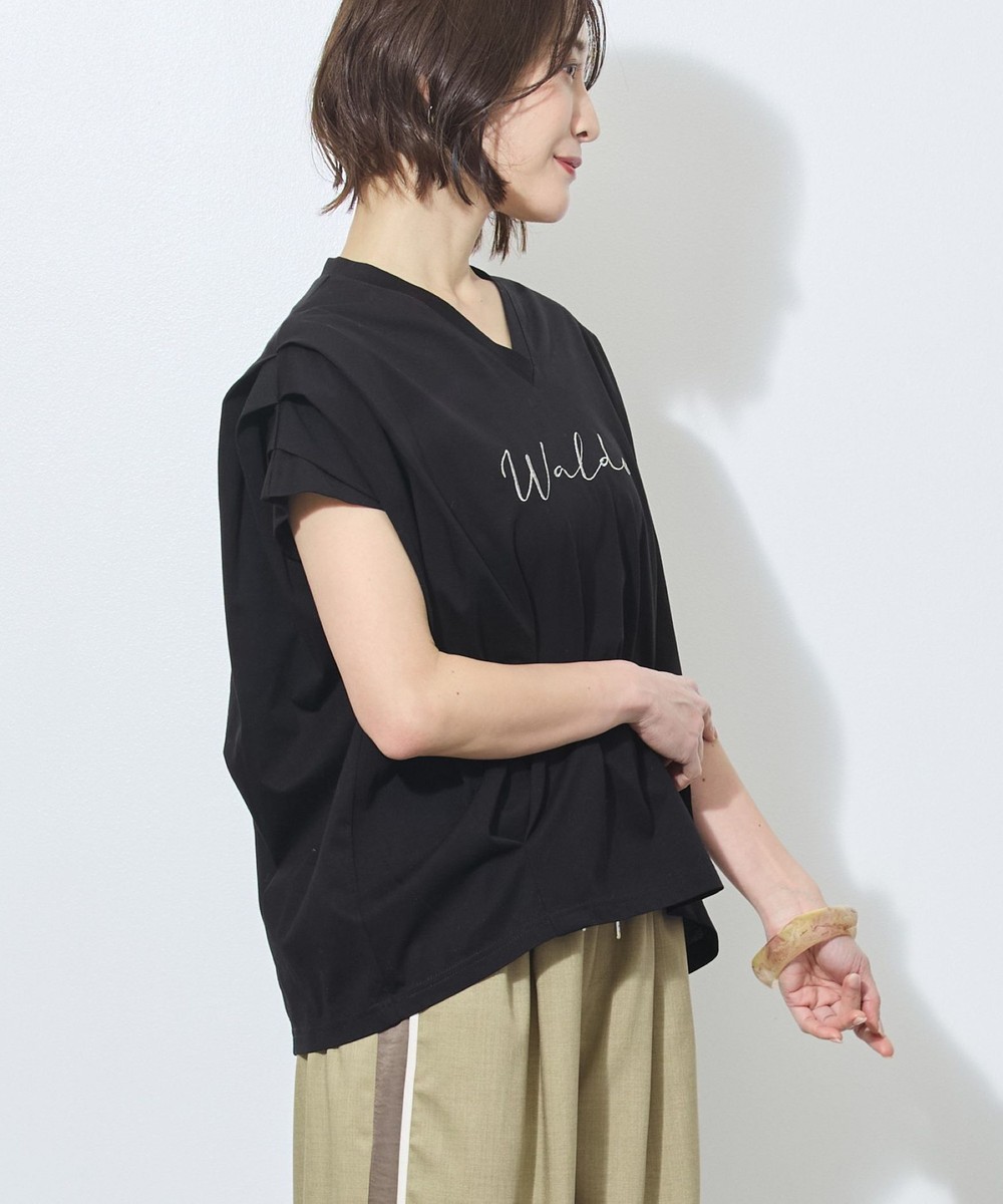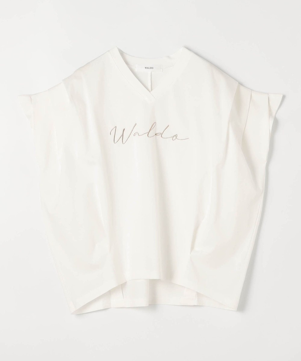 胸のロゴ刺繍は淡いゴールドの筆記体で、女性らしさを感じさせ、カジュアルになりすぎないのが◎。