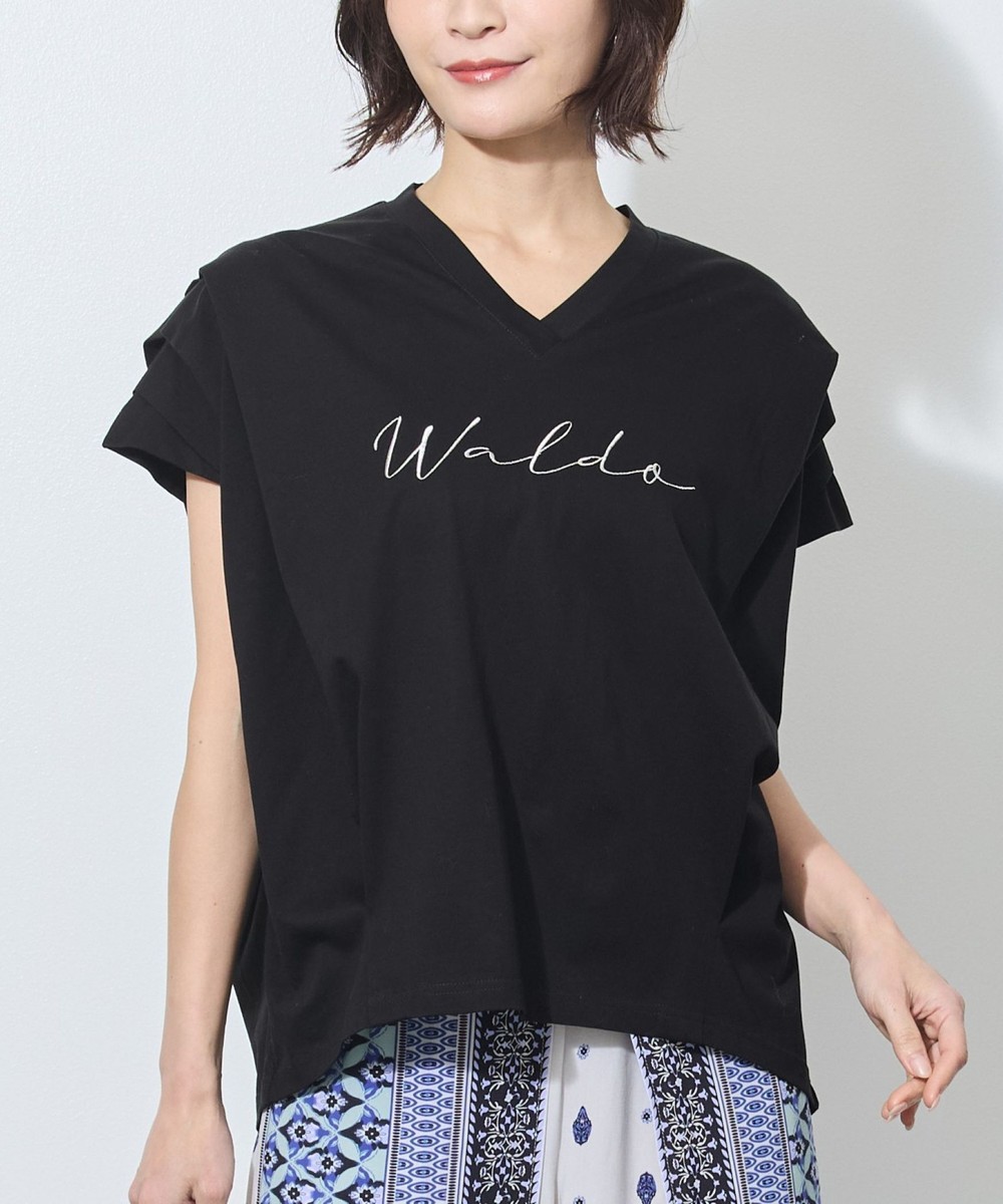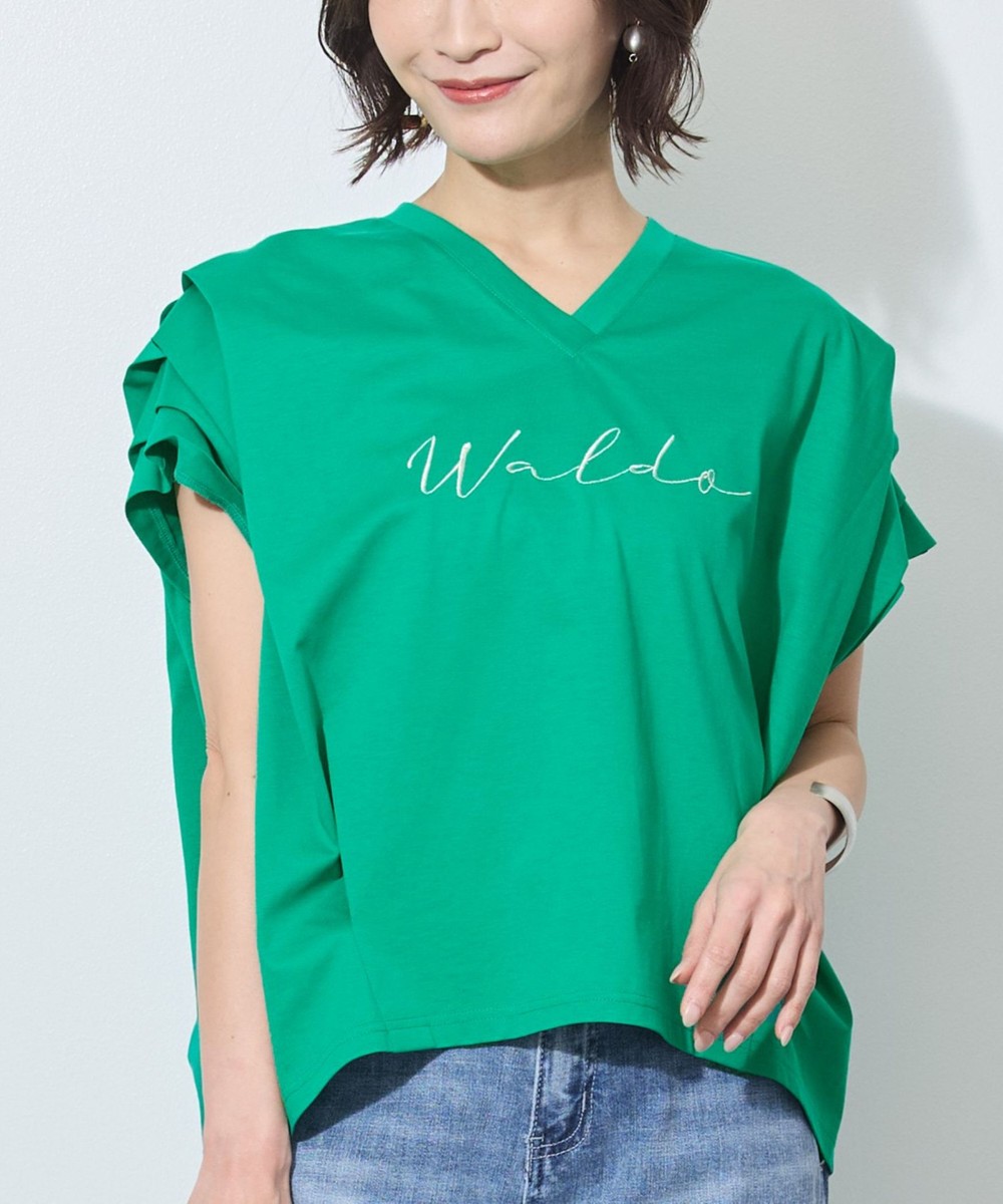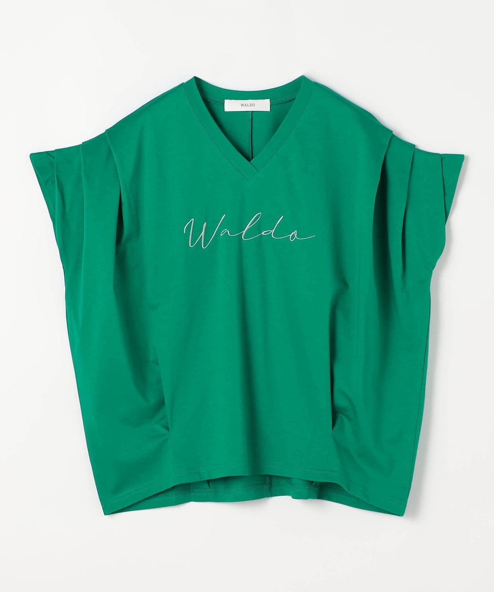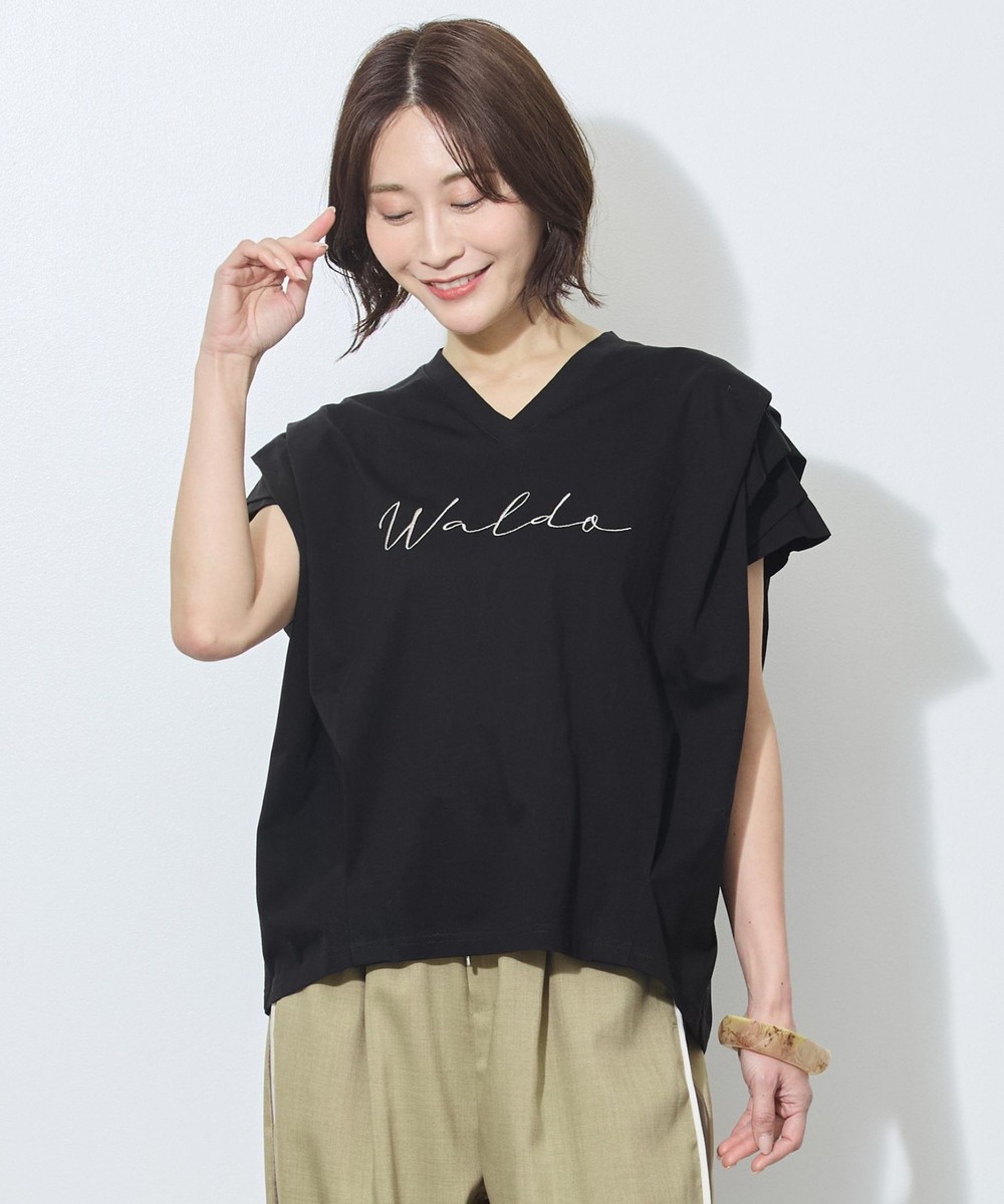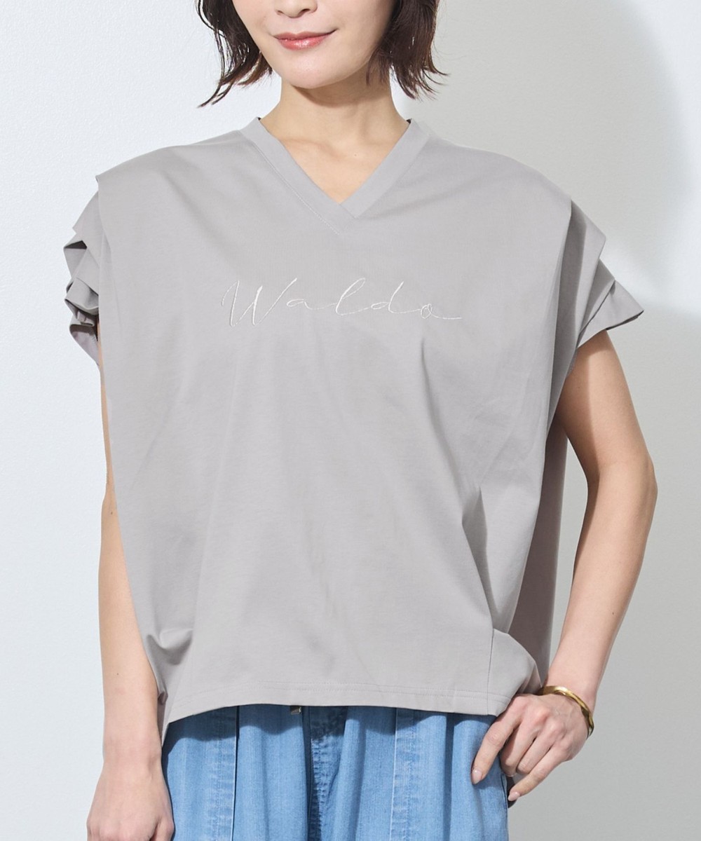 胸のロゴ刺繍は淡いゴールドの筆記体で、女性らしさを感じさせ、カジュアルになりすぎないのが◎。