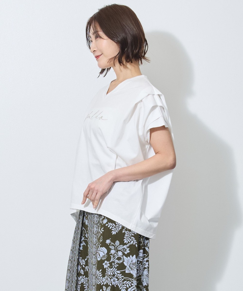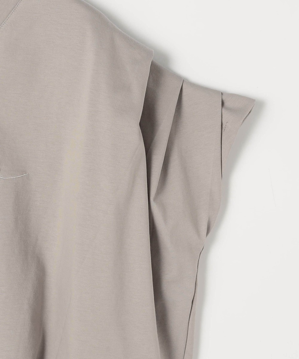 顔周りをスッキリと見せる浅めのVネックと、裾にタックをとったコクーンシルエットが特徴的。