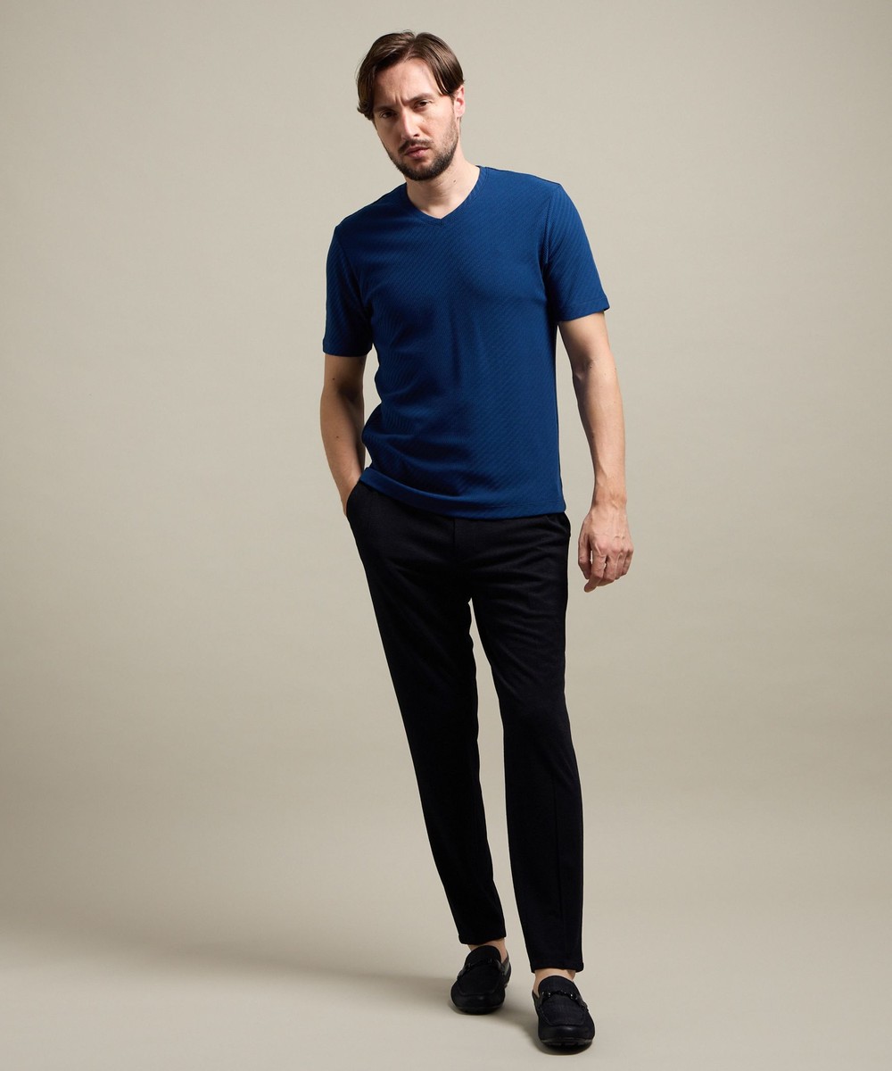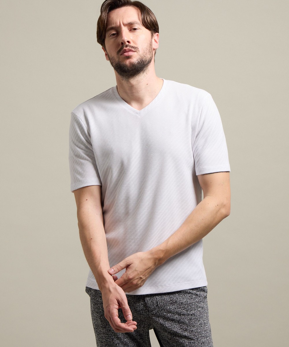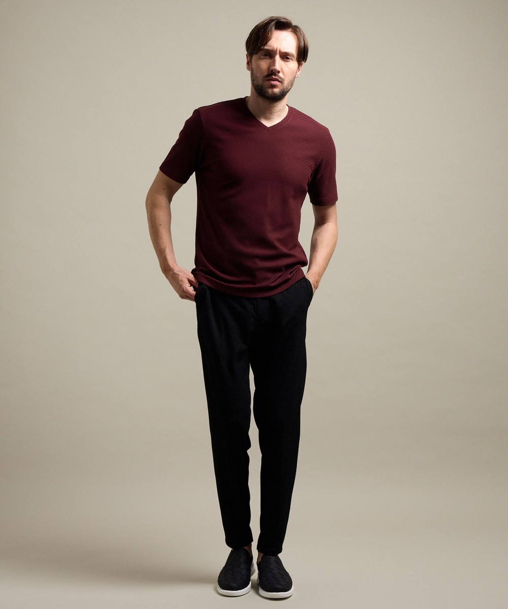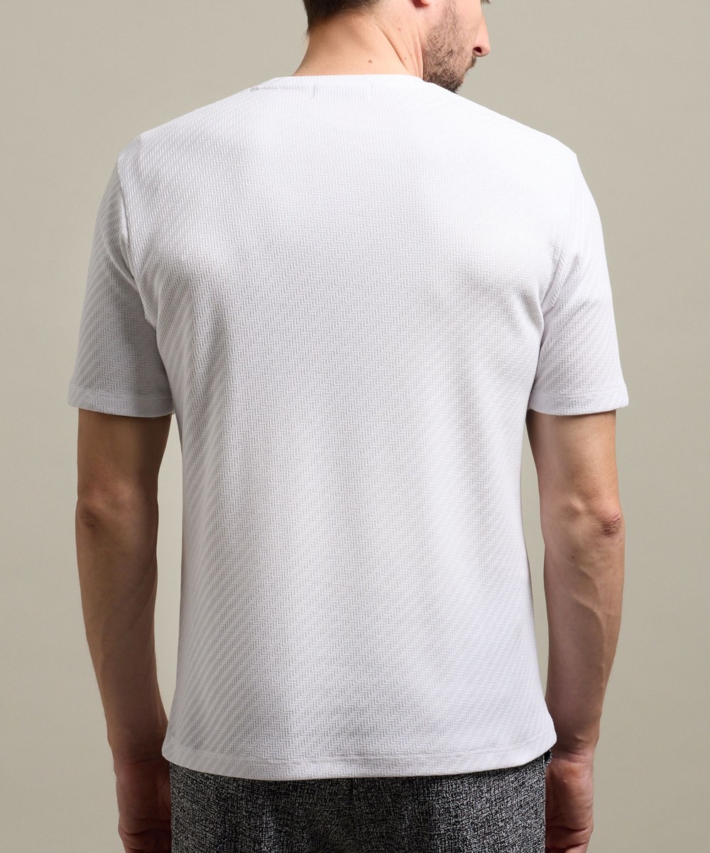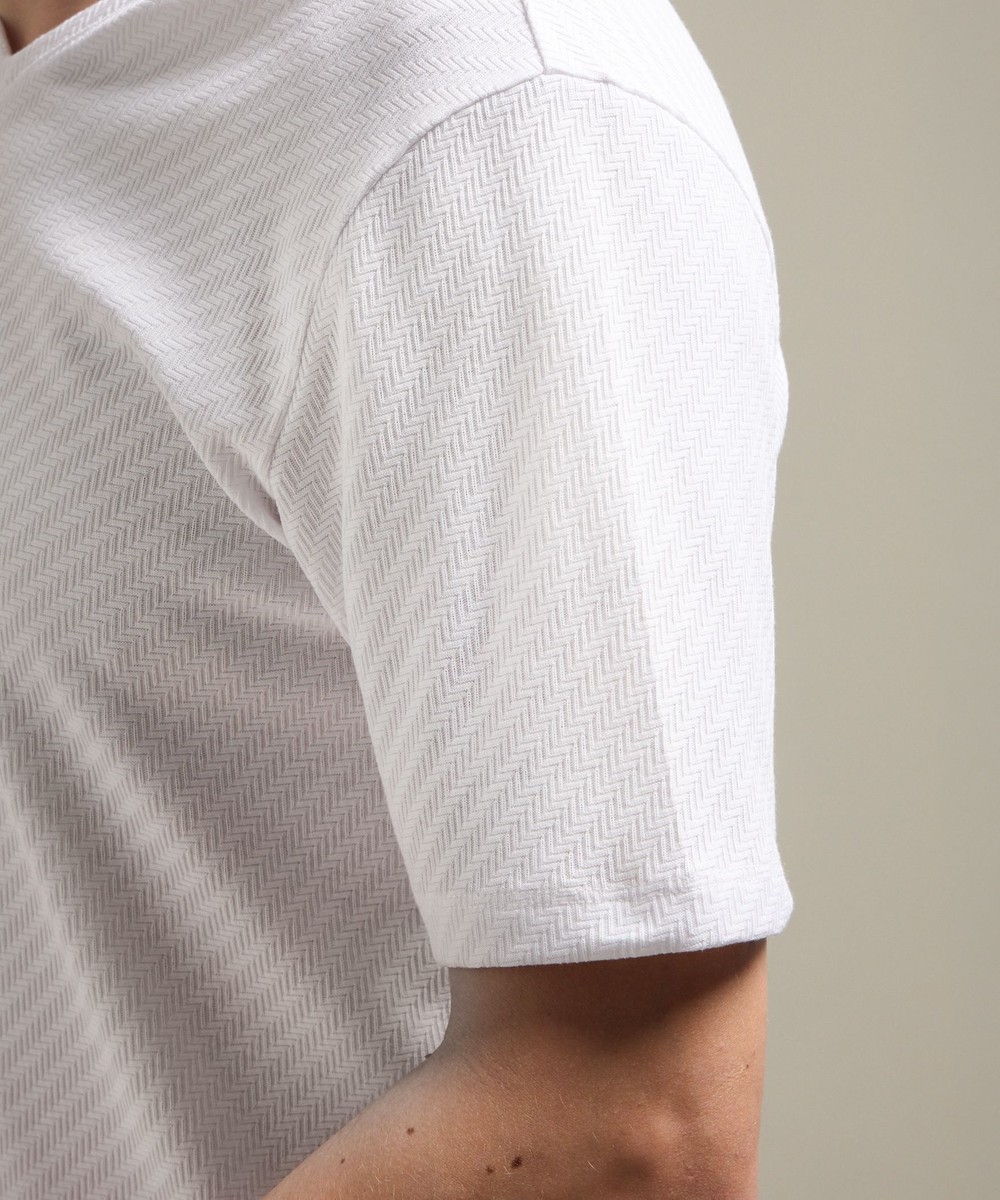 オリジナル矢羽根柄ジャカード生地を使用した、浅めのVネック半袖プルオーバーになります。