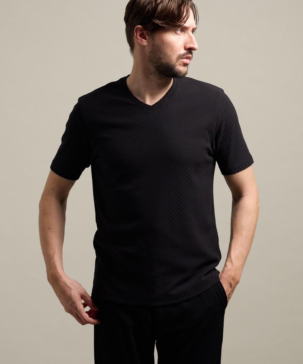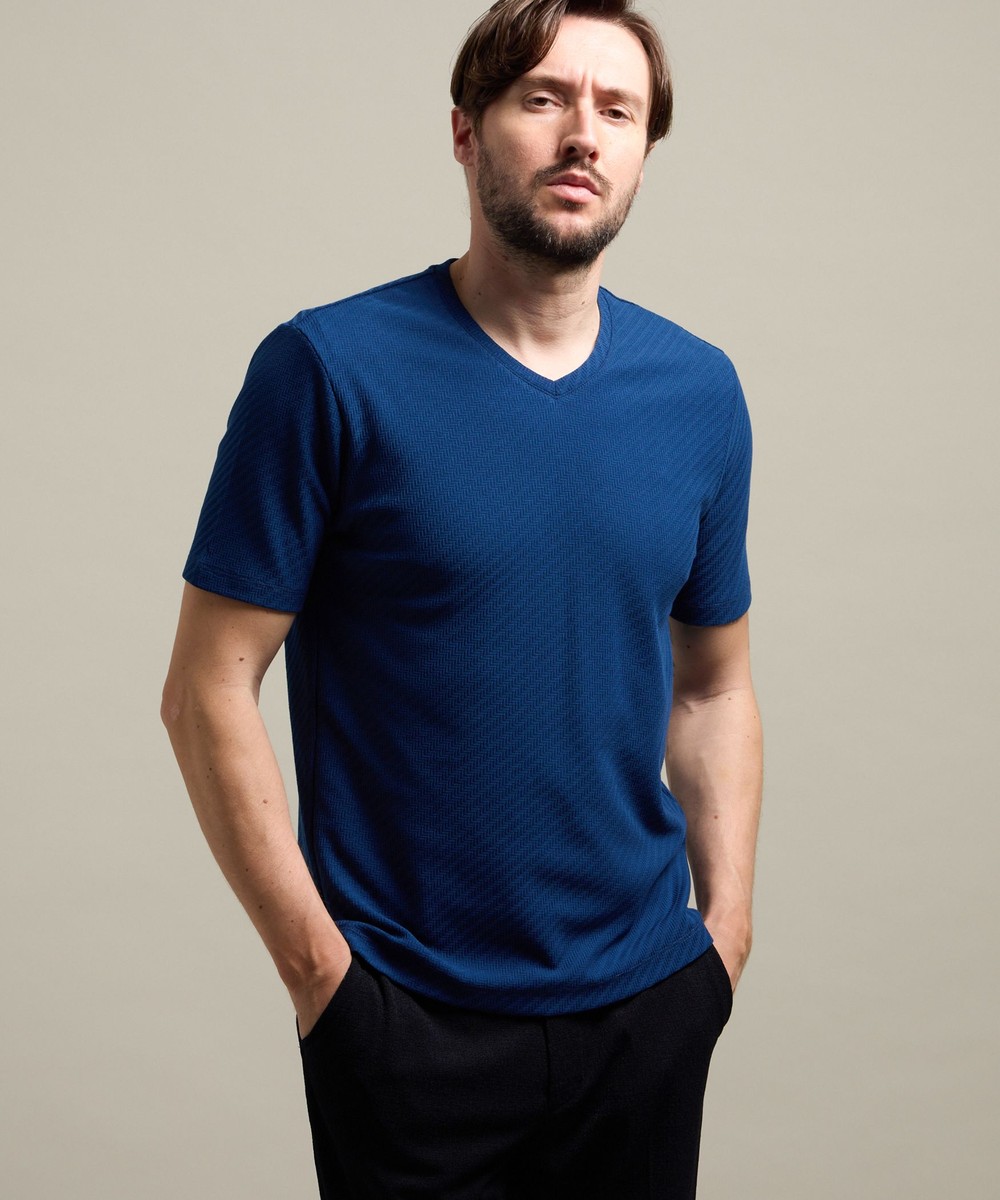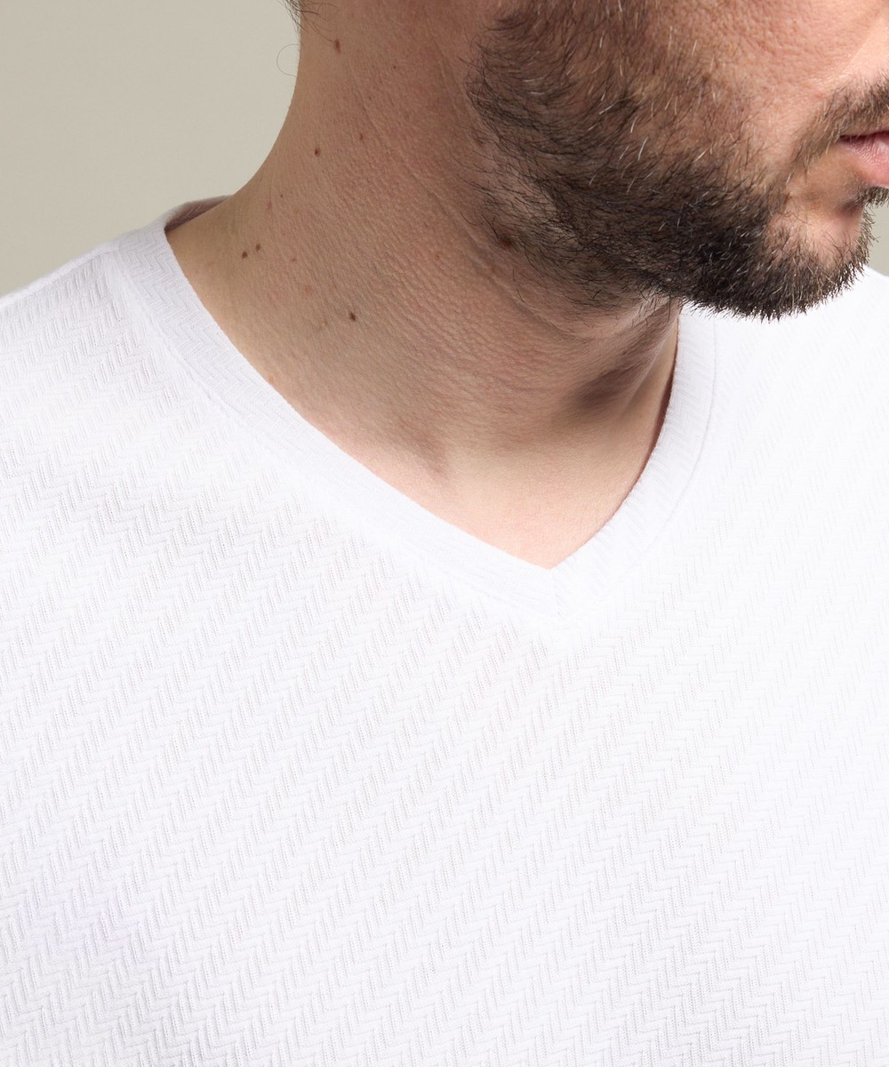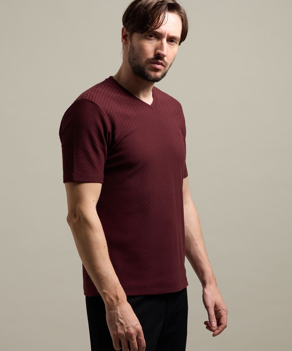 オリジナル矢羽根柄ジャカード生地を使用した、浅めのVネック半袖プルオーバーになります。