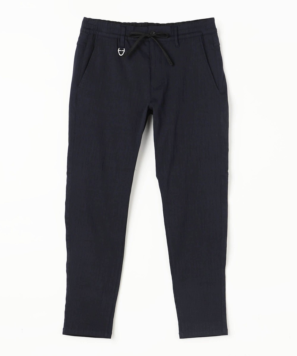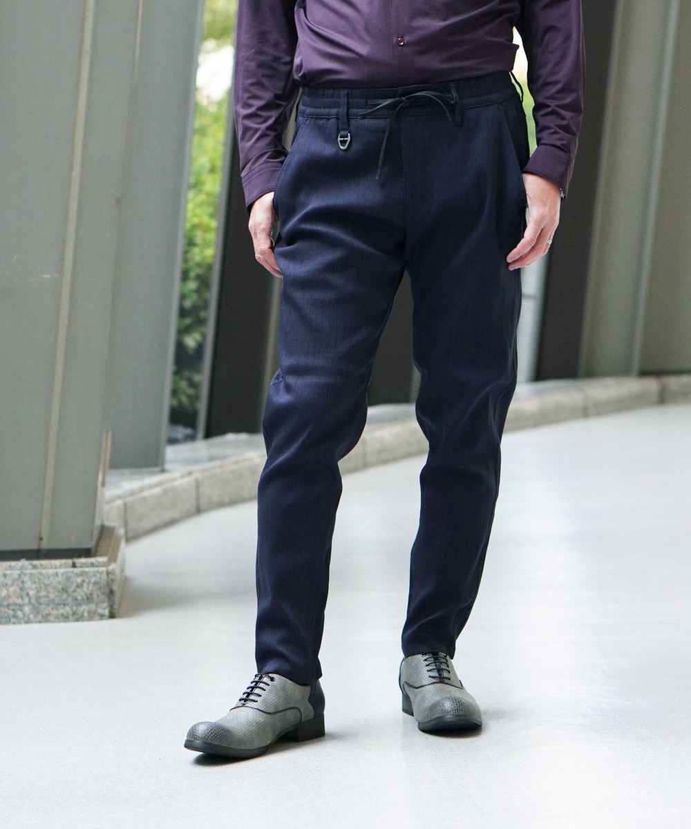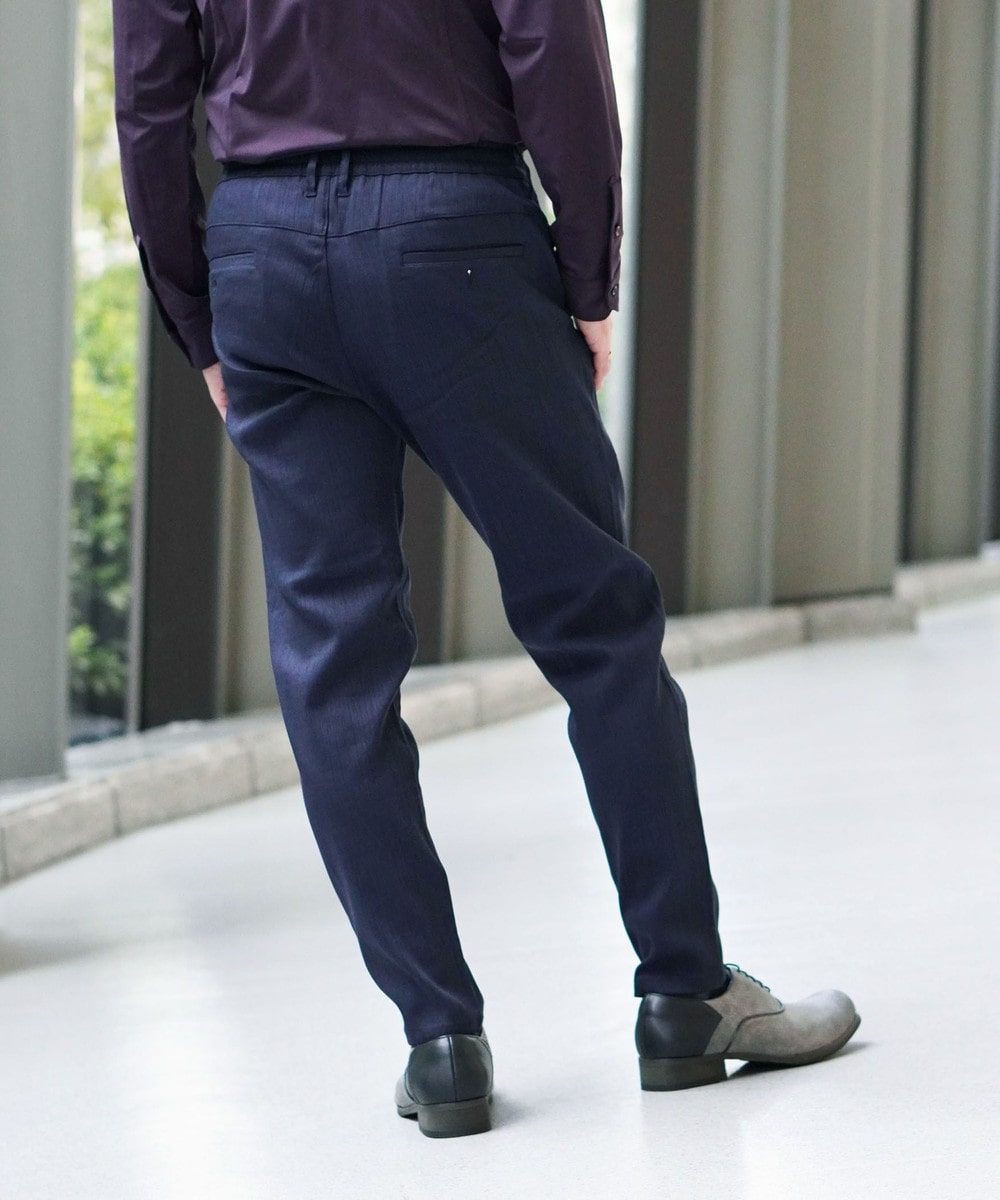ウエストベルトに平ゴムを入れたスラックスライクデザインのイージーパンツです。ヒップ廻りに大きくゆとりをつけ、裾口を細く設定してテーパート゛感を強くしたデザインパンツです。