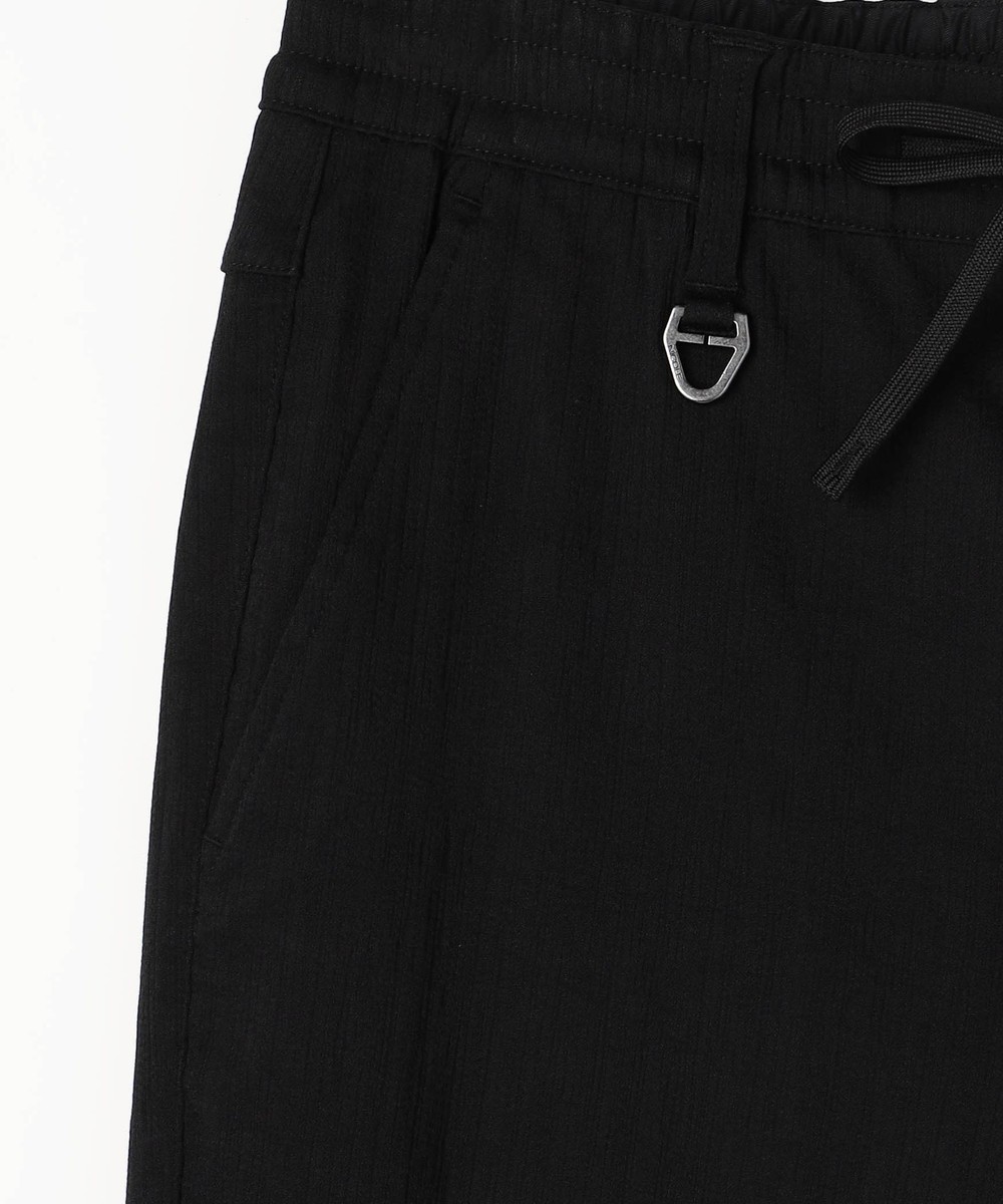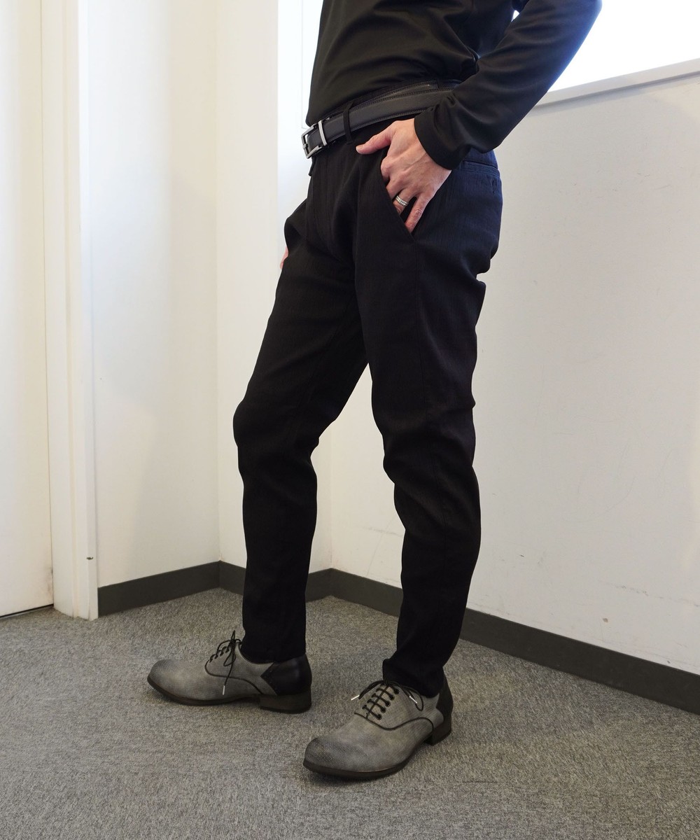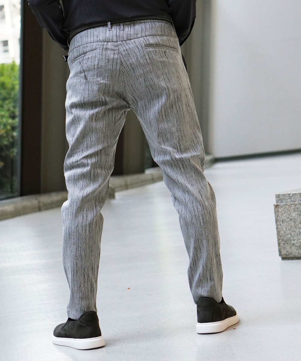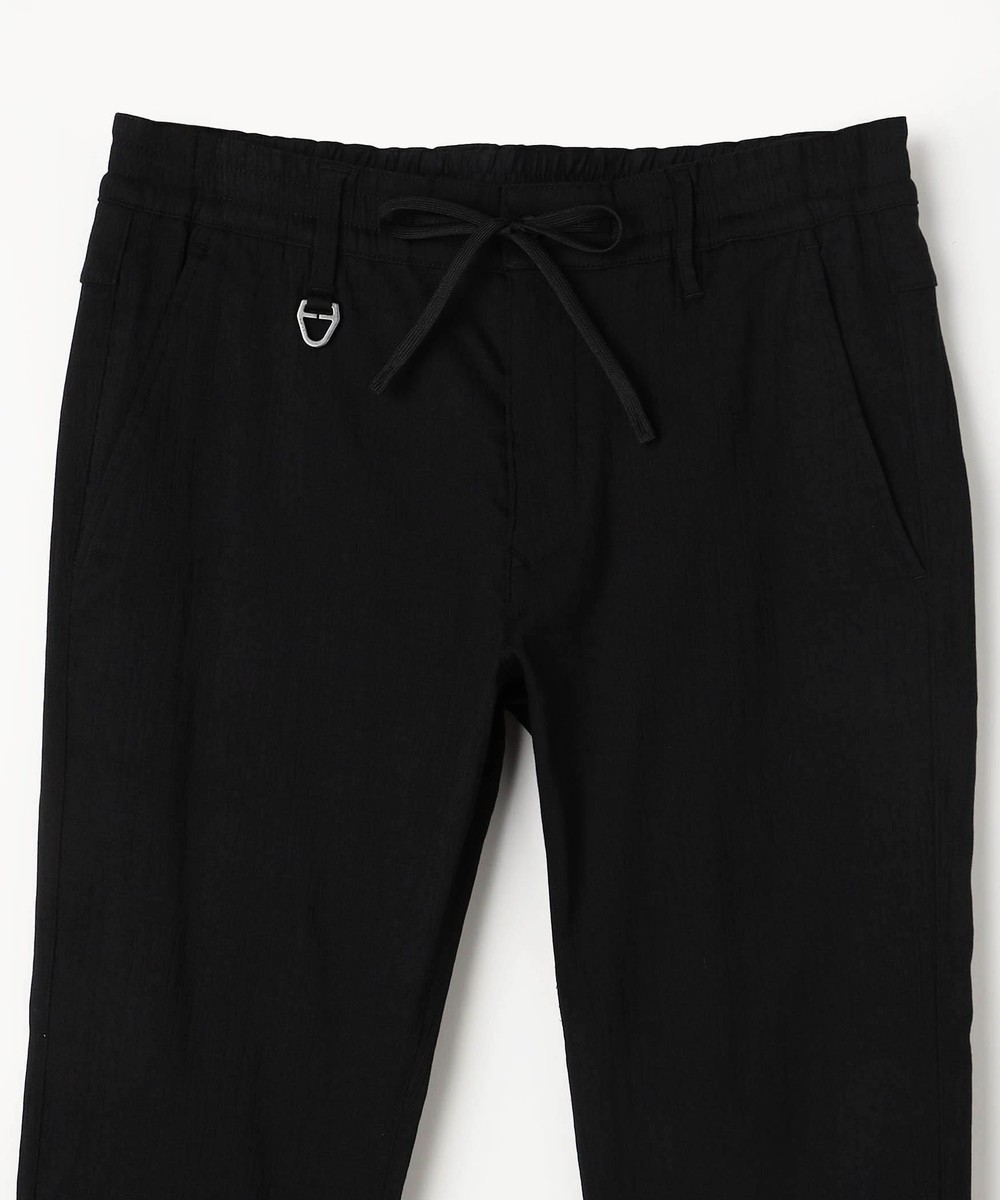 ウエストベルトに平ゴムを入れたスラックスライクデザインのイージーパンツです。ヒップ廻りに大きくゆとりをつけ、裾口を細く設定してテーパート゛感を強くしたデザインパンツです。