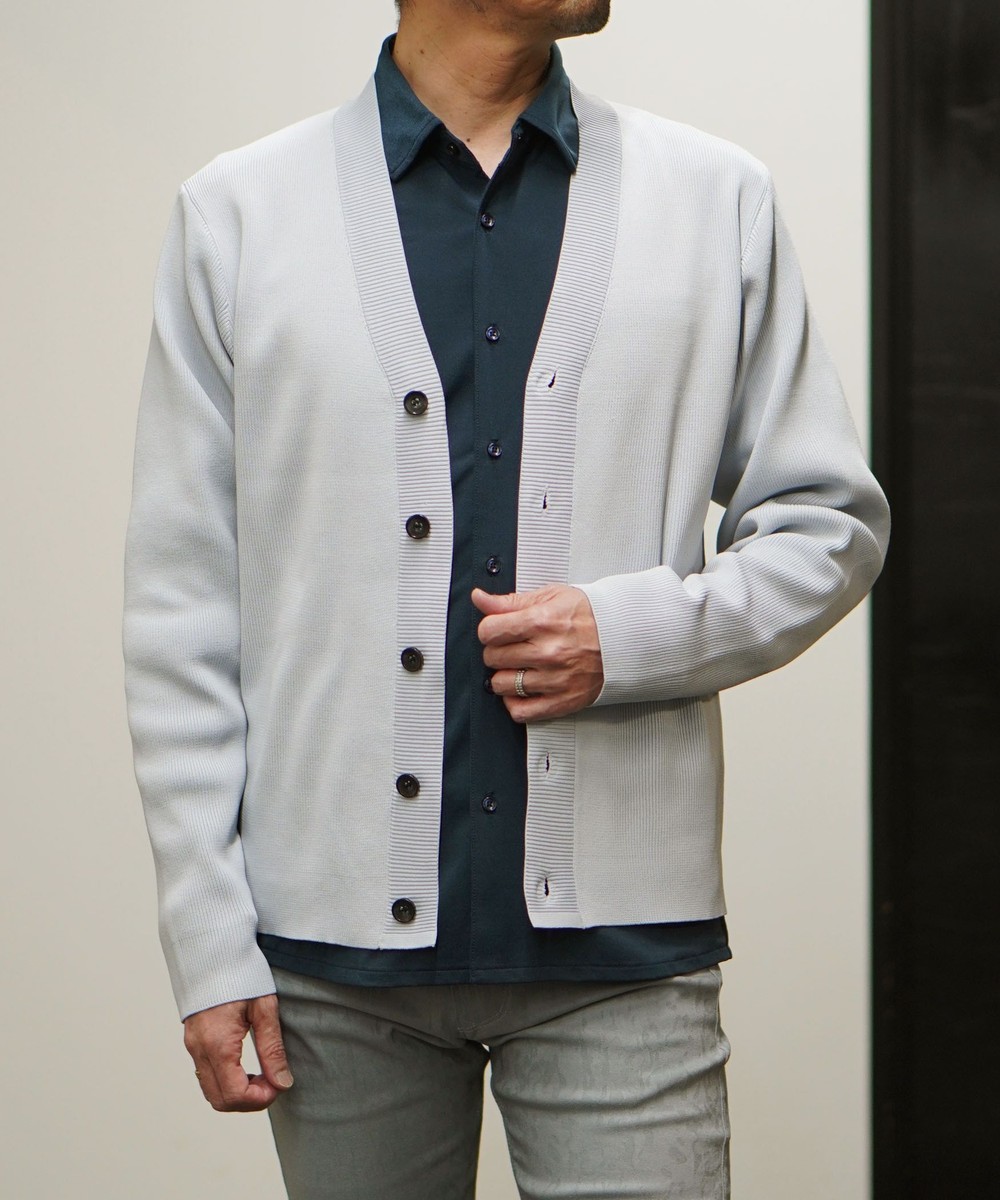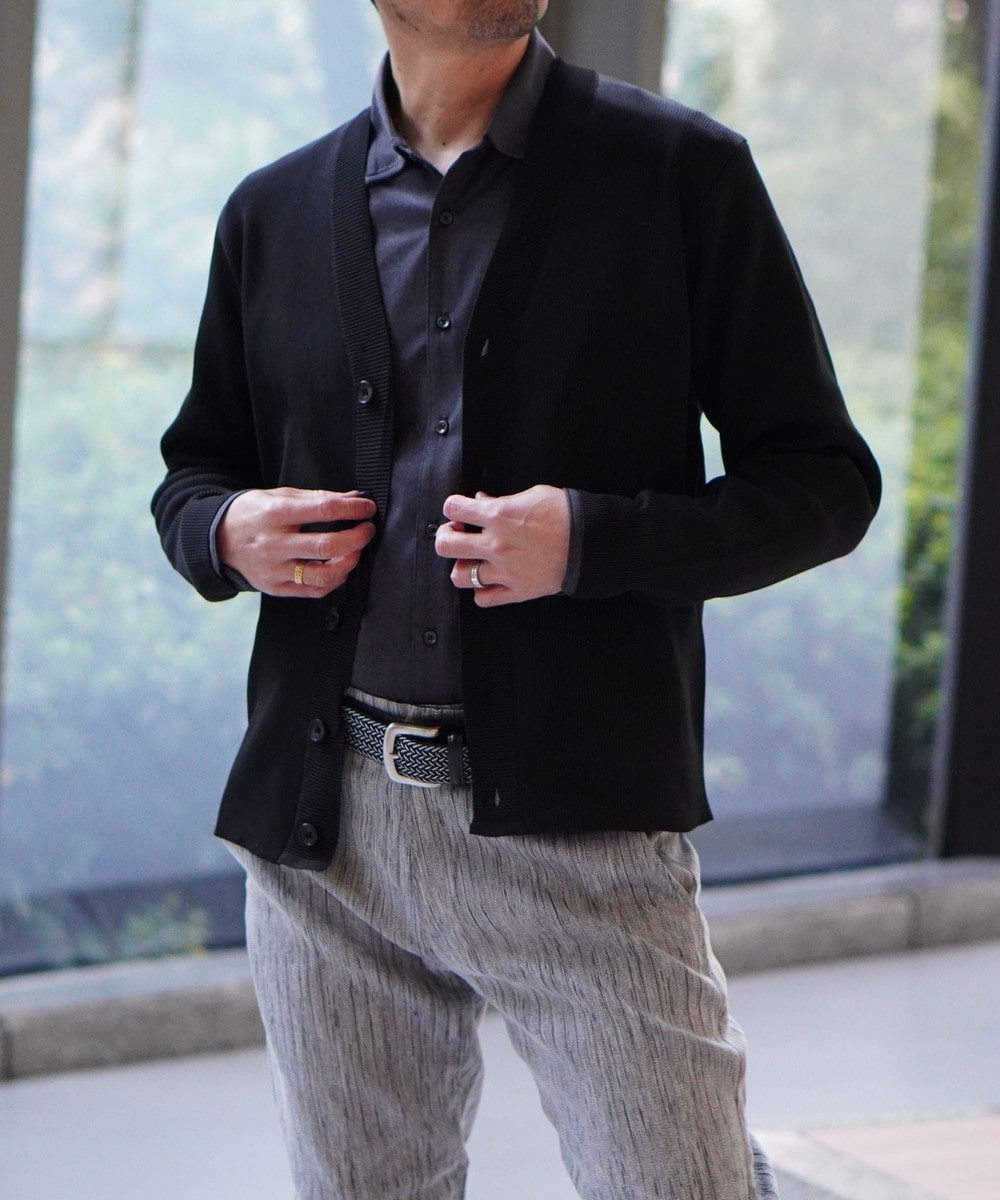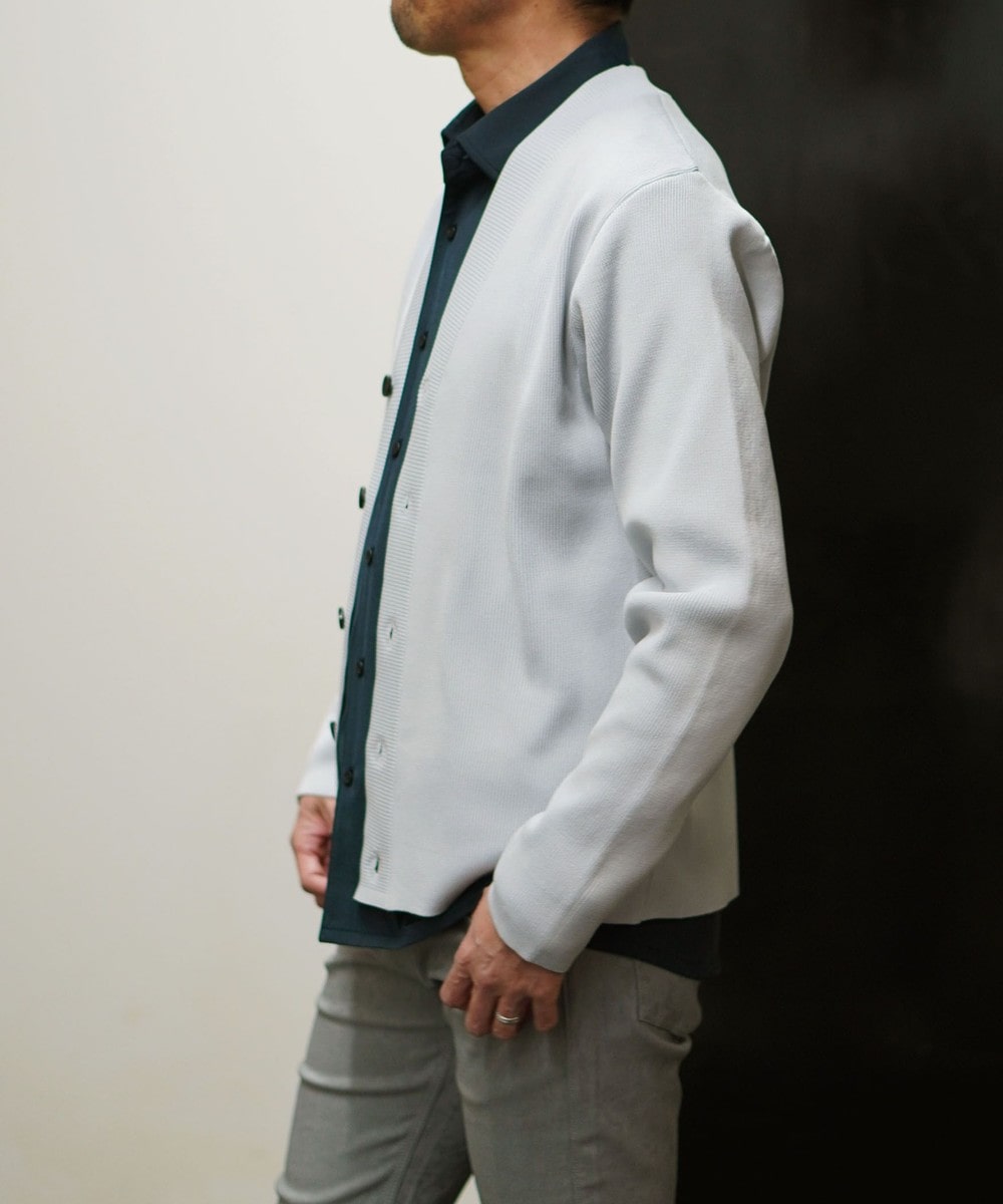 高収縮ポリエステル糸を使用し14ゲージというハイゲージで編み立てたカーディガンになります。