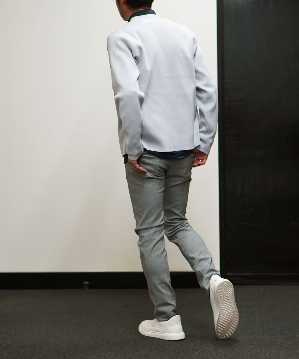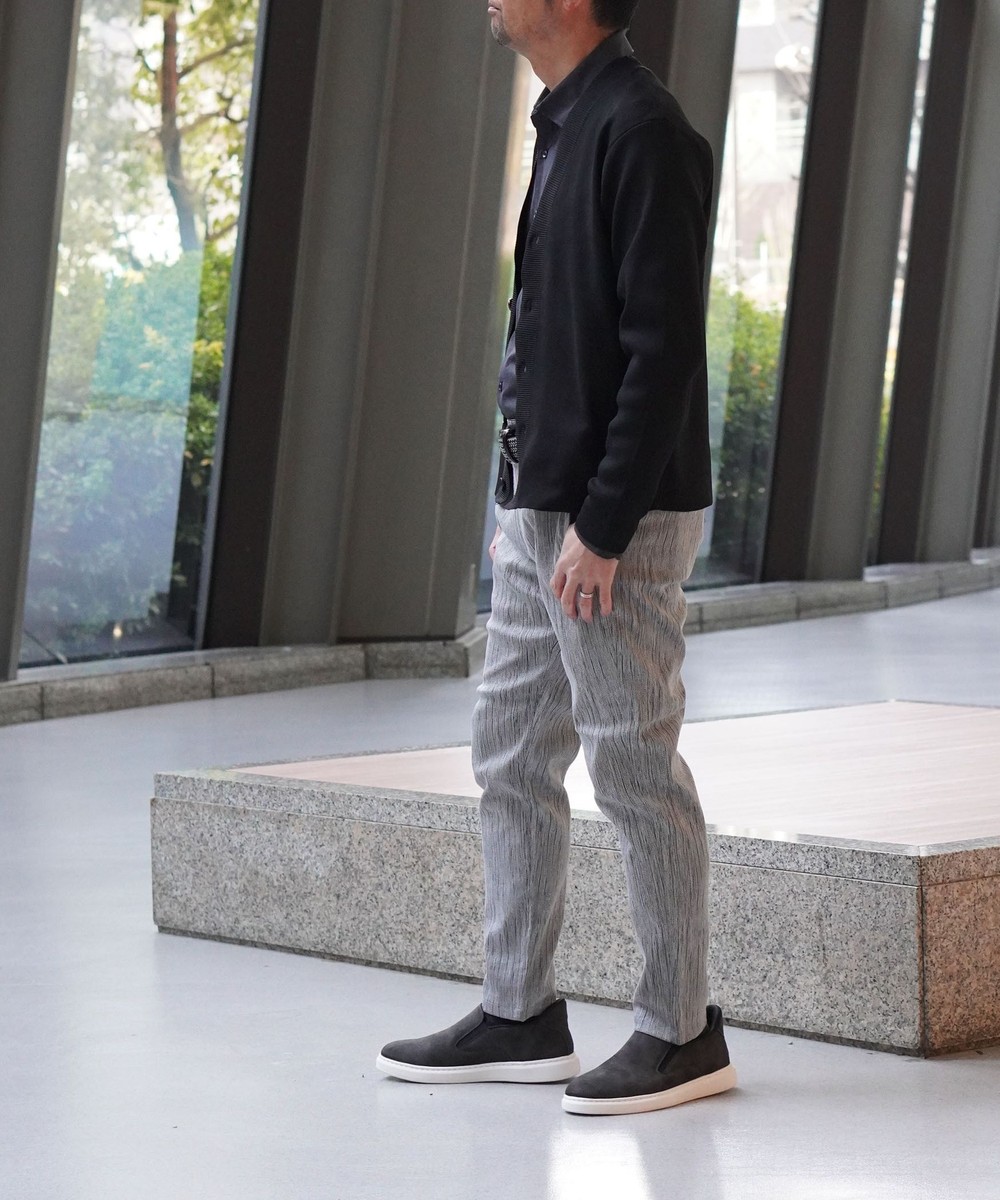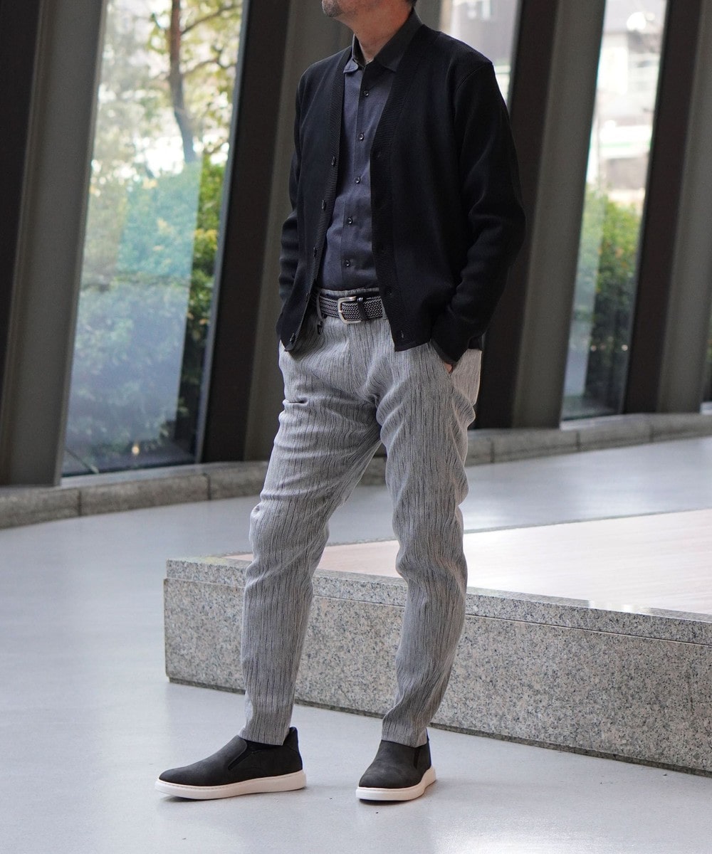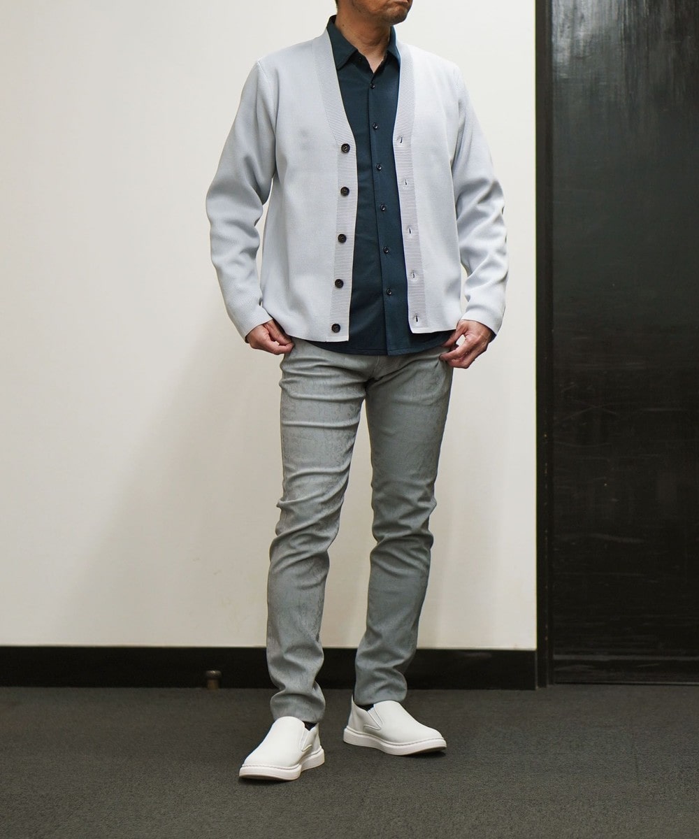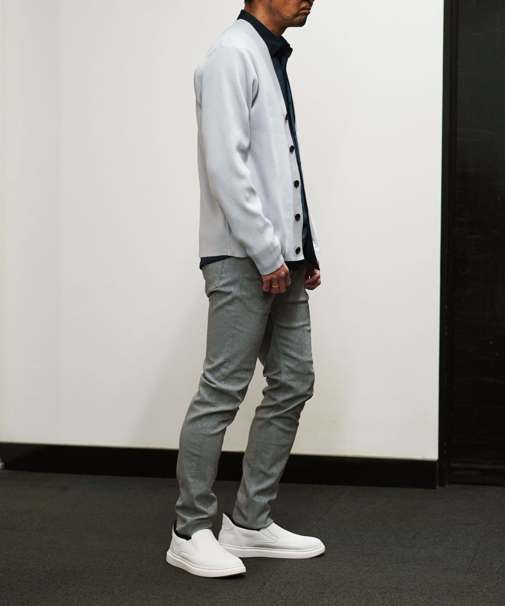 形態安定性に優れたポリエステル糸を使用。軽量かつニットならではのストレッチ性にも優れ、長時間の着用でも疲れにくいストレスフリーな素材です。シワになりにくく洗濯後の乾きも早いイージーケア性も兼ね備えています。