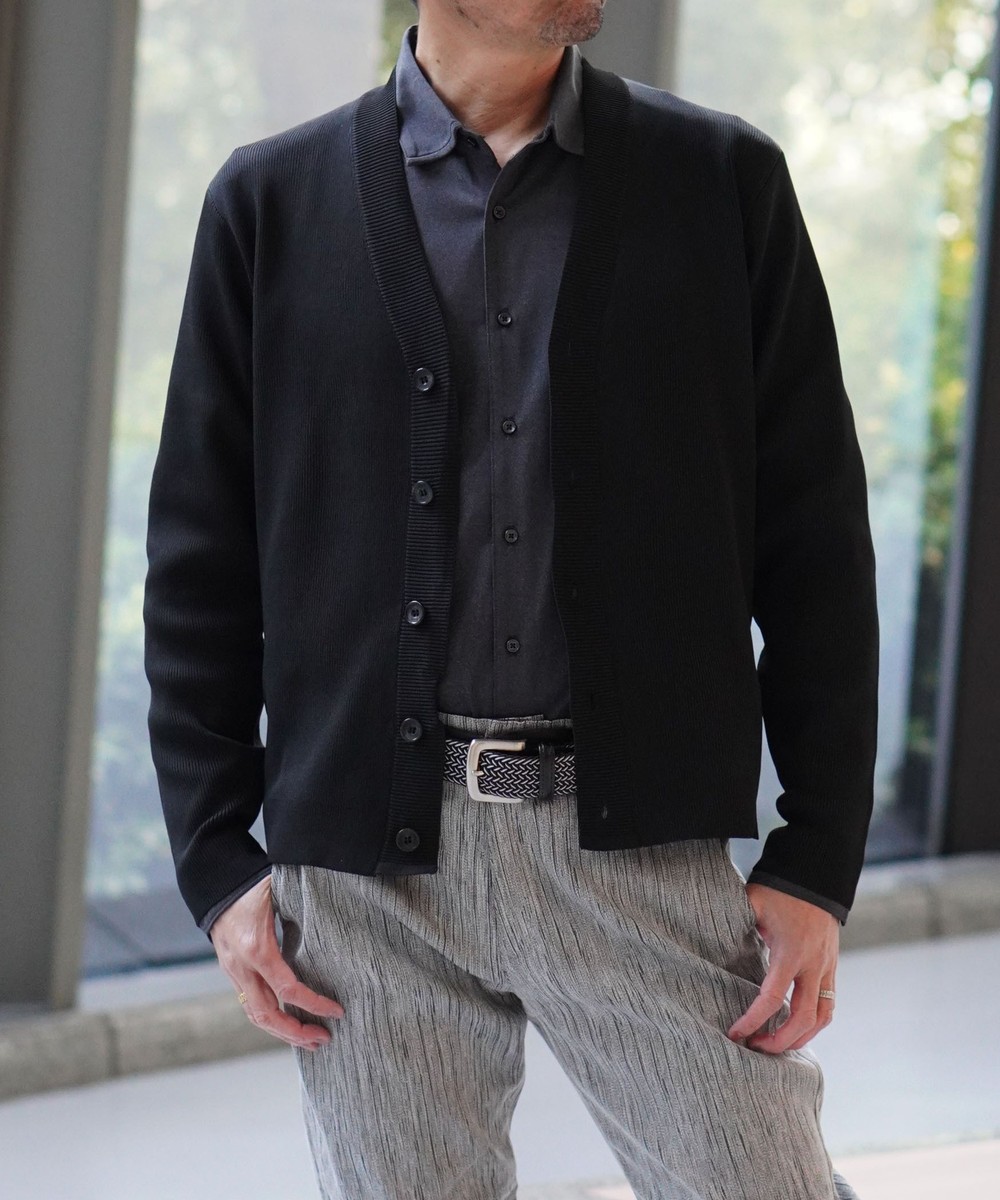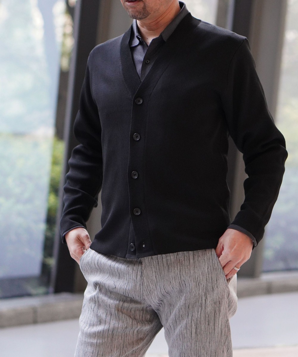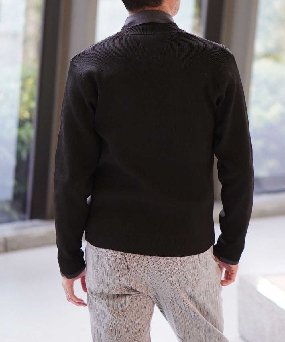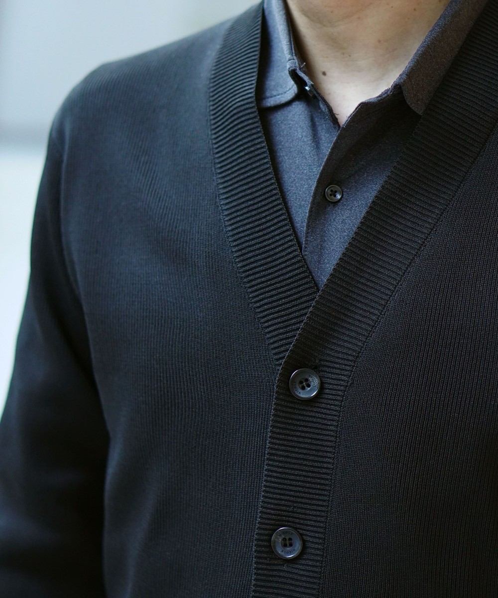細やかな1×1リブで編み立てることでシャープな印象を演出。ブランドロゴ入釦を使用し高級感ある1着となっています。