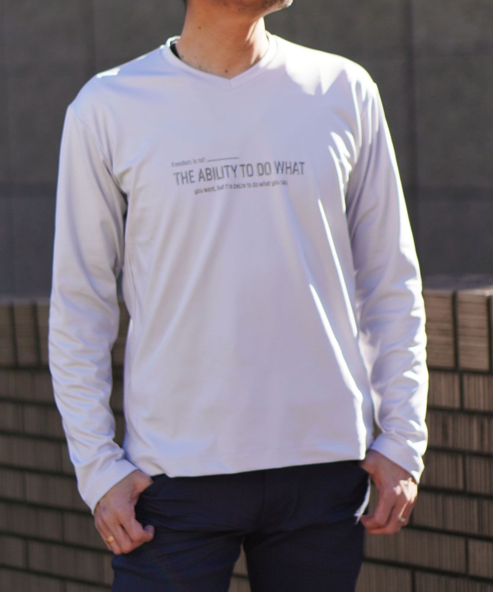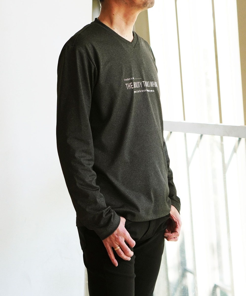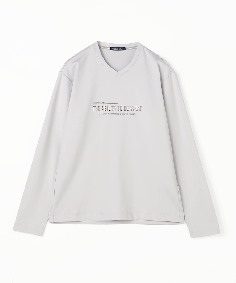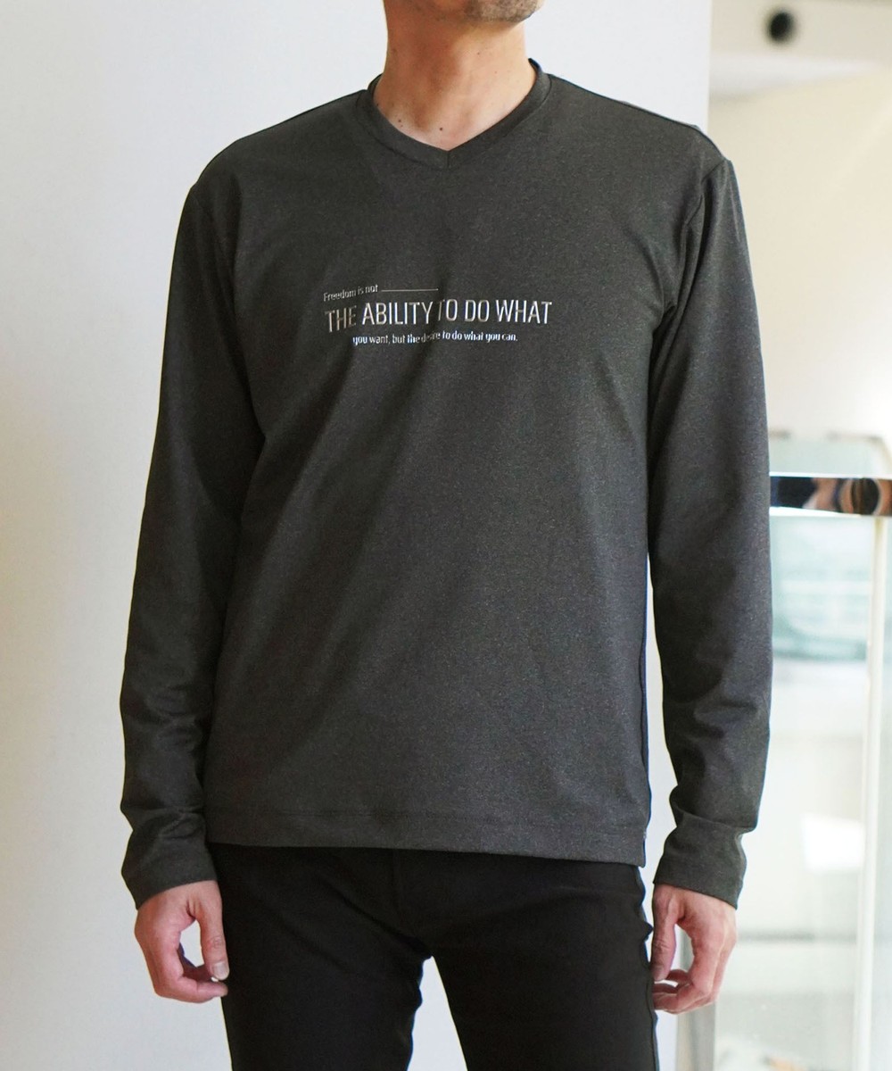 シャープな印象をあたえるメタルジェルプリントが特徴のVネック長袖Tシャツになります。