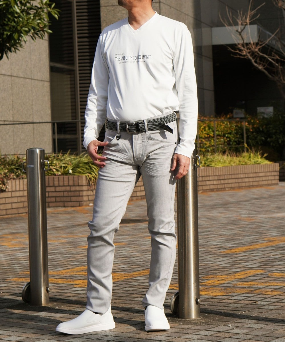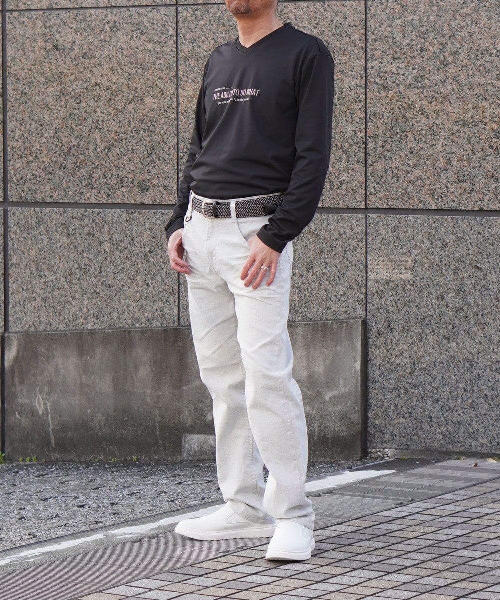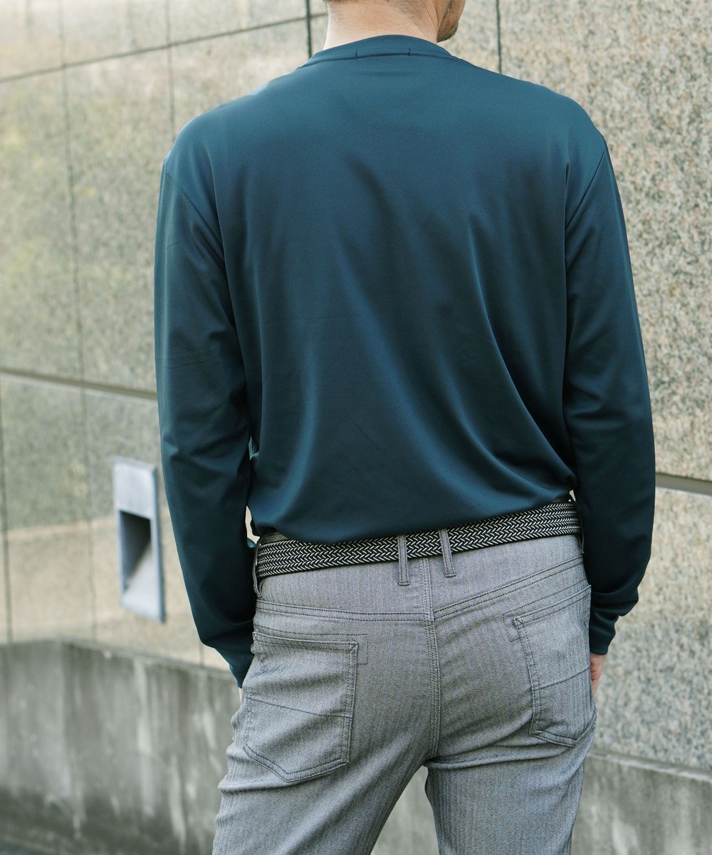 シルエットを綺麗に見せるハリ感とストレッチ性に優れるポンチ素材を採用しています。接触冷感後加工を施し、酷暑の夏でも快適な風合いに仕上げました。