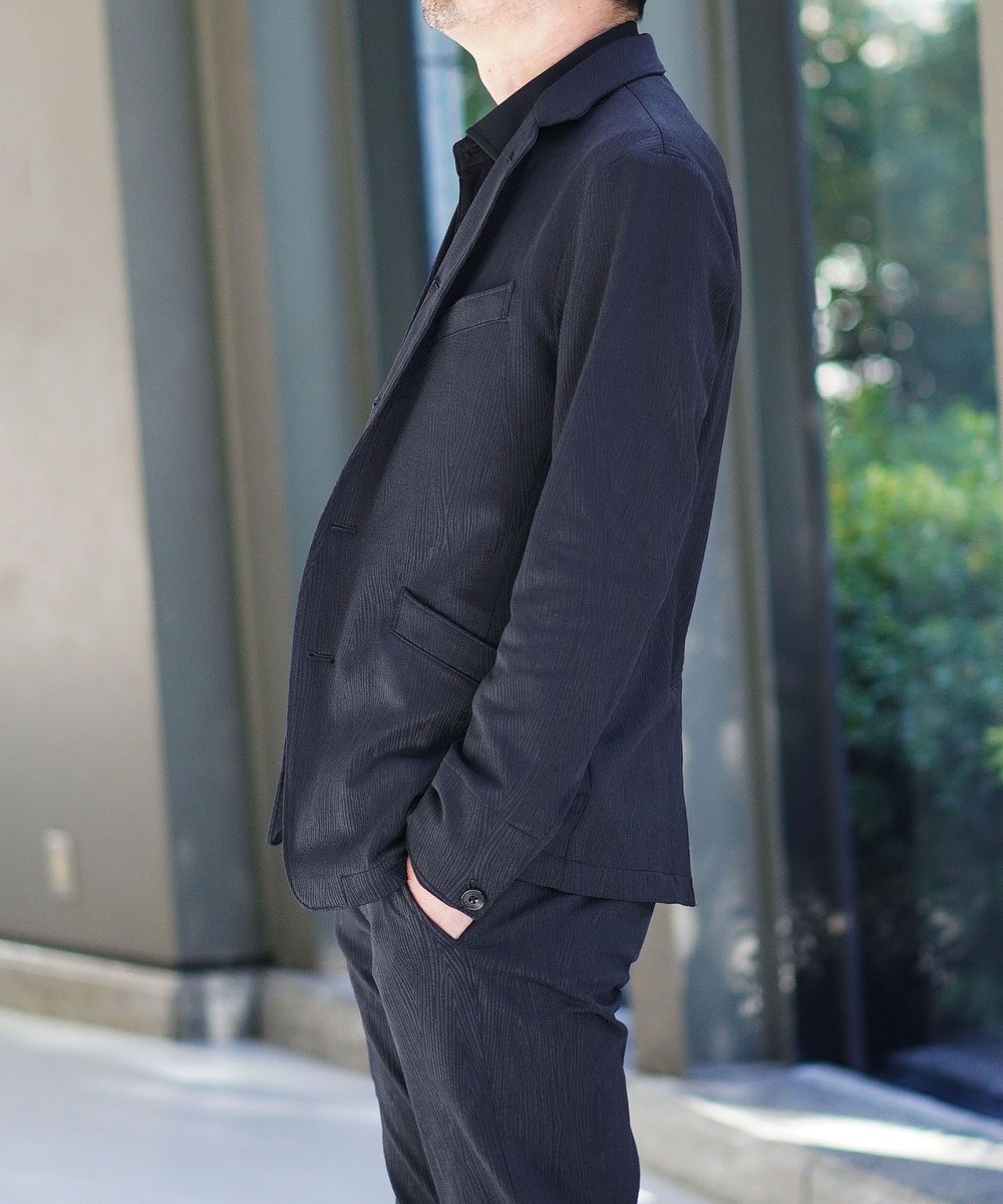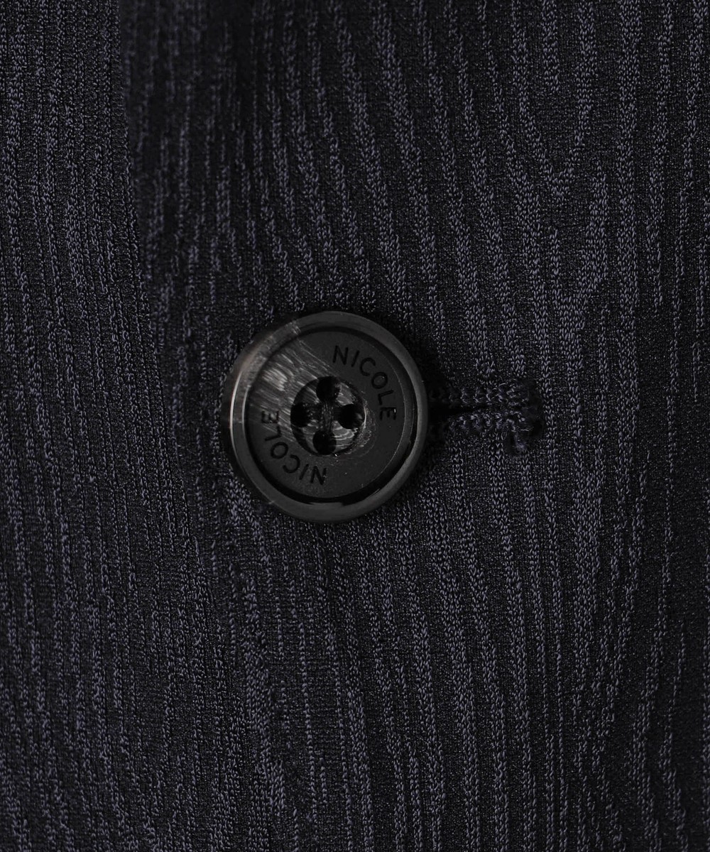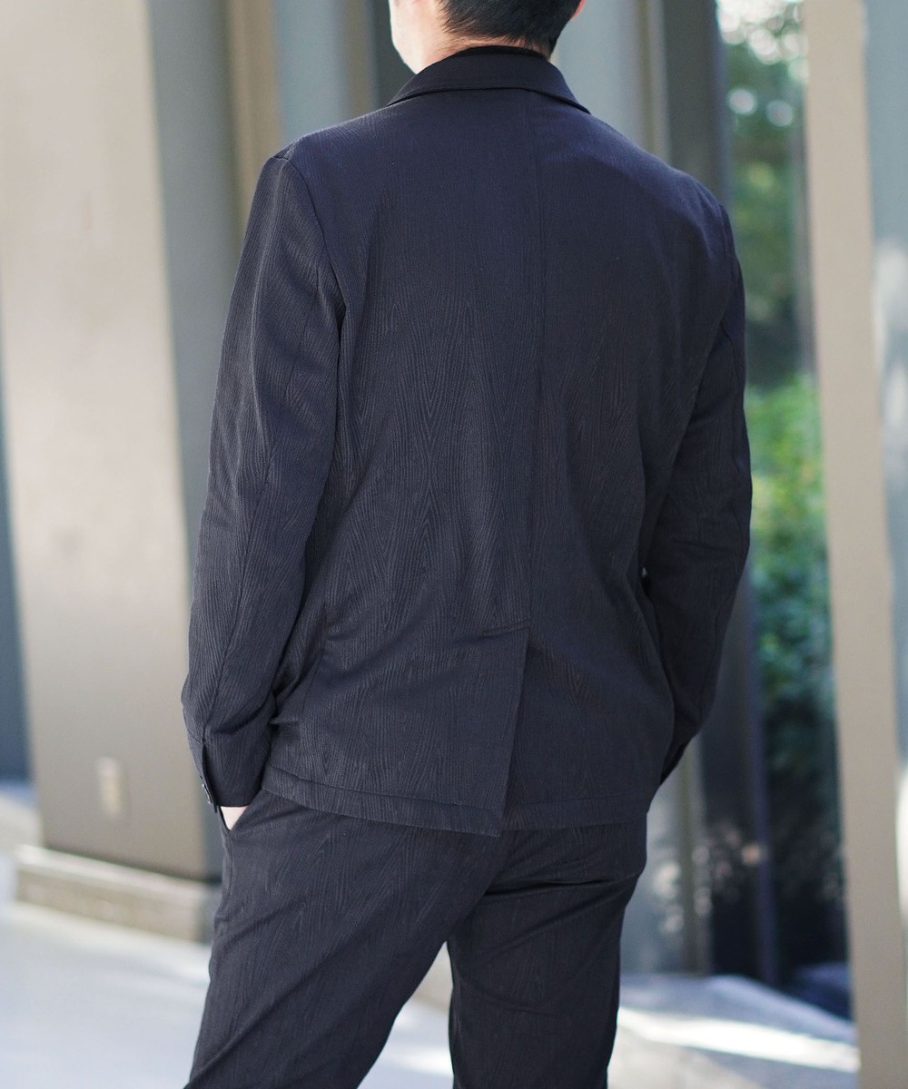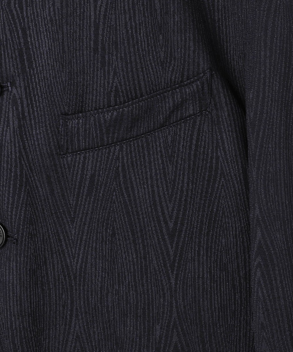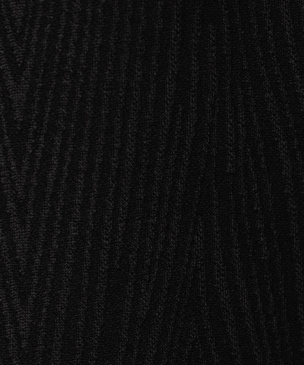 カットソー地柄ジャカード素材を使用。ポリエステル糸の光沢と素材の凹凸感により、光の加減で柄ガ見え隠れする印象的な素材です