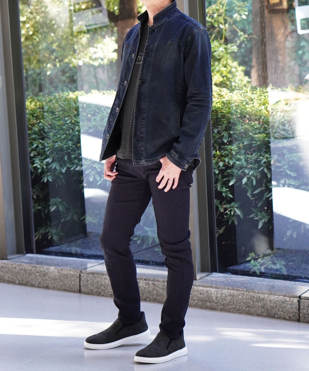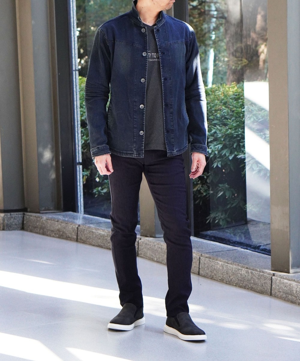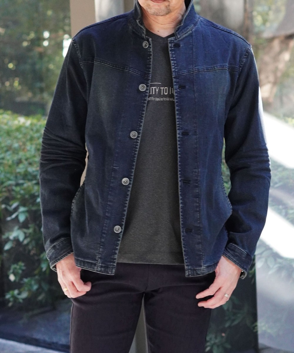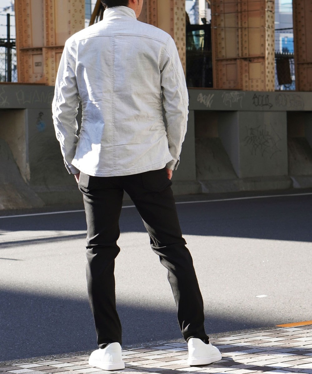 フロント、カフスにはブランドロゴ入り釦を使用し高級感を出し素材と加工で大人カジュアルなアイテムに仕上げています。