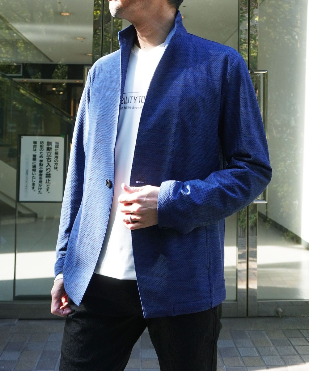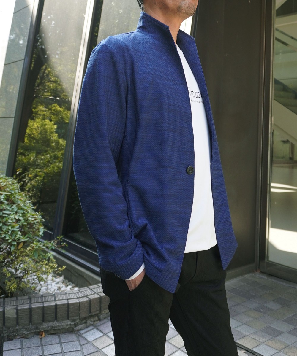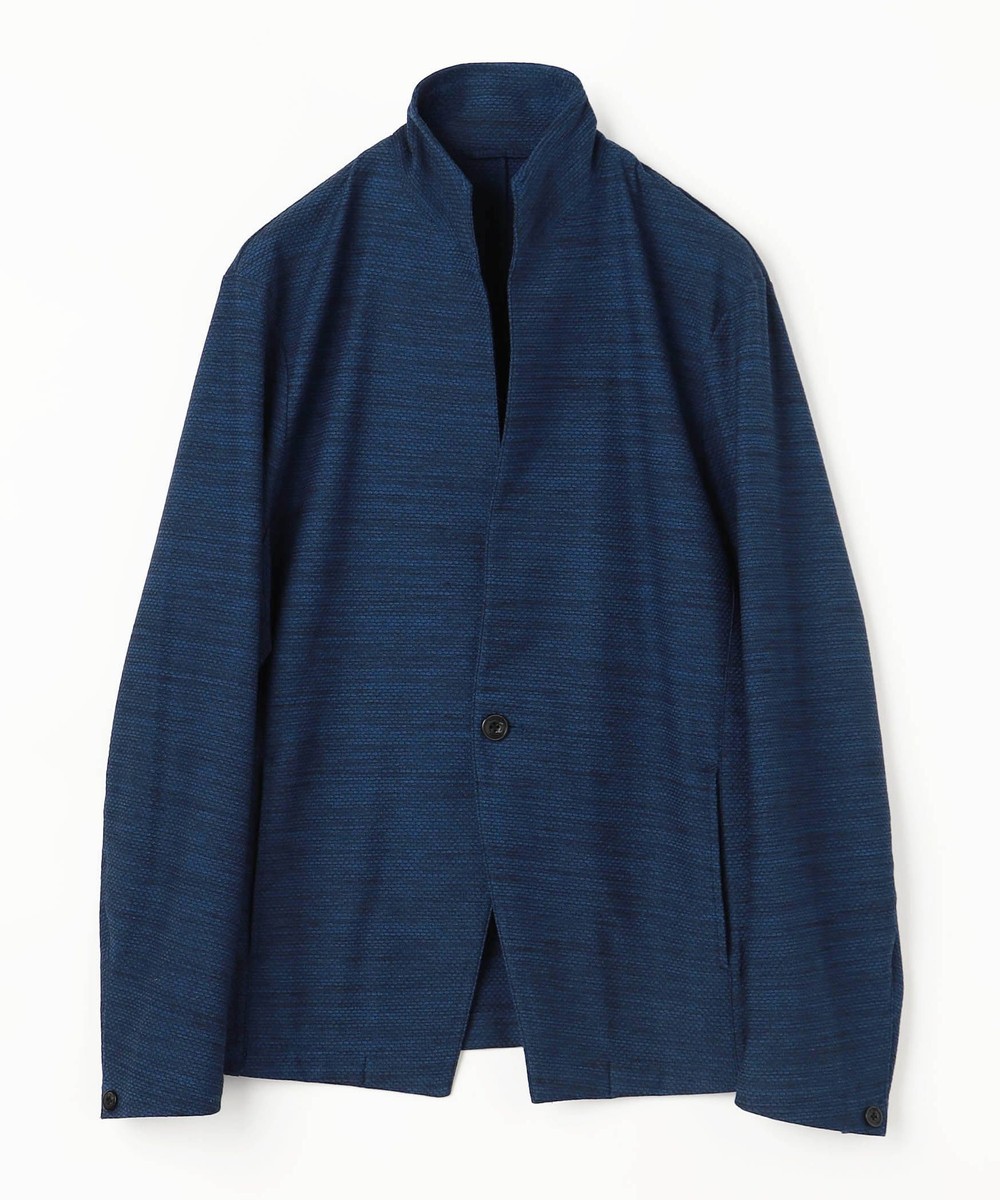 衿からフロントカットは直線的なエッジを効かせたスタンドカラージャケットとなります。