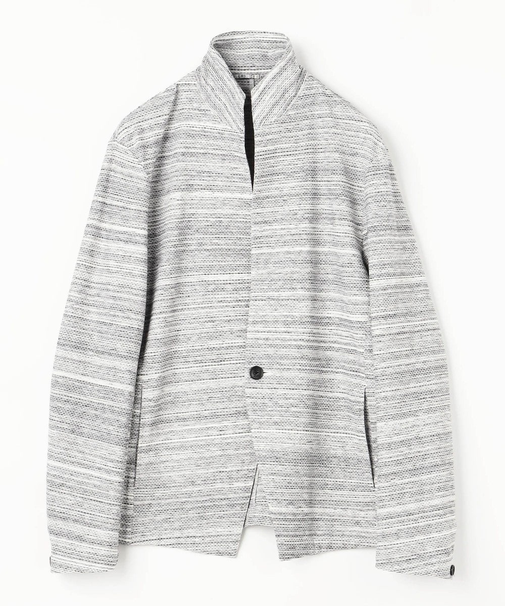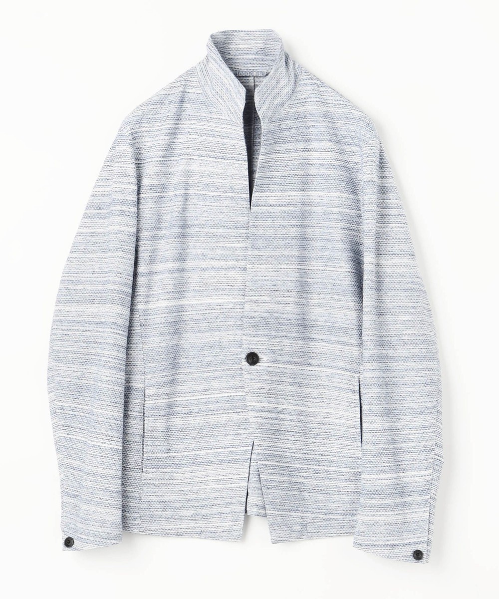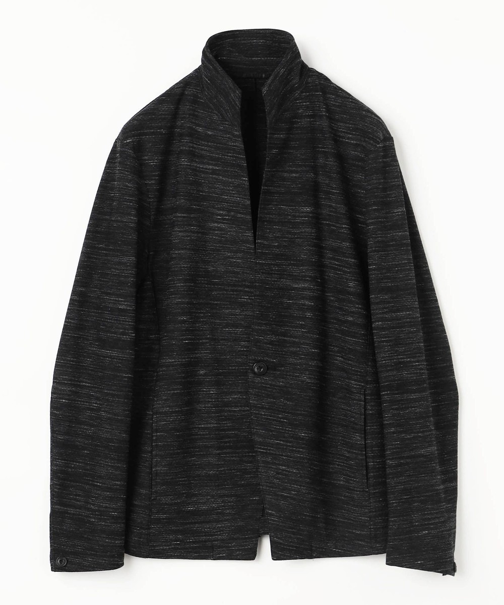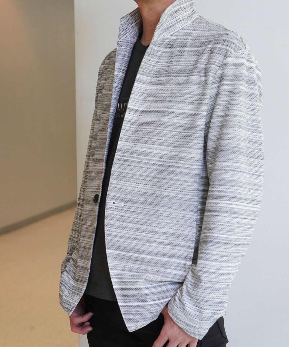 衿からフロントカットは直線的なエッジを効かせたスタンドカラージャケットとなります。